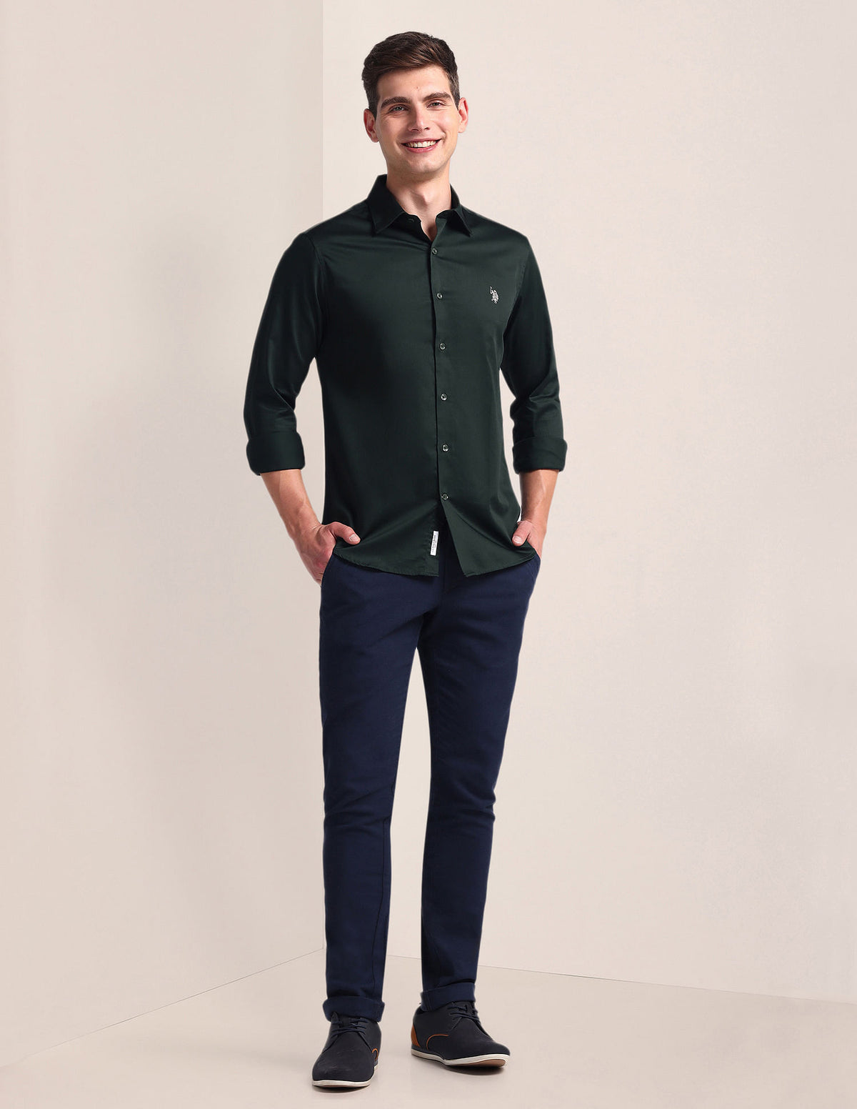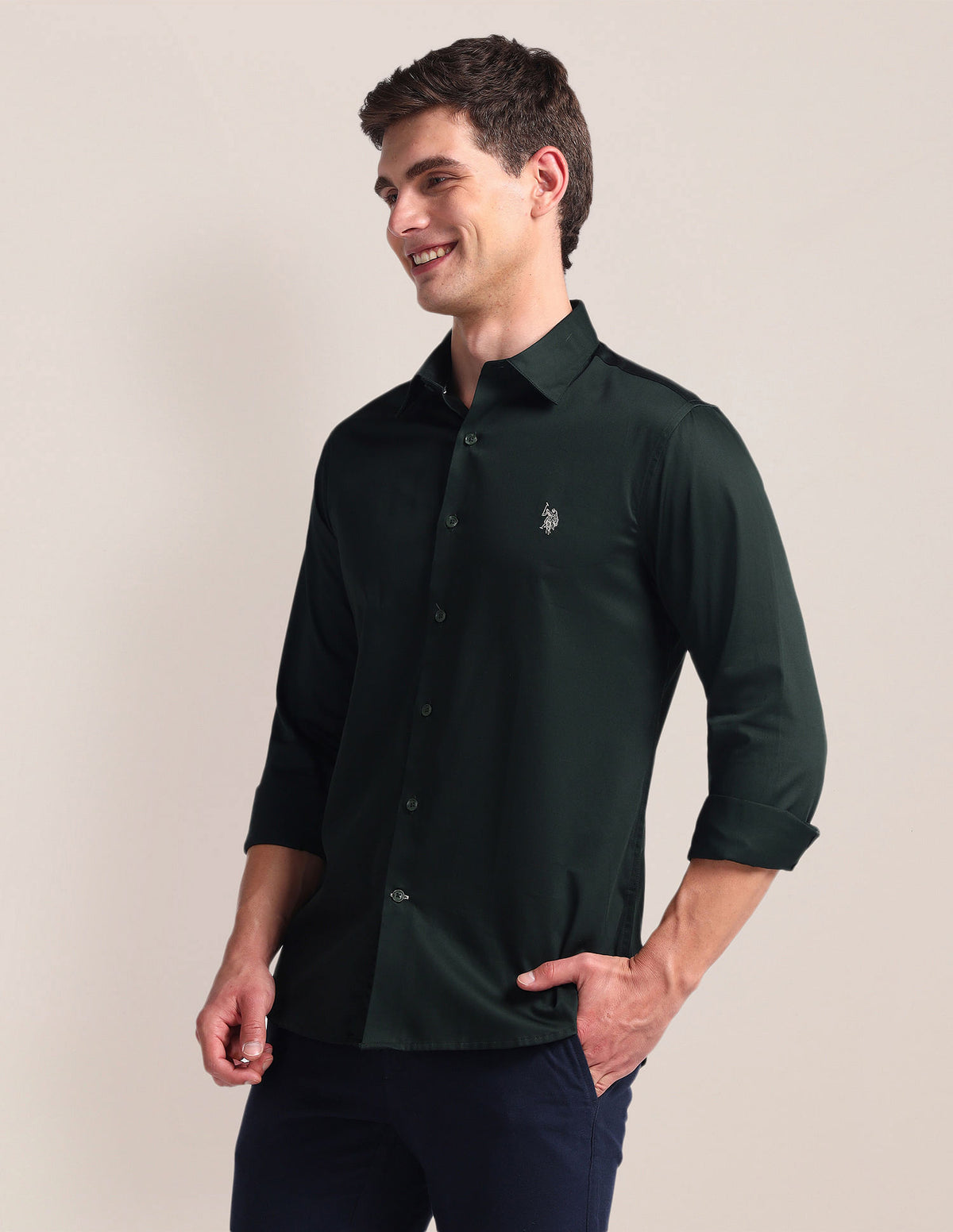 | Semi-cutaway collar | Logo at chest | French button placket | Long sleeves with rounded cuffs | Curved hemline | Solid pattern | Sateen weave | Brand fit: Tailored fit | Fit mapping: Regular fit | Country Of Origin - India| AW-24