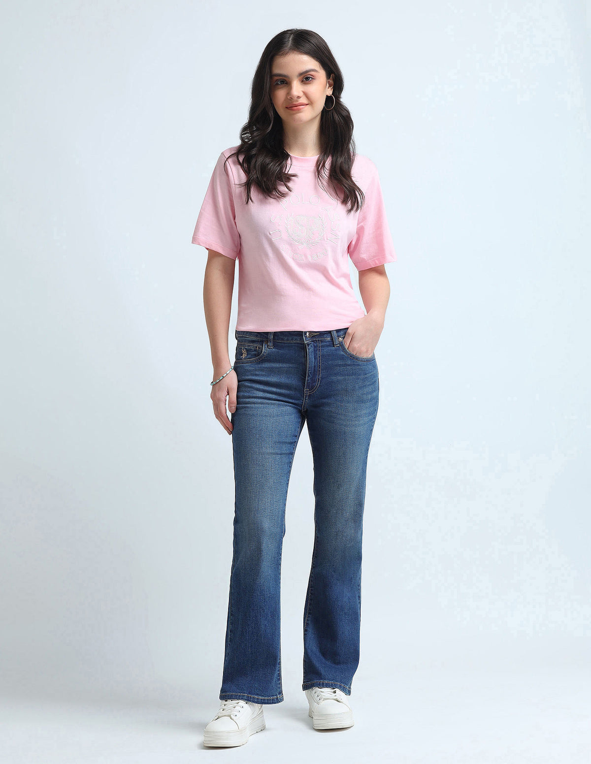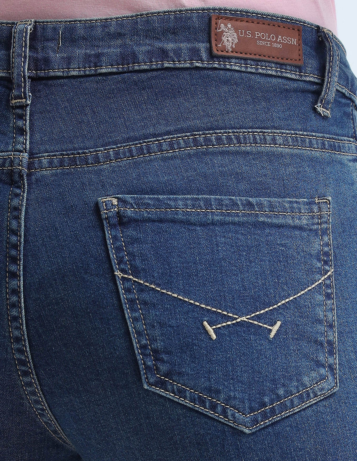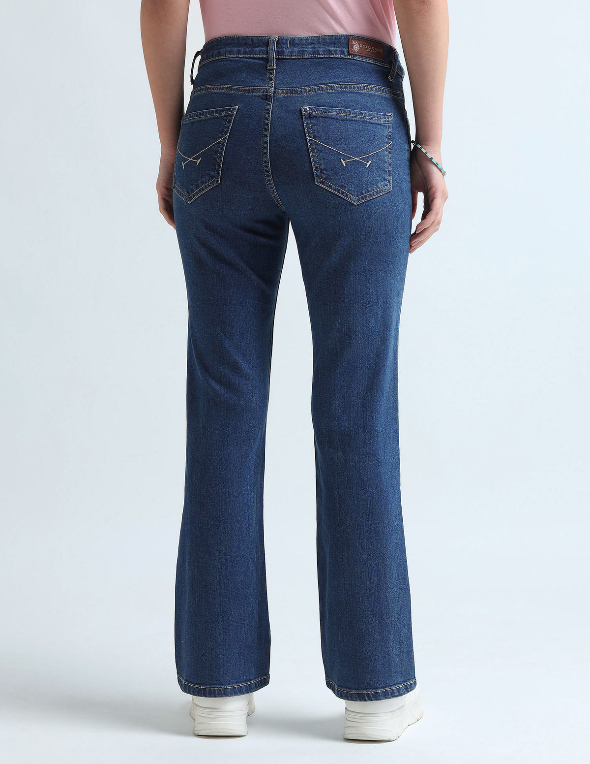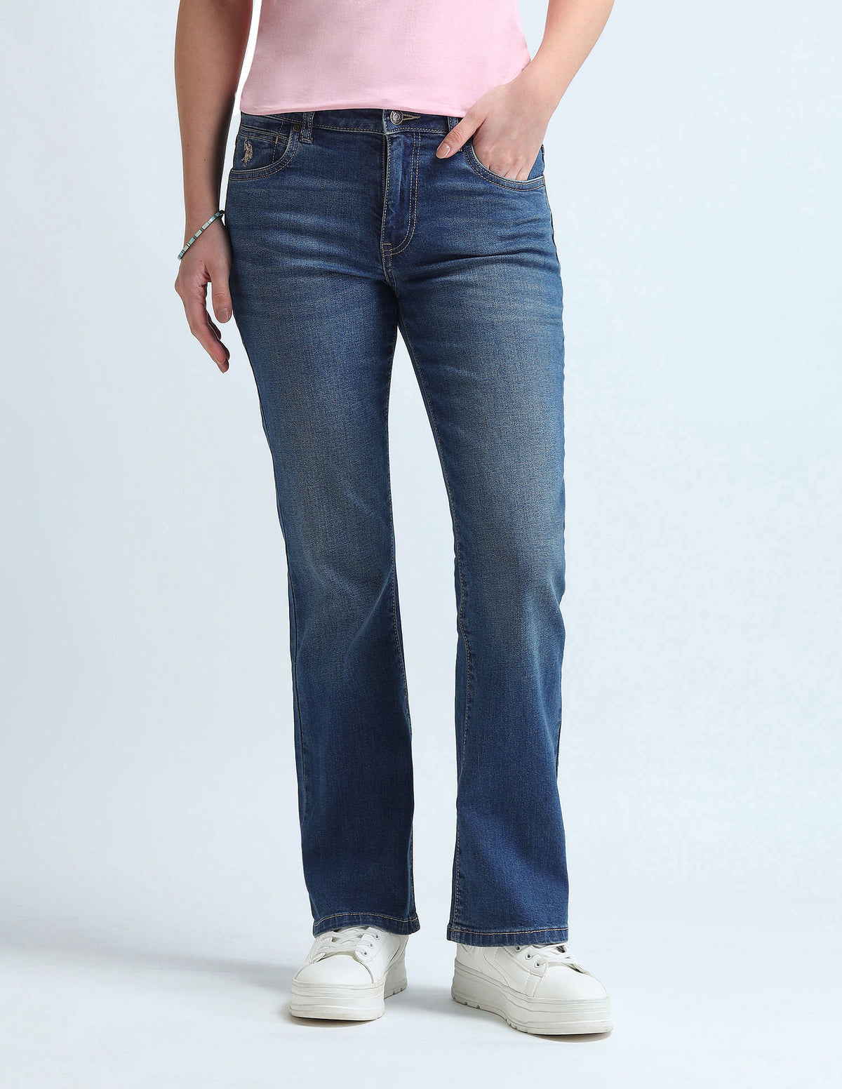 | Mid-rise | Button and zip fly closure | Five pockets | Stonewashed | Denim weave | Skinny bootcut fit | Country Of Origin - India
