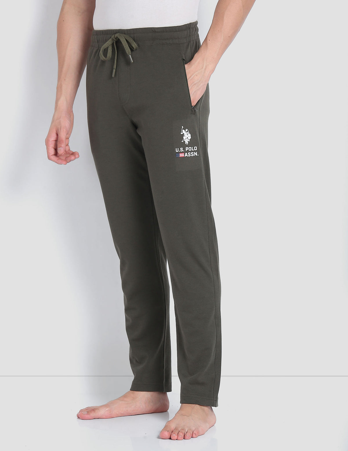 - Solid pattern with bold contrast branding on left leg