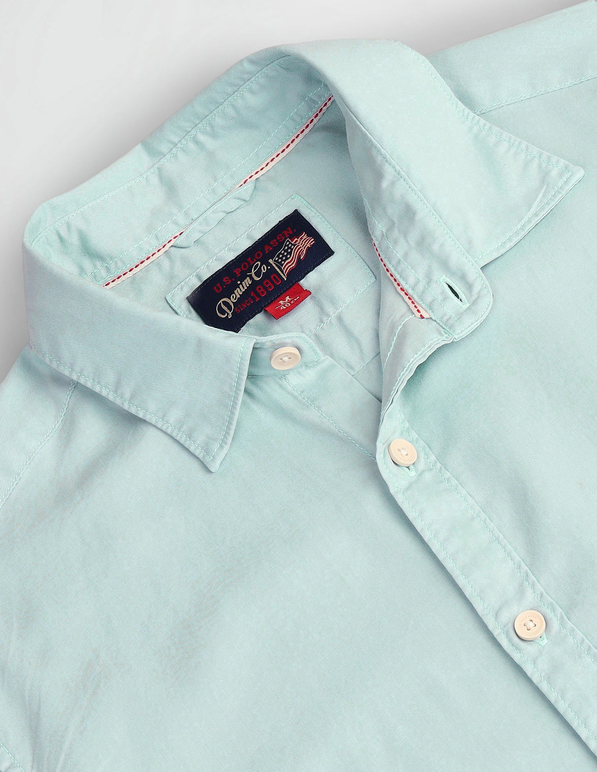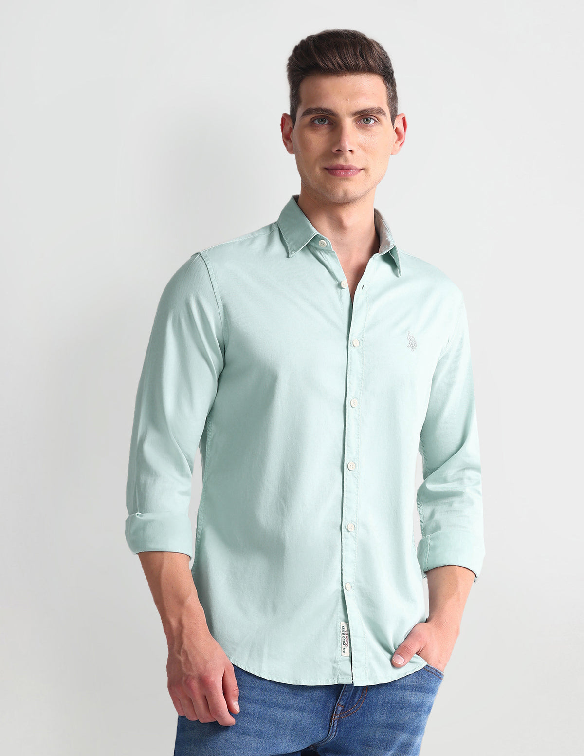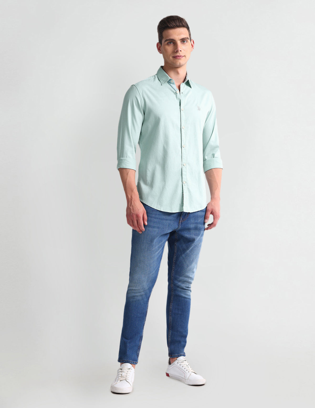 | Spread collar | Logo at chest | Full button placket | Long sleeves with rounded cuffs | Curved hemline | Solid pattern | Twill weave | Slim fit | Country Of Origin - India- New Season - Summer Heroes