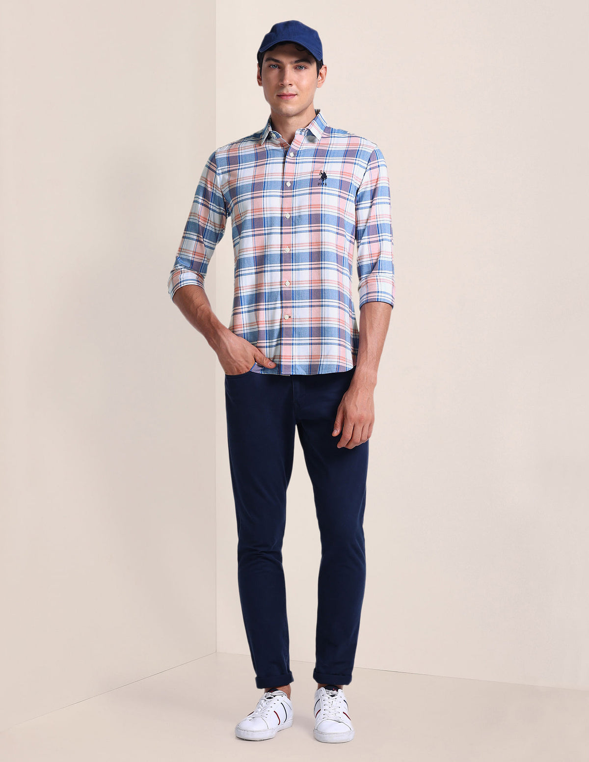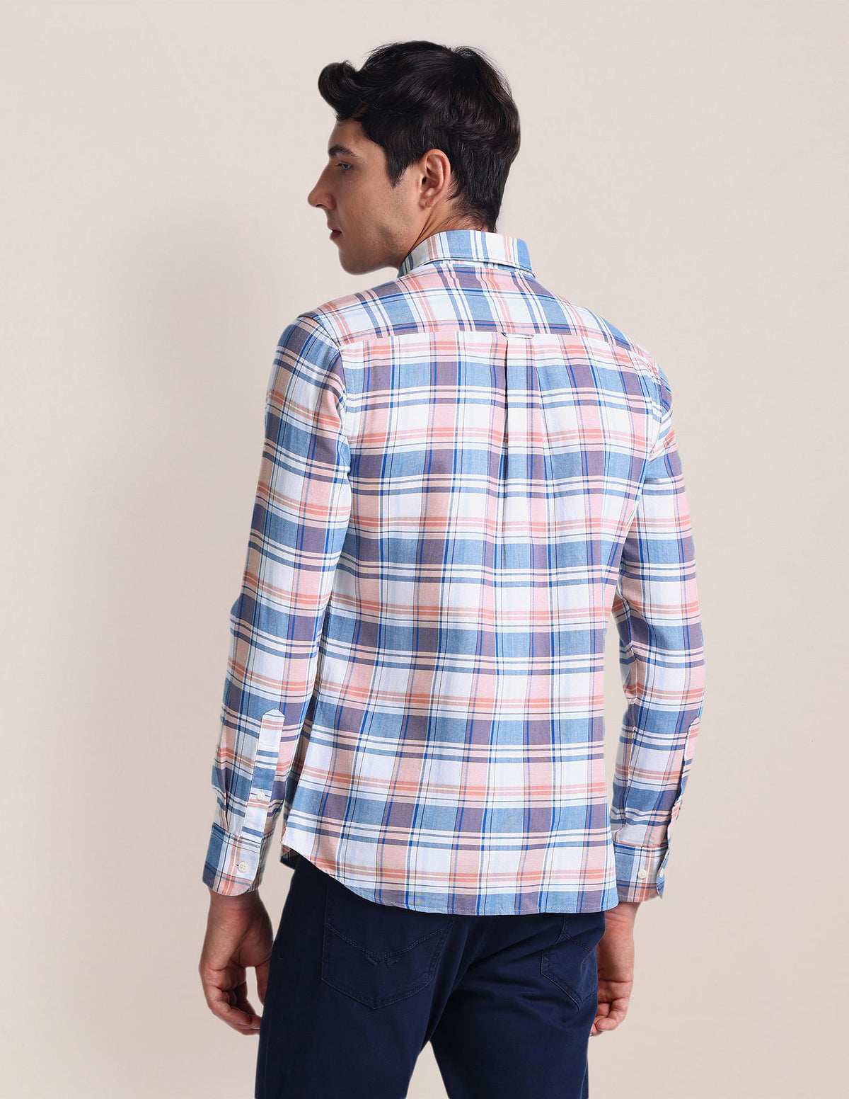 | Spread collar | Logo at chest | Full button placket | Long sleeves with rounded cuffs | Curved hemline | Tartan checked pattern | Oxford weave | Brand fit: Tailored fit | Fit mapping: Regular fit | Country Of Origin - India