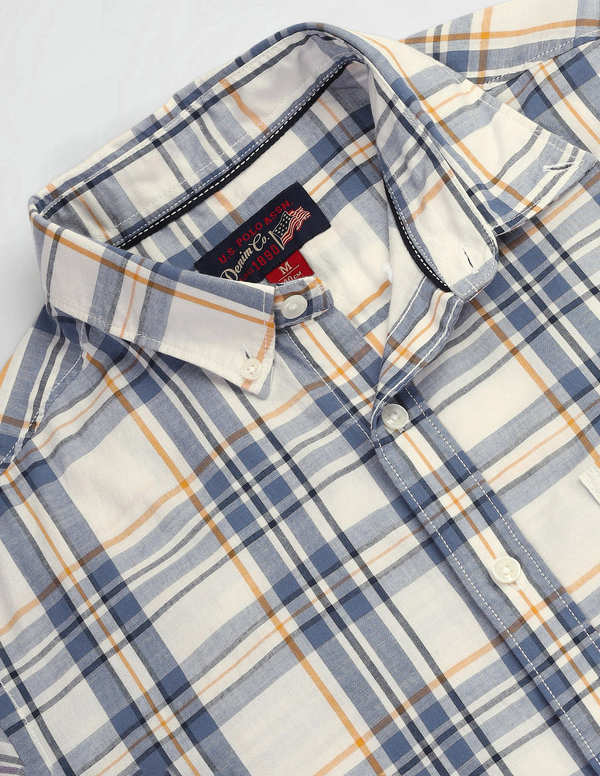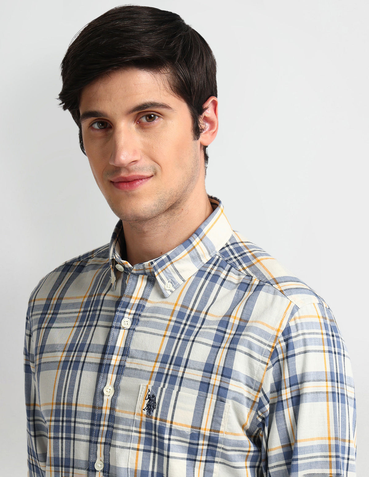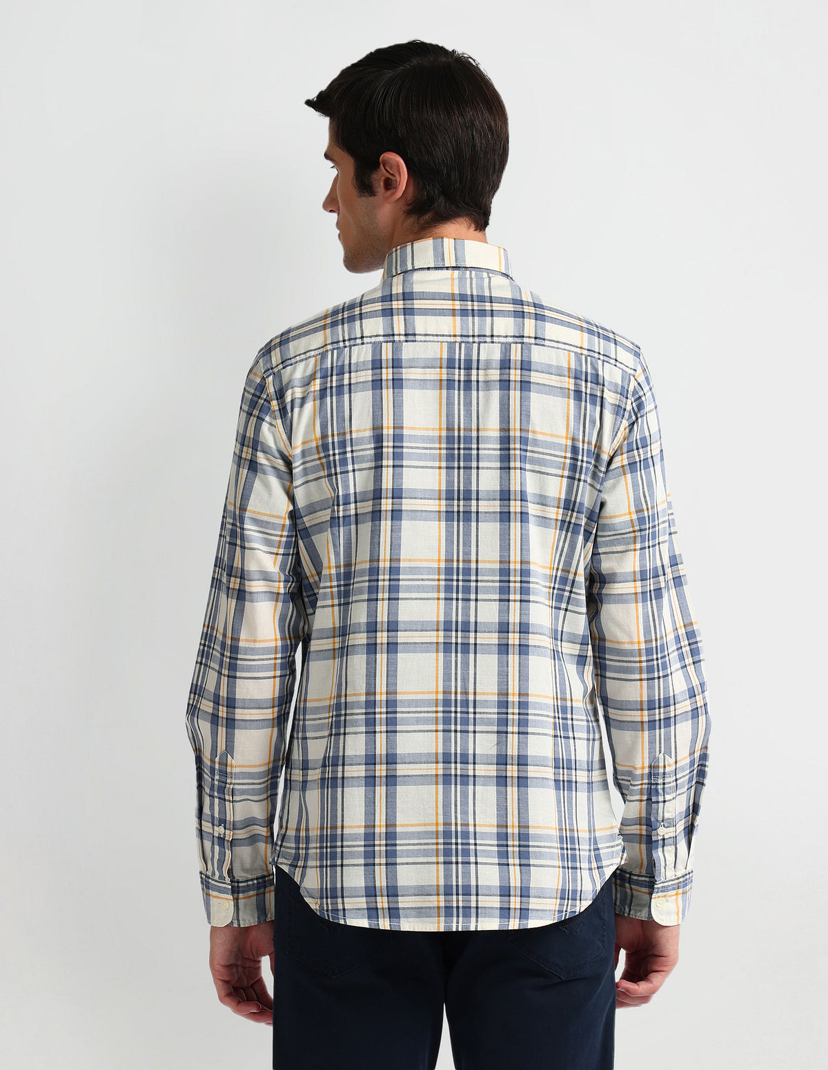 | Button-down collar | Chest patch pocket | Full button placket | Long sleeves with rounded cuffs | Curved hemline | Tartan checked pattern | Twill weave | Slim fit | Country Of Origin - India- New Season - Summer Heroes
