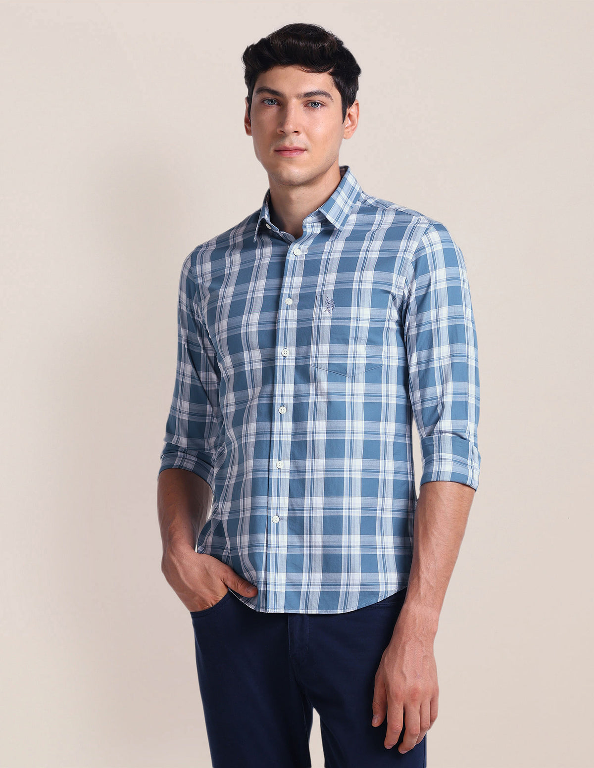 | Spread collar | Chest patch pocket | Full button placket | Long sleeves with rounded cuffs | Curved hemline | Tartan checked pattern | Twill weave | Brand fit: Tailored fit | Fit mapping: Regular fit | Country Of Origin - India
