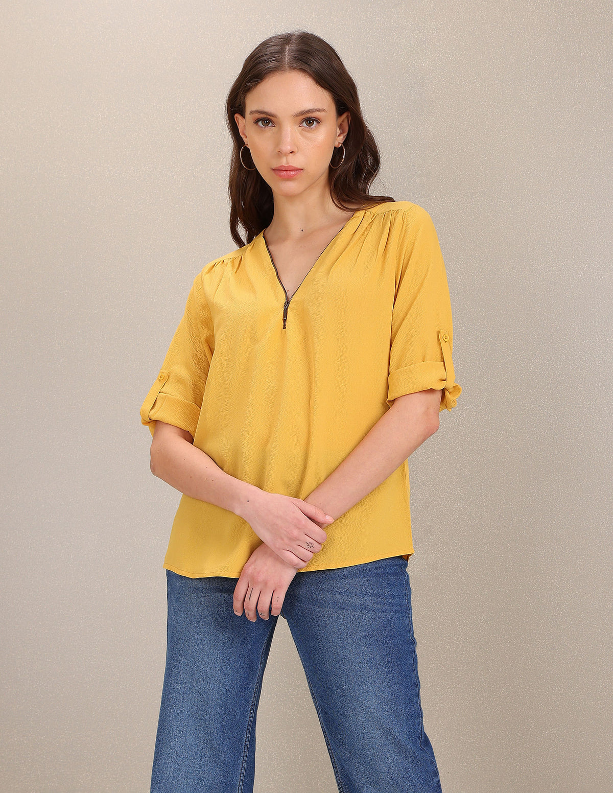 - Three-quarter sleeves with convertible cuffs