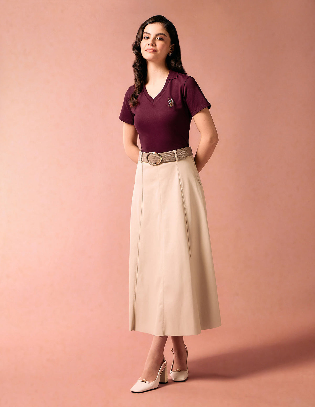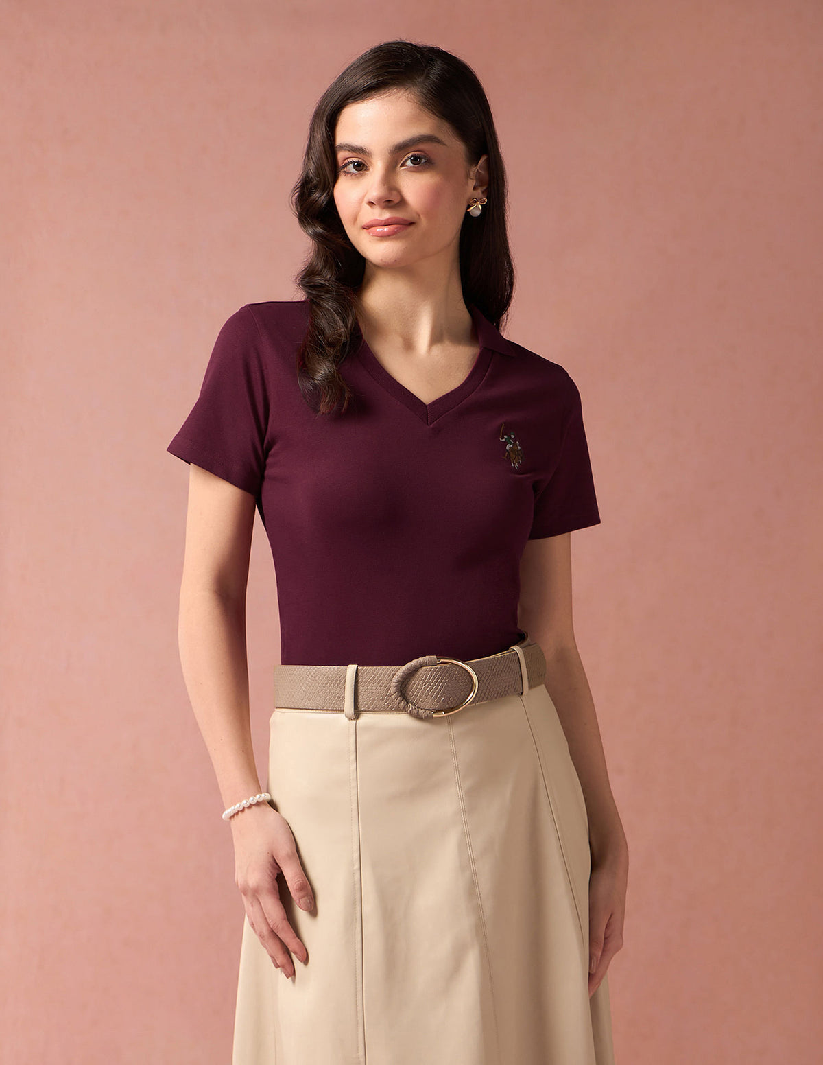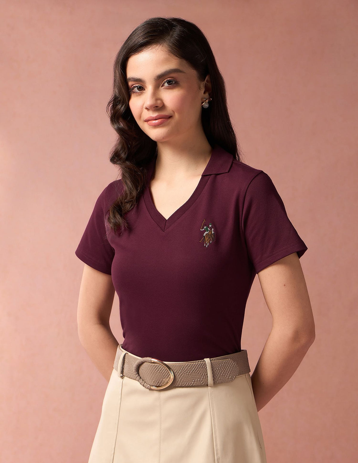 | V-neck | Polo collar | Logo at chest | Short sleeves | Straight hemline | Solid pattern | Pique knit | Regular fit | Country Of Origin - India