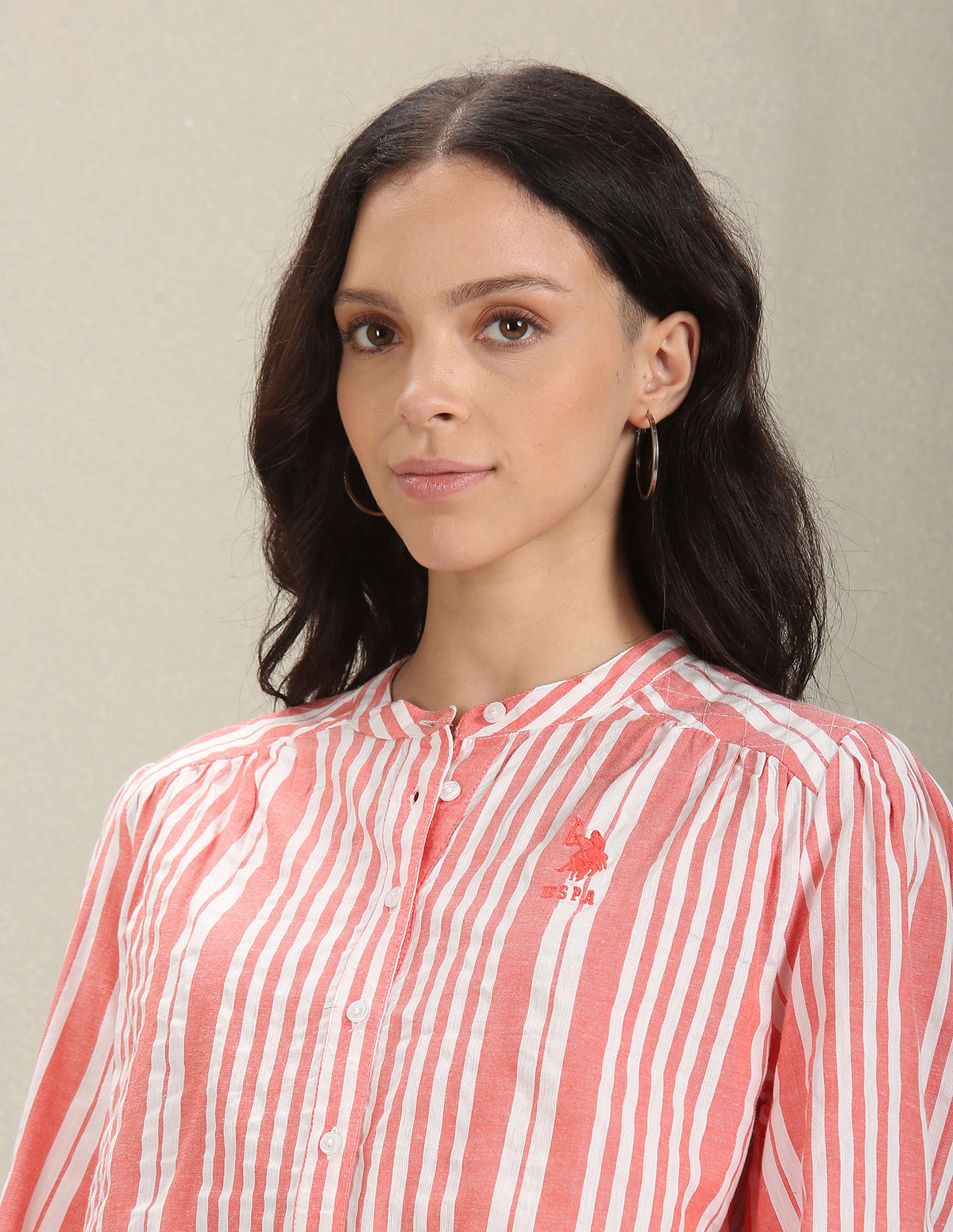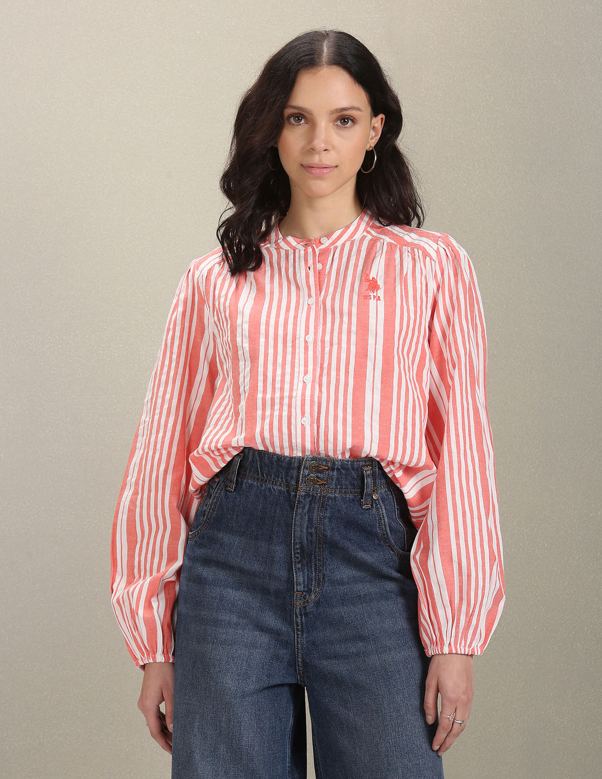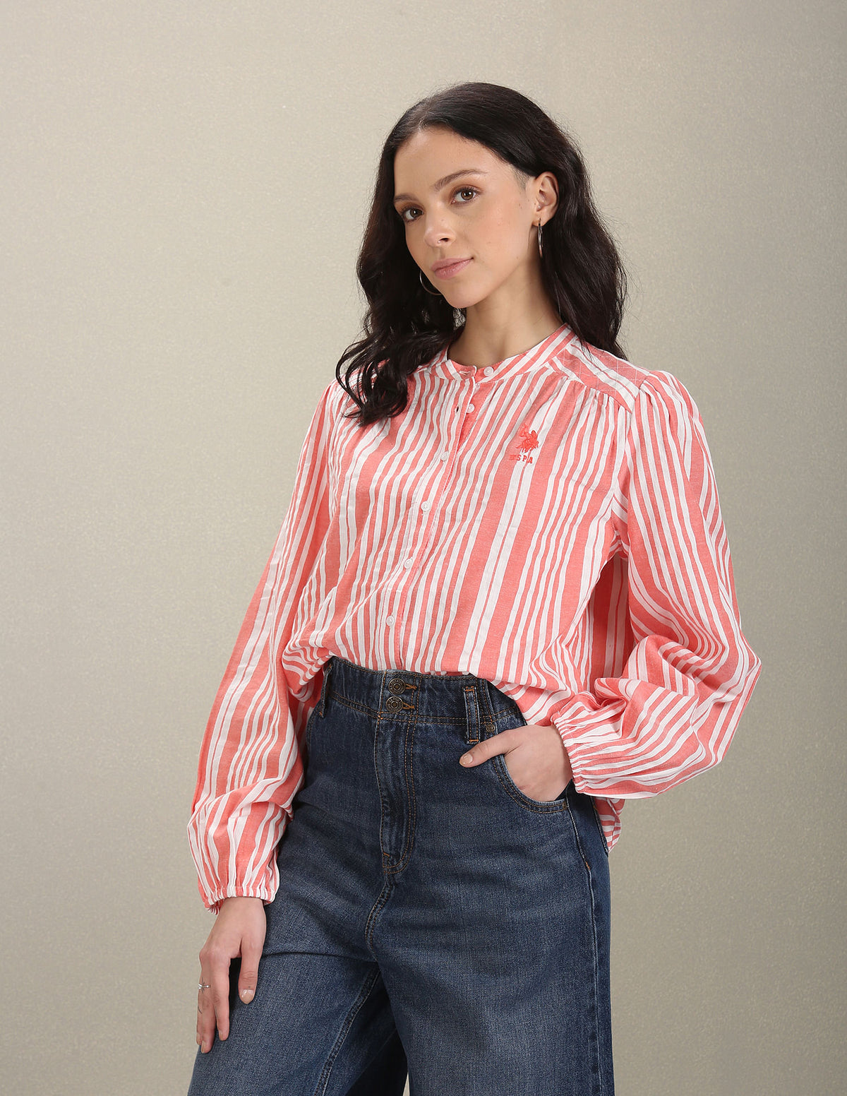 Story: This long-sleeve shirt is accented with a mandarin neck, curved hemline and striped pattern.