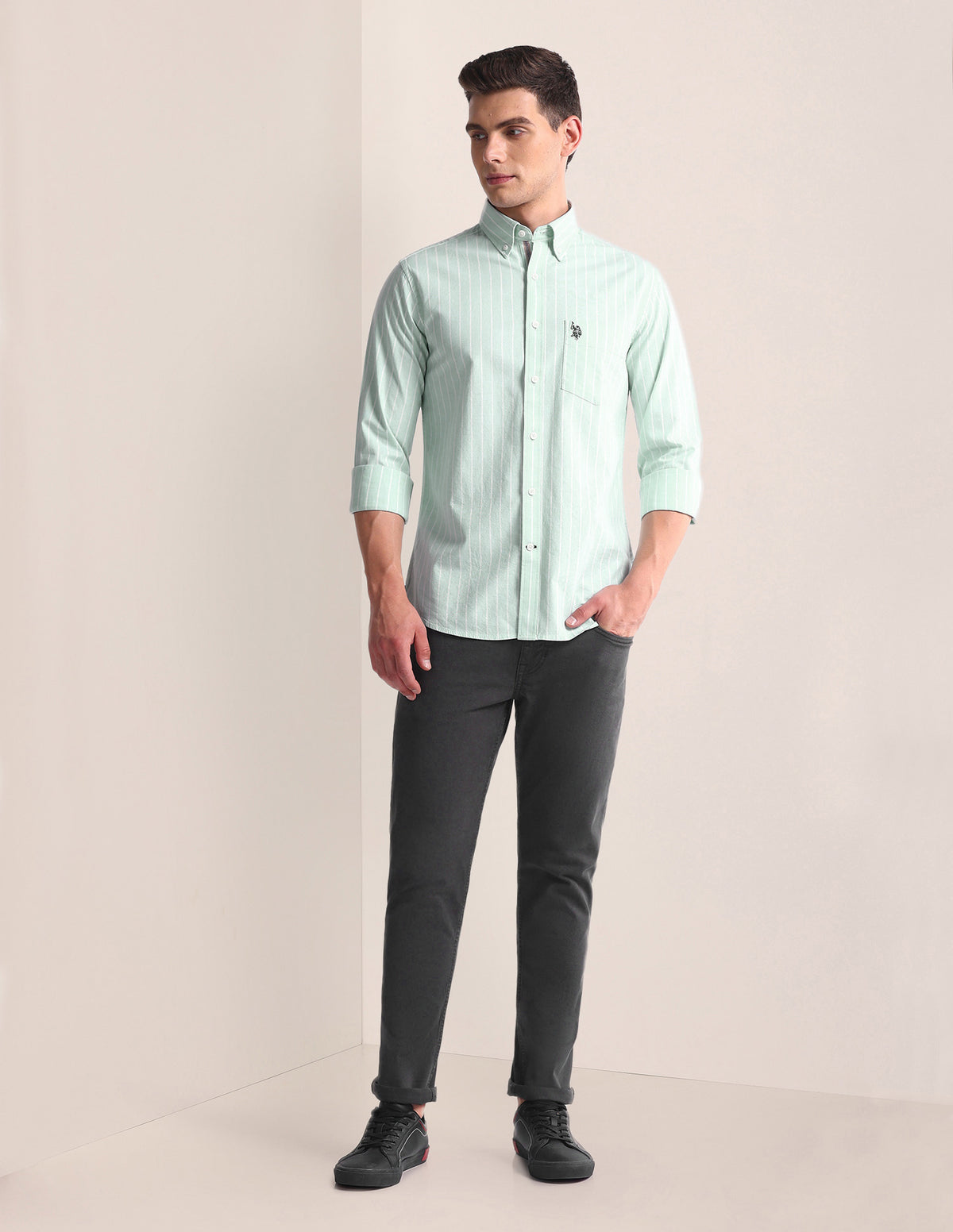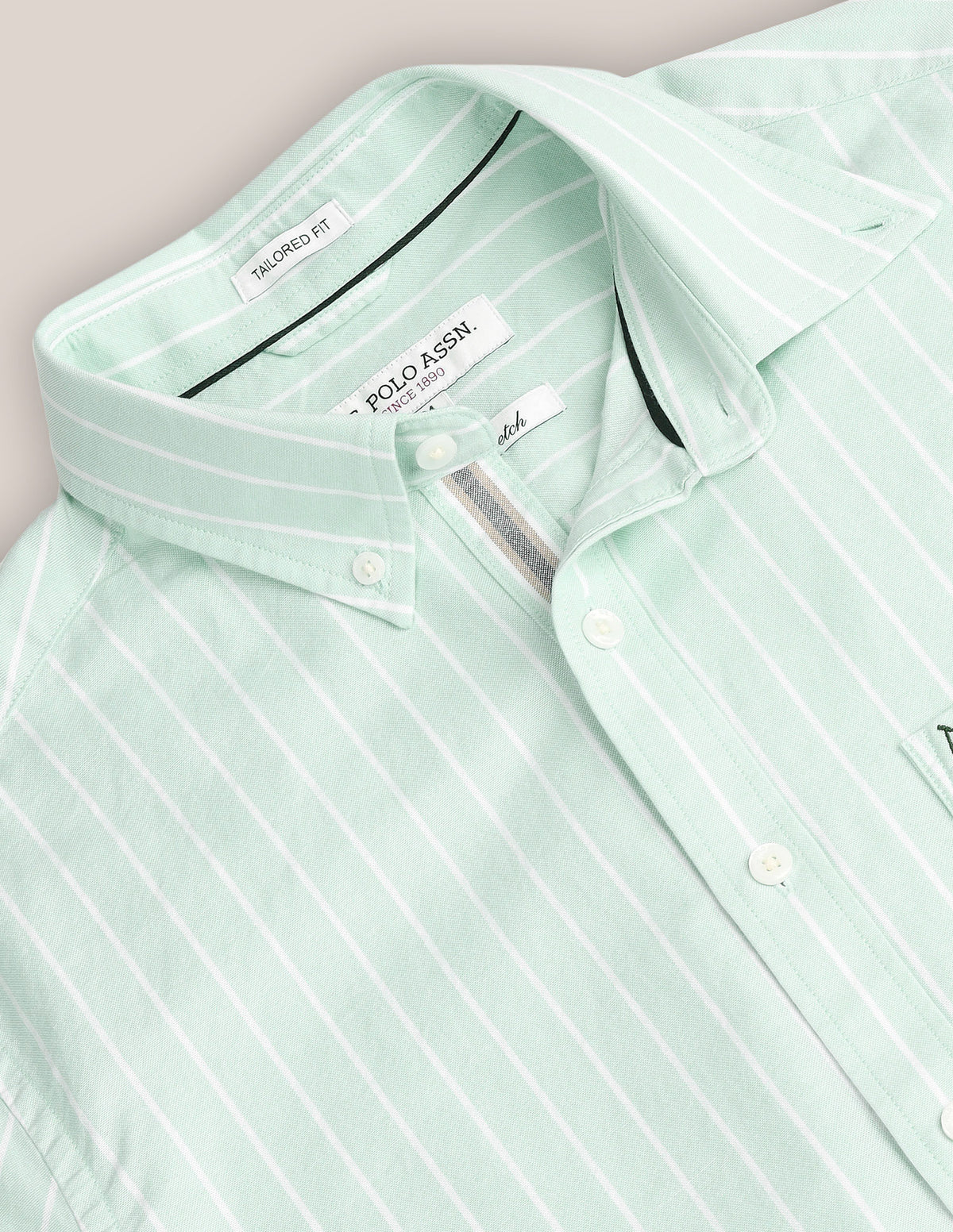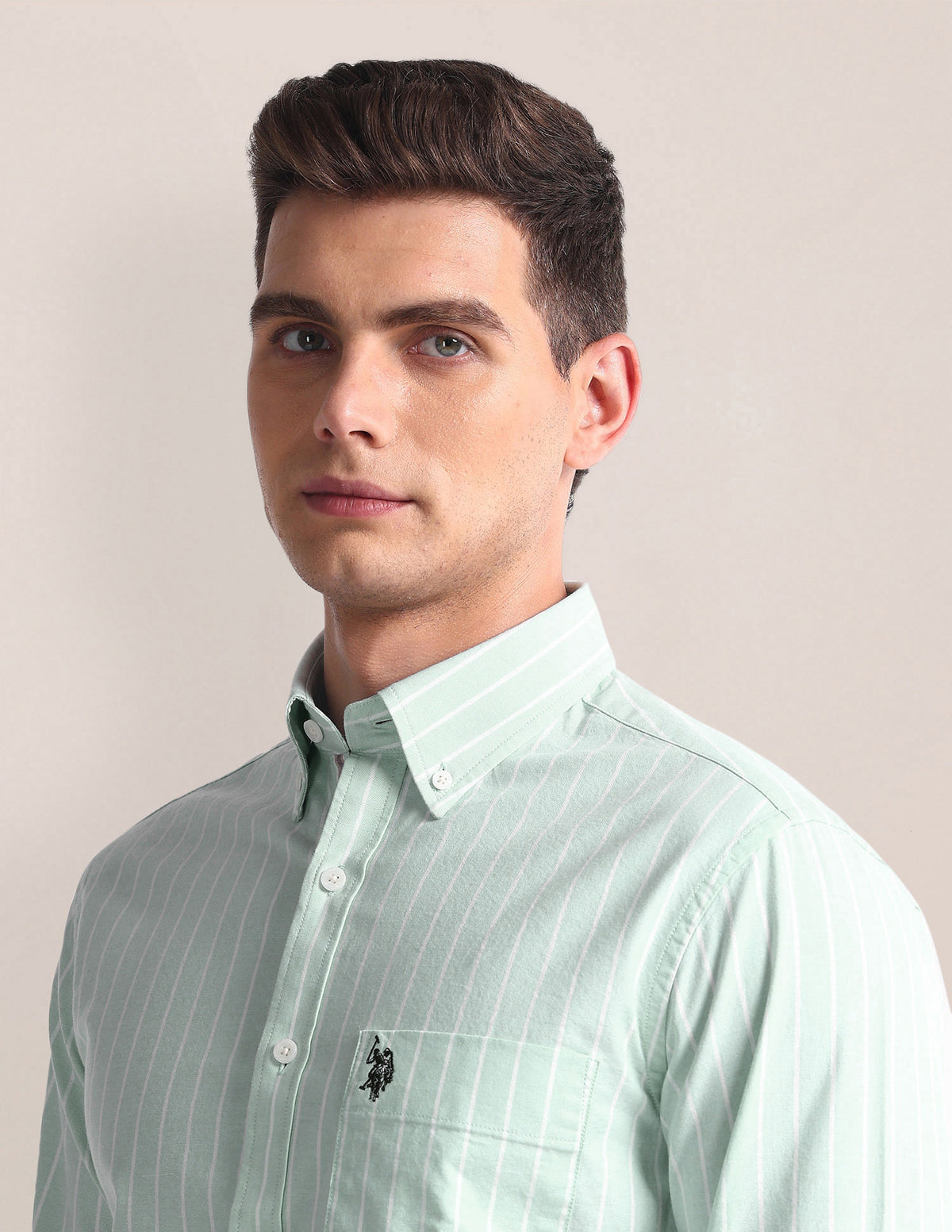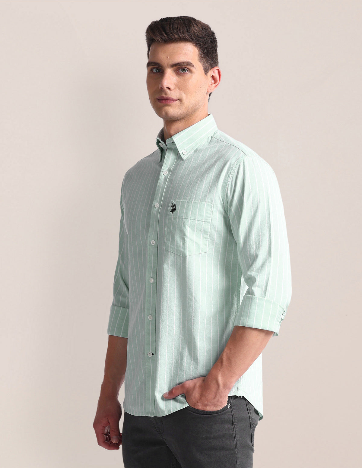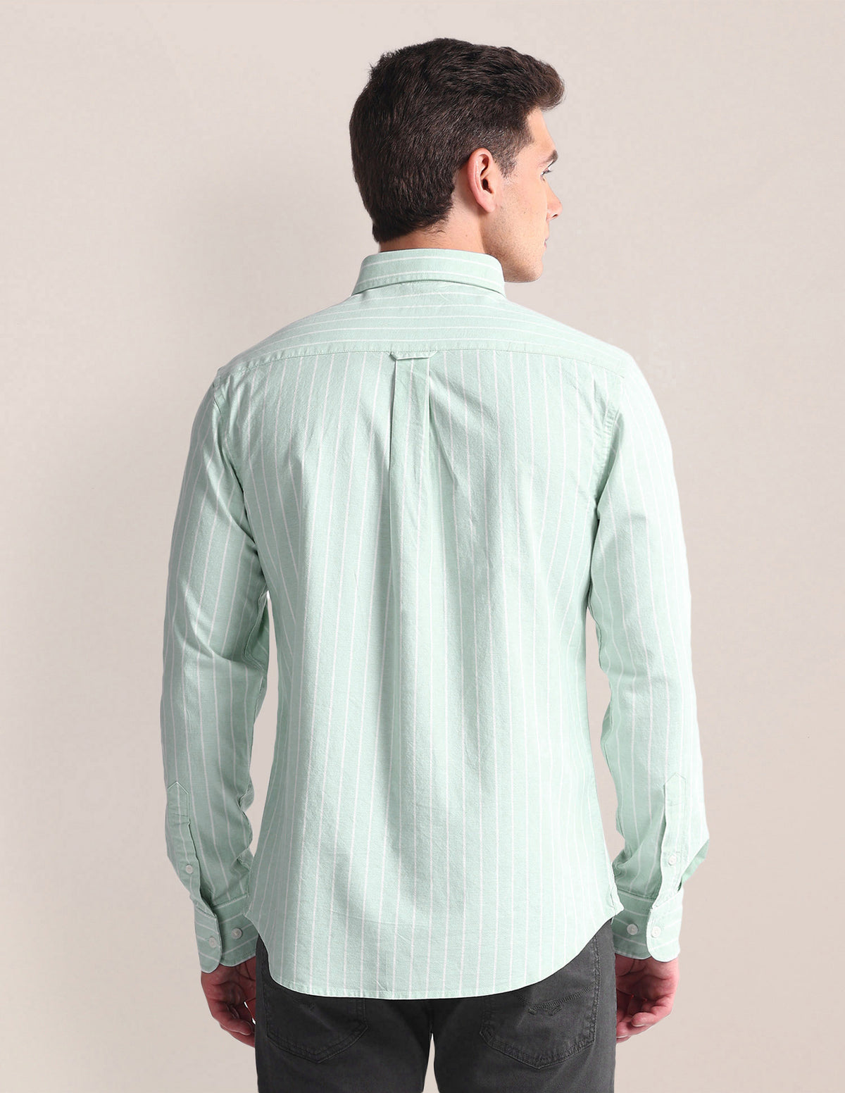 | Button-down collar | Chest patch pocket | Full button placket | Long sleeves with rounded cuffs | Curved hem | Vertical striped pattern | Dobby weave | Brand fit: Tailored fit | Fit Mapping: Regular fit | Country Of Origin - India- New Season