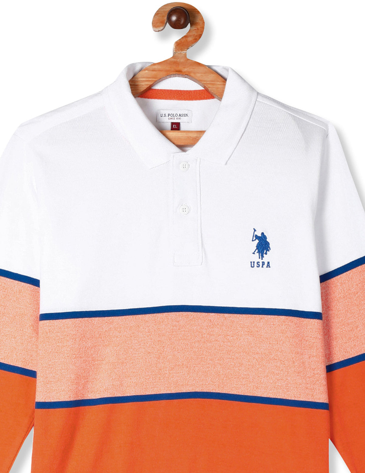 | Ribbed polo collar | Short button placket | Logo at chest | Long sleeves with ribbed hems | Uneven vented hem | Colour blocked and striped
