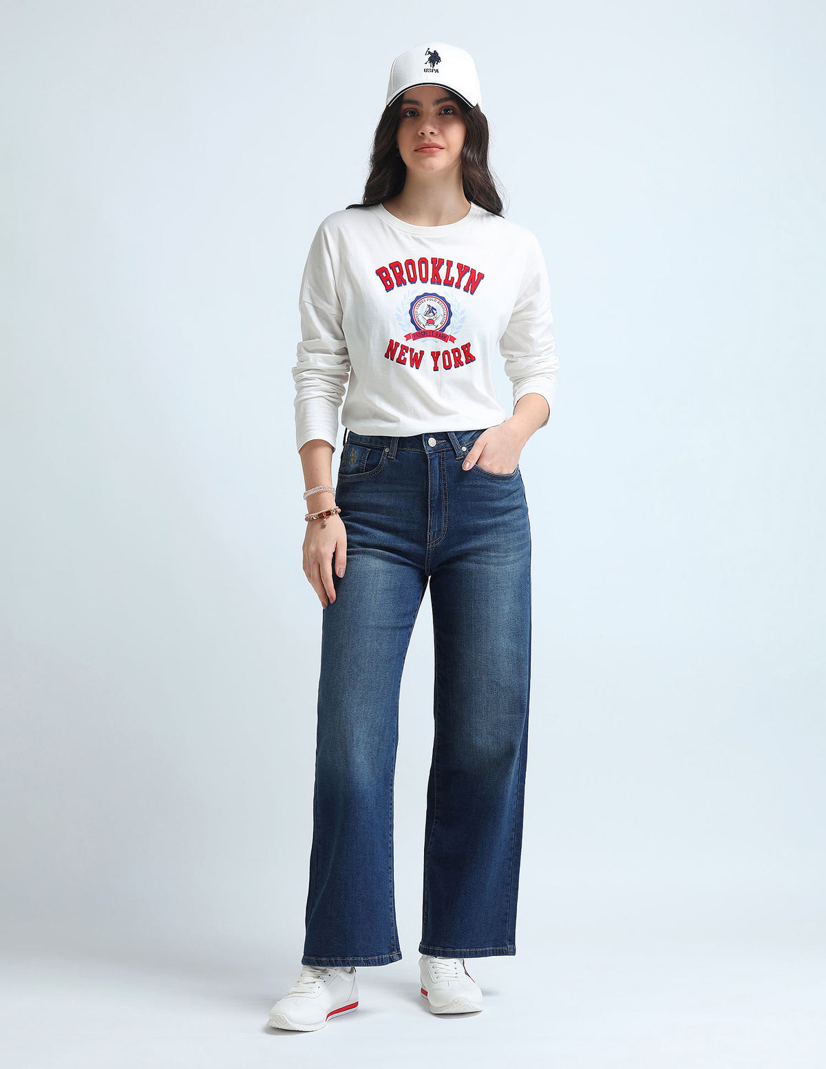 | High-rise | Button and zip fly closure | Five pockets | Stonewashed | Denim weave | Wide leg fit | Country Of Origin - India
