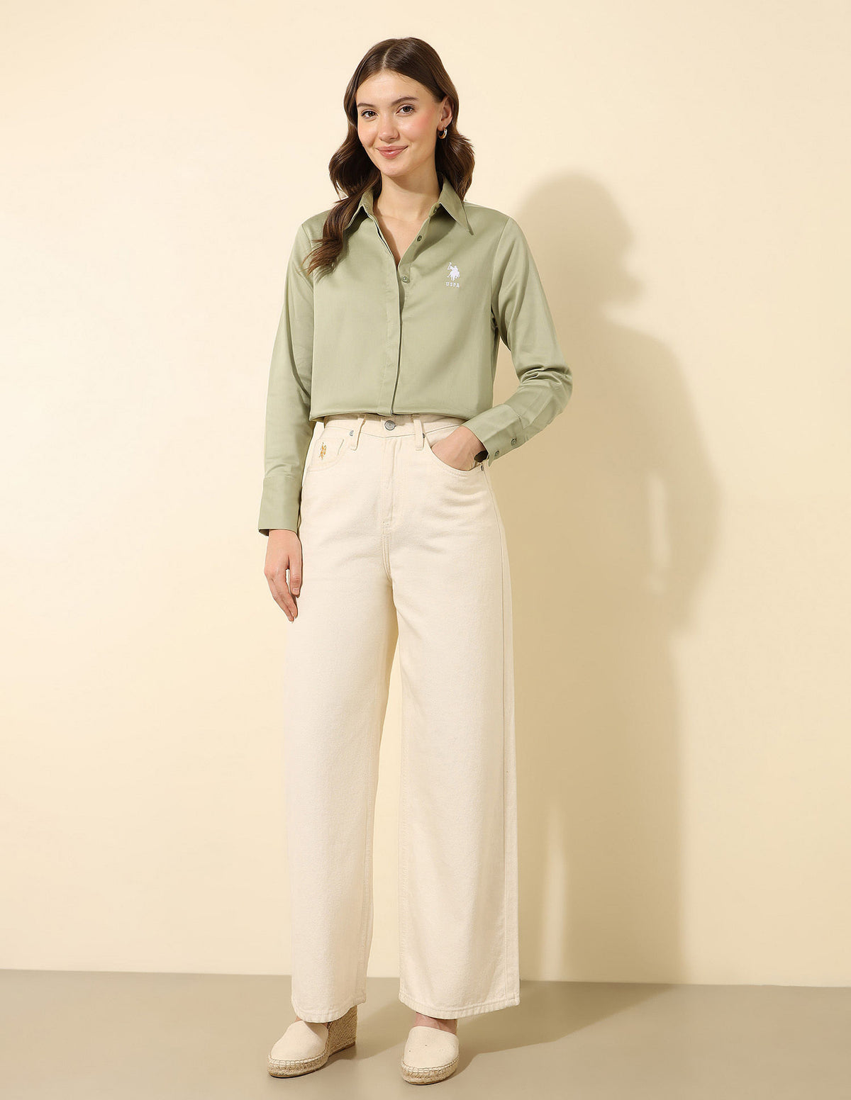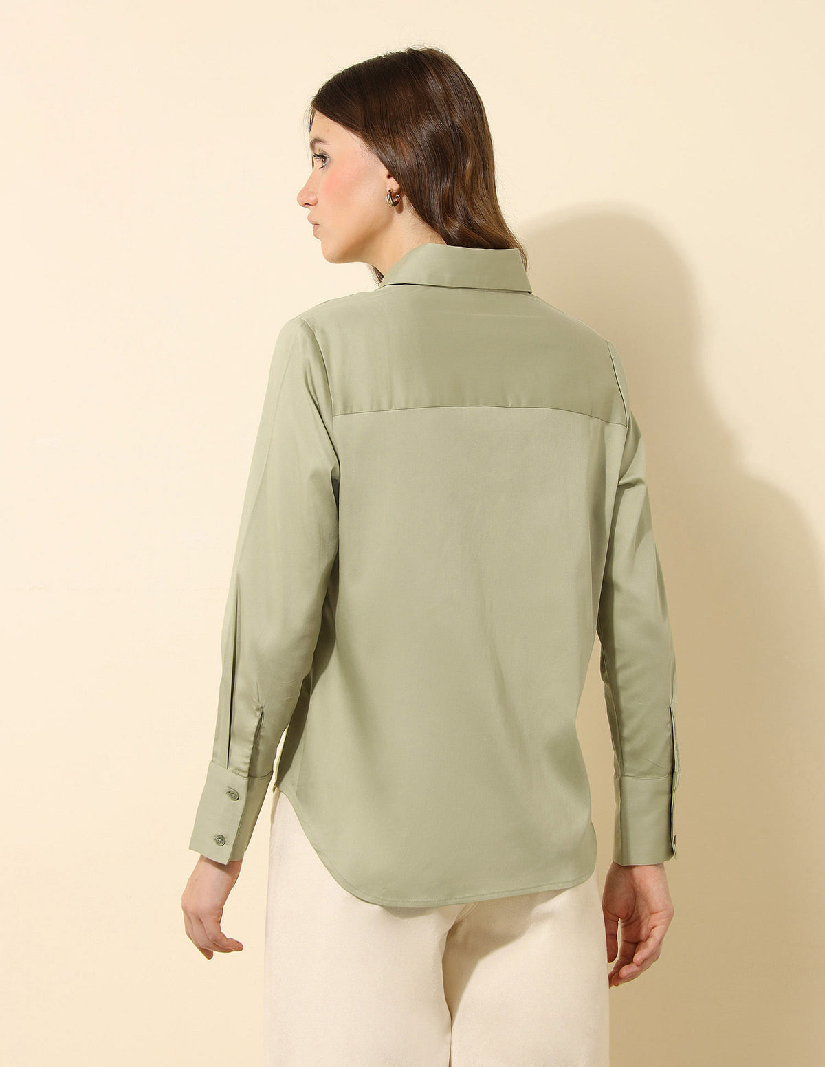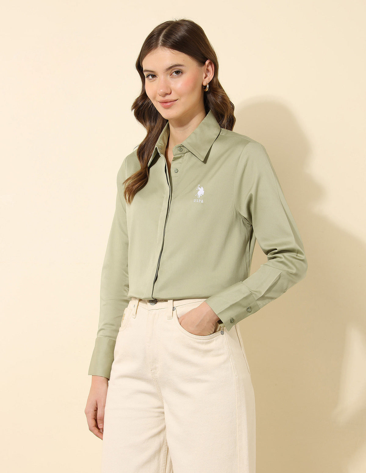 | Spread collar | Logo at chest | Full concealed button placket | Long sleeves with barrel cuffs | Curved hemline | Solid pattern | Satin weave | Regular fit |