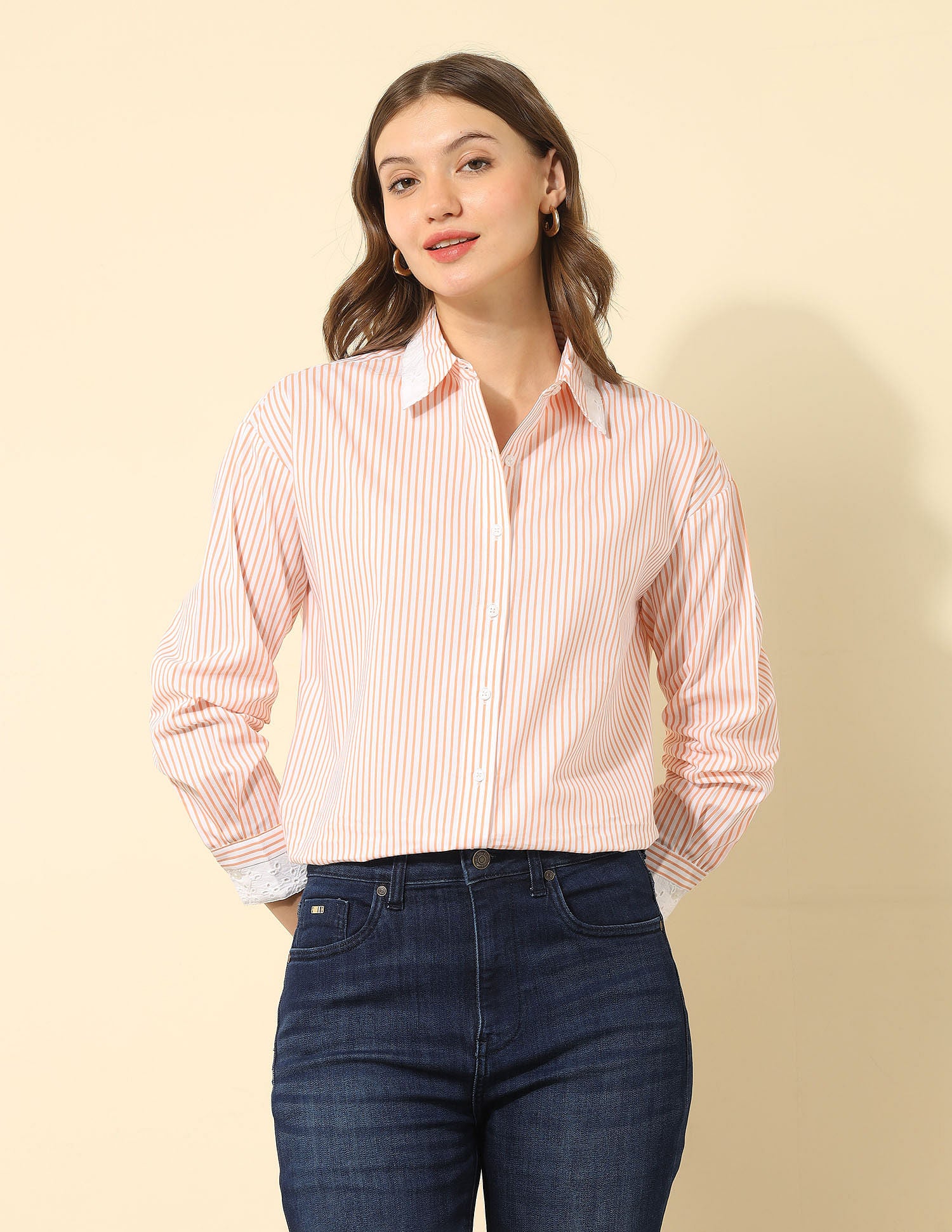 | Spread collar | Logo at chest | Full button placket | Long sleeves with barrel cuffs | Curved hemline | Vertical striped pattern | Dobby weave | Regular fit |