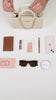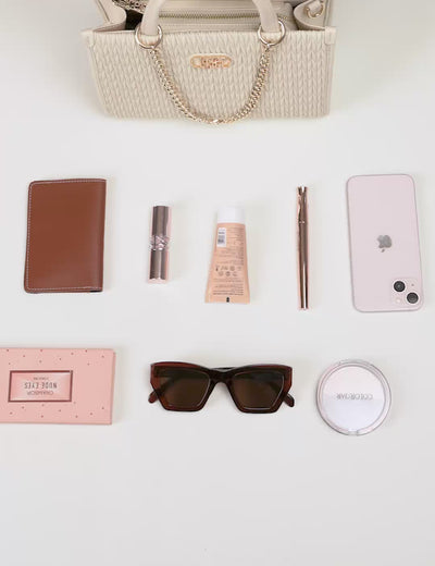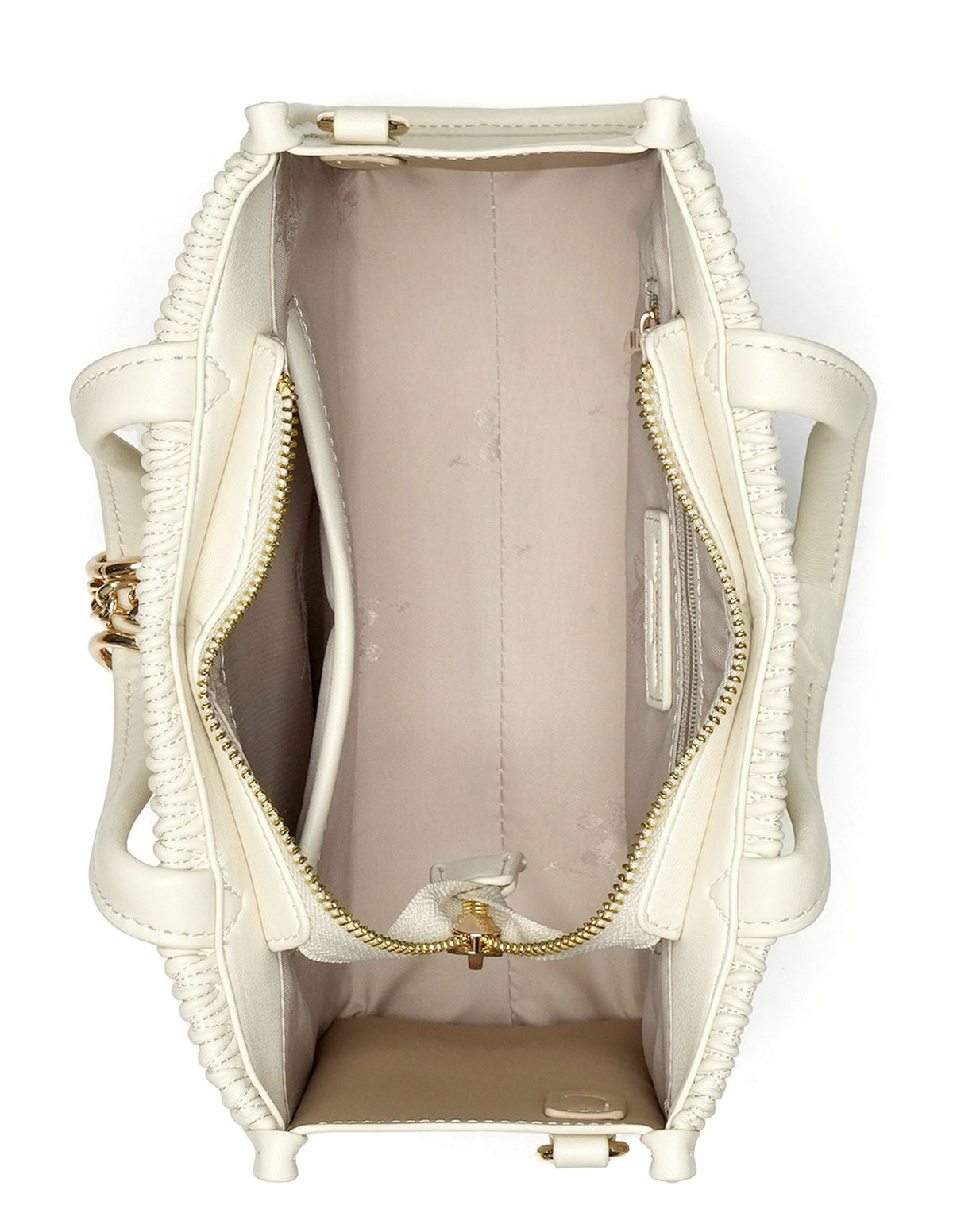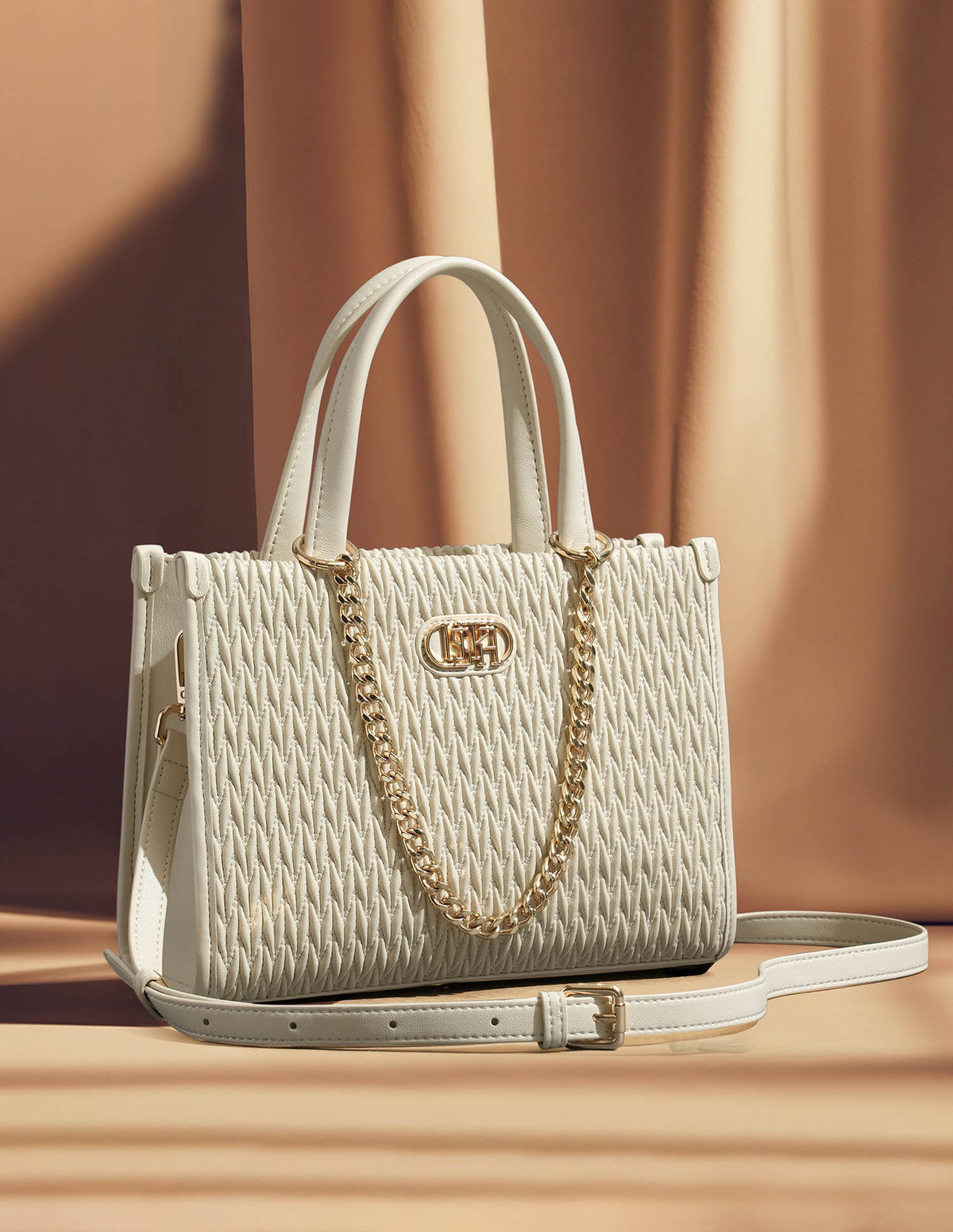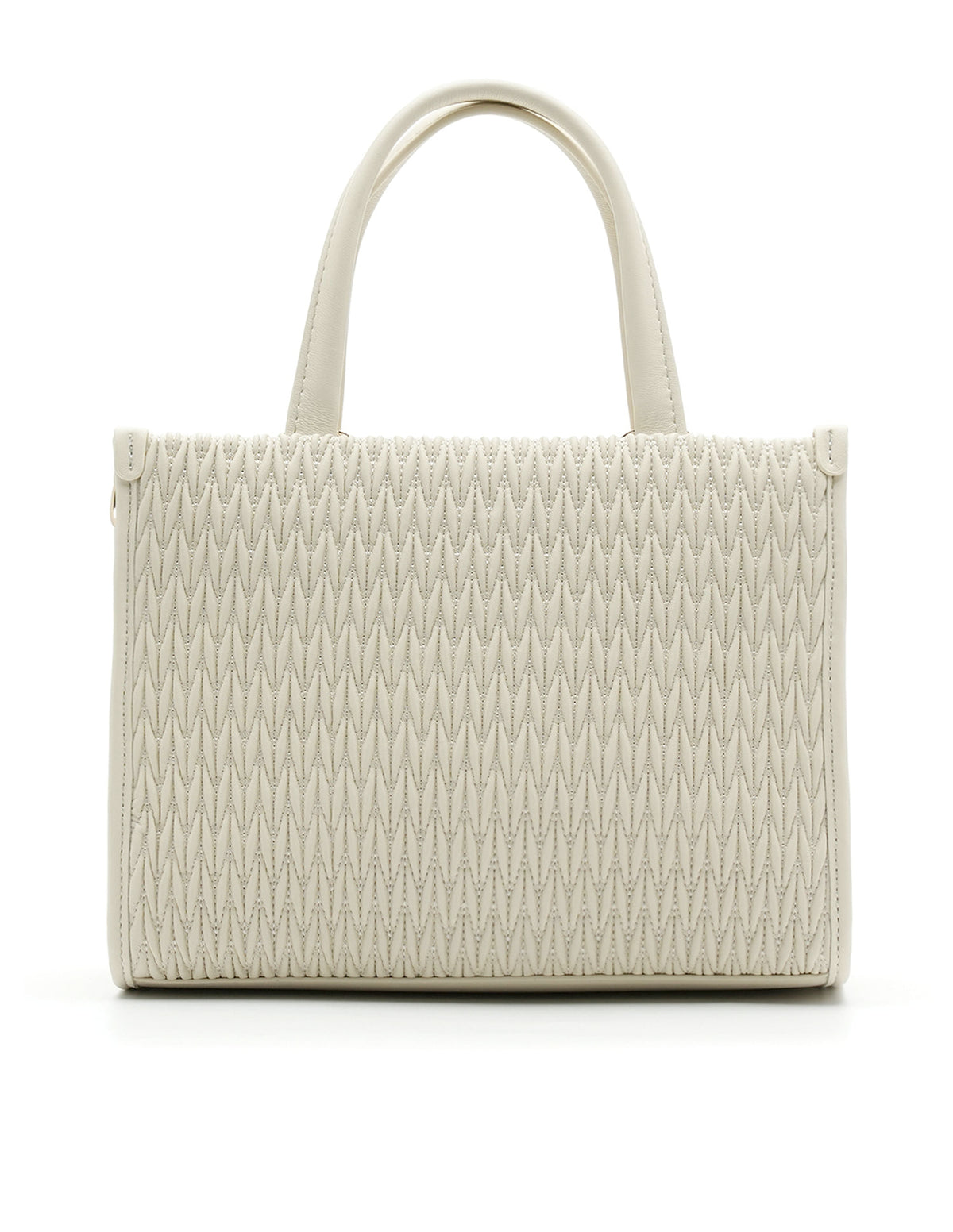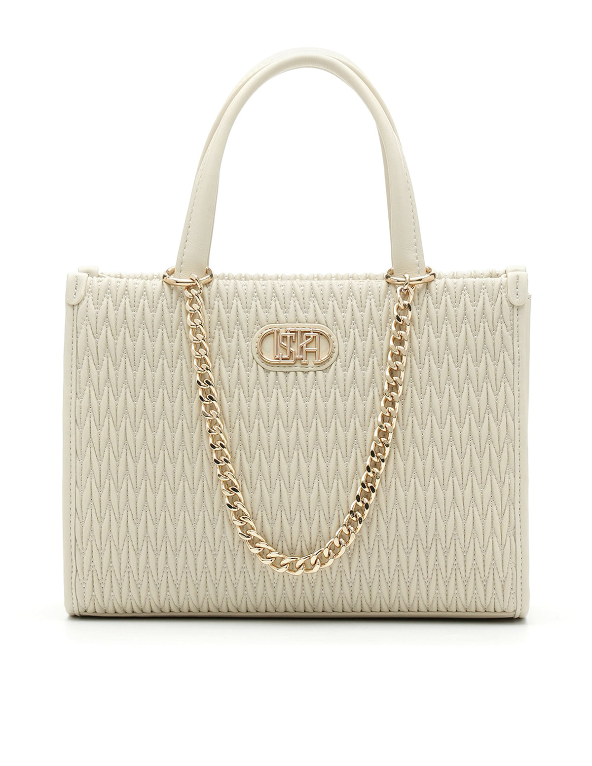 | Top handles | Metallic monogram accent at front | One main compartment with zipper closure | Textured pattern |