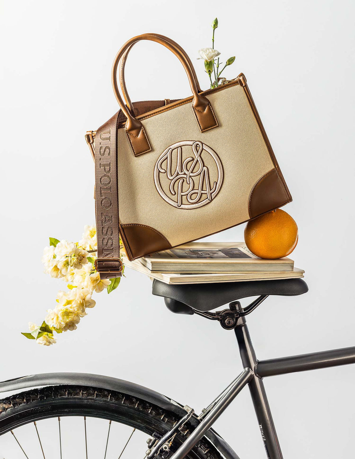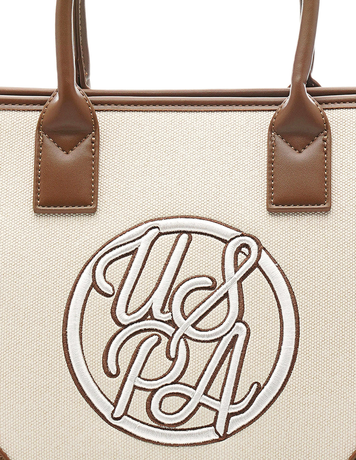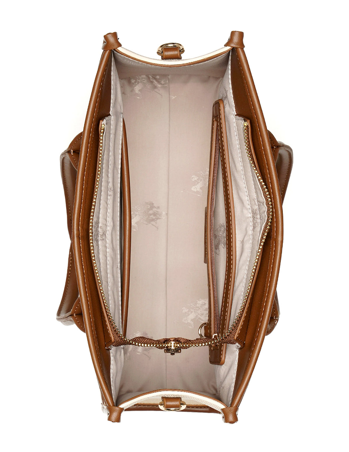 | Top handles | Metallic monogram accent at front | One main compartment with zipper closure | Brand embroidered pattern |