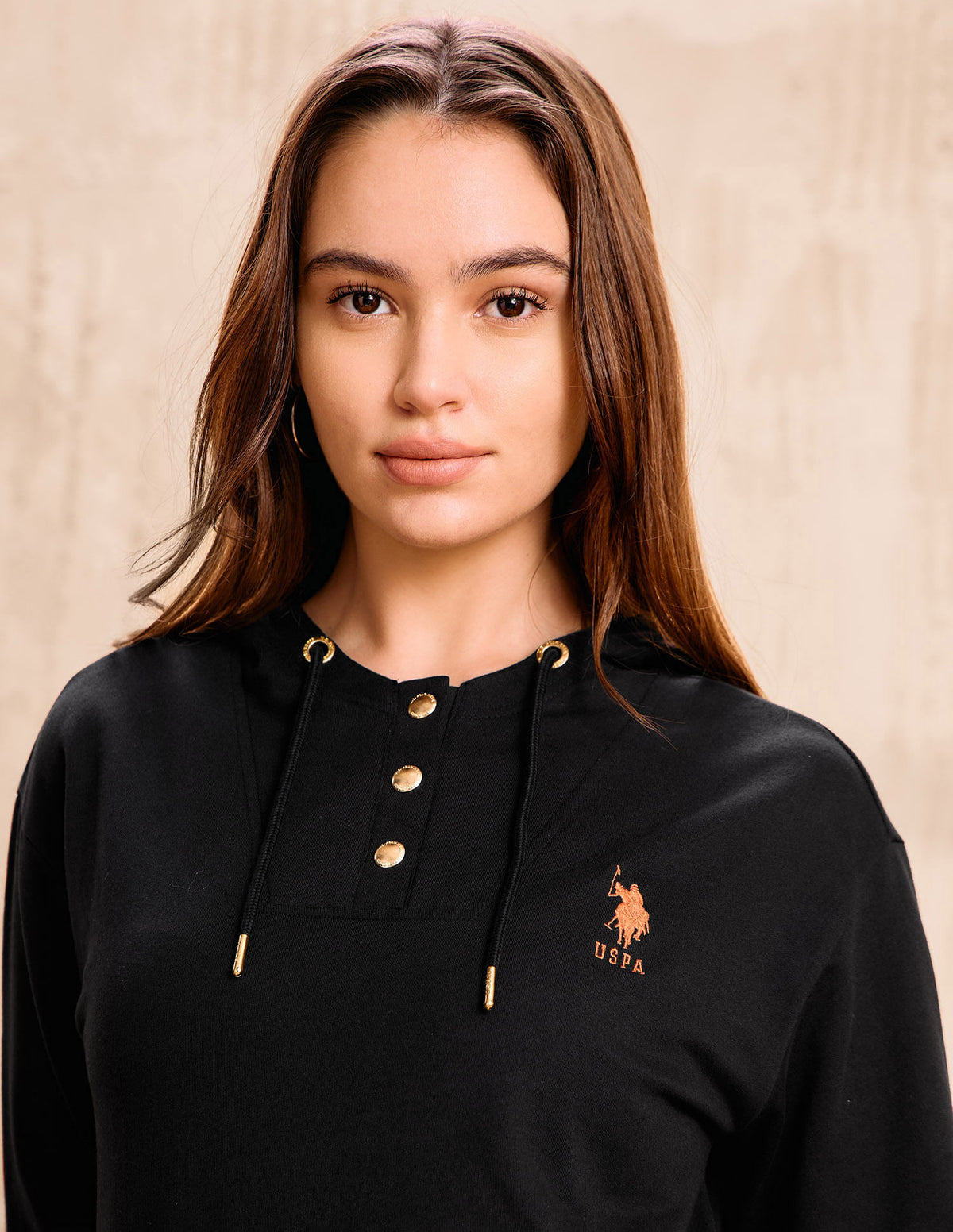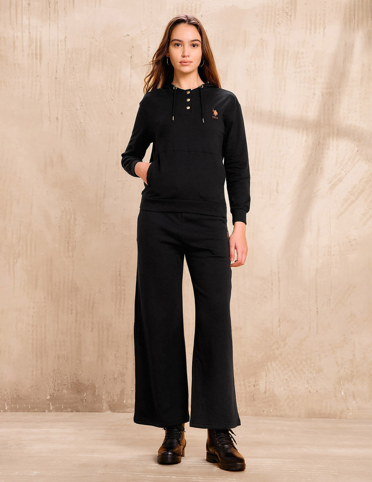 Story: Reimagining classic Western aesthetics, this group channels rugged looks with utilitarian details, energized by earthy colors. Drawing inspiration from nature’s ruggedness along with equestrian influences, it infuses a sense of adventure and functionality into the U.S. Polo Assn. brand. intermingle with textural fabrics to evoke the rugged beauty of the landscape. Integrating elements that evoke the sport of polo adds an athletic edge to the energetic charm, creating a dynamic fusion of style and performance. An ideal choice for the fashion-forward woman who appreciates both style and comfort. Brand appliqued patterned hooded sweater with button closure and kangaroo pocket—bold, cozy, and perfect for laid-back style.