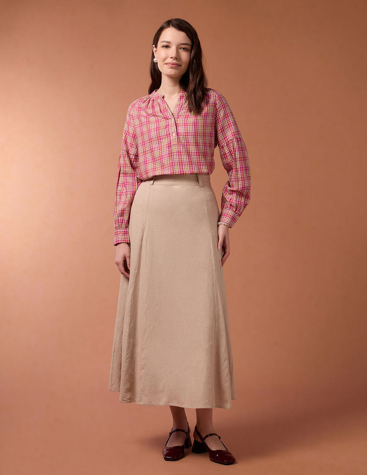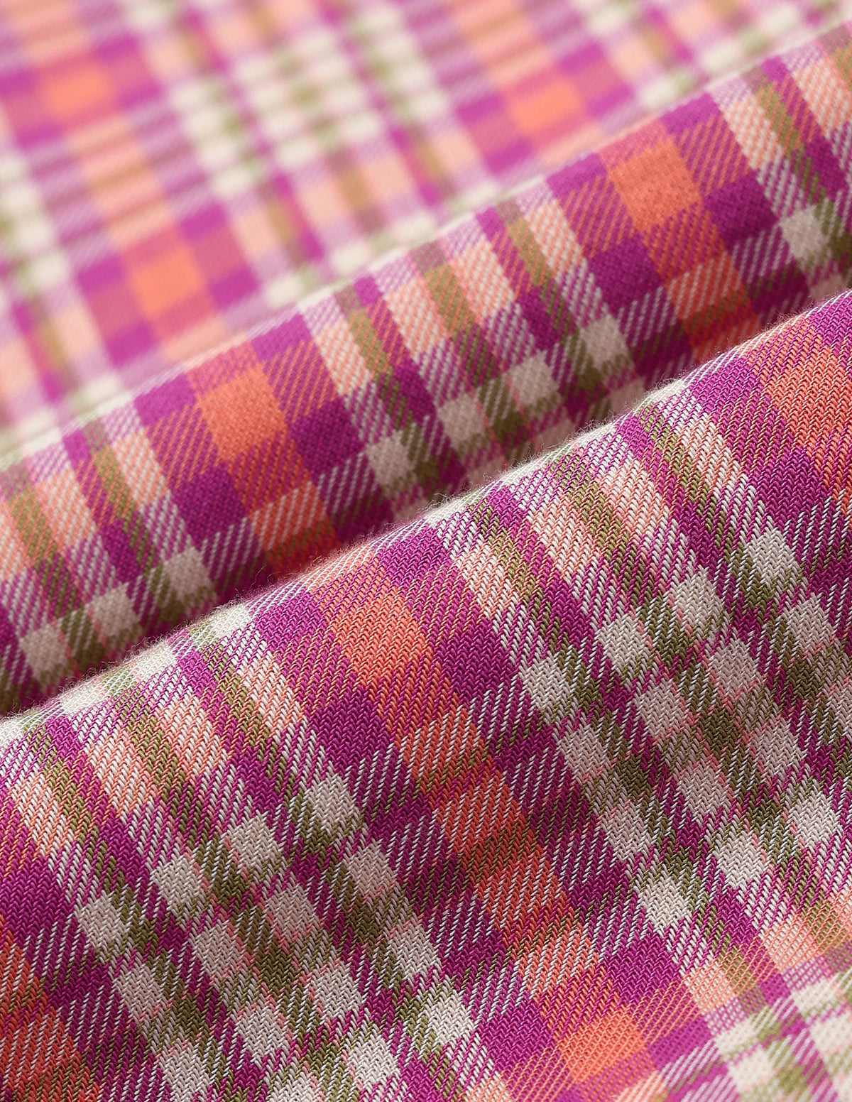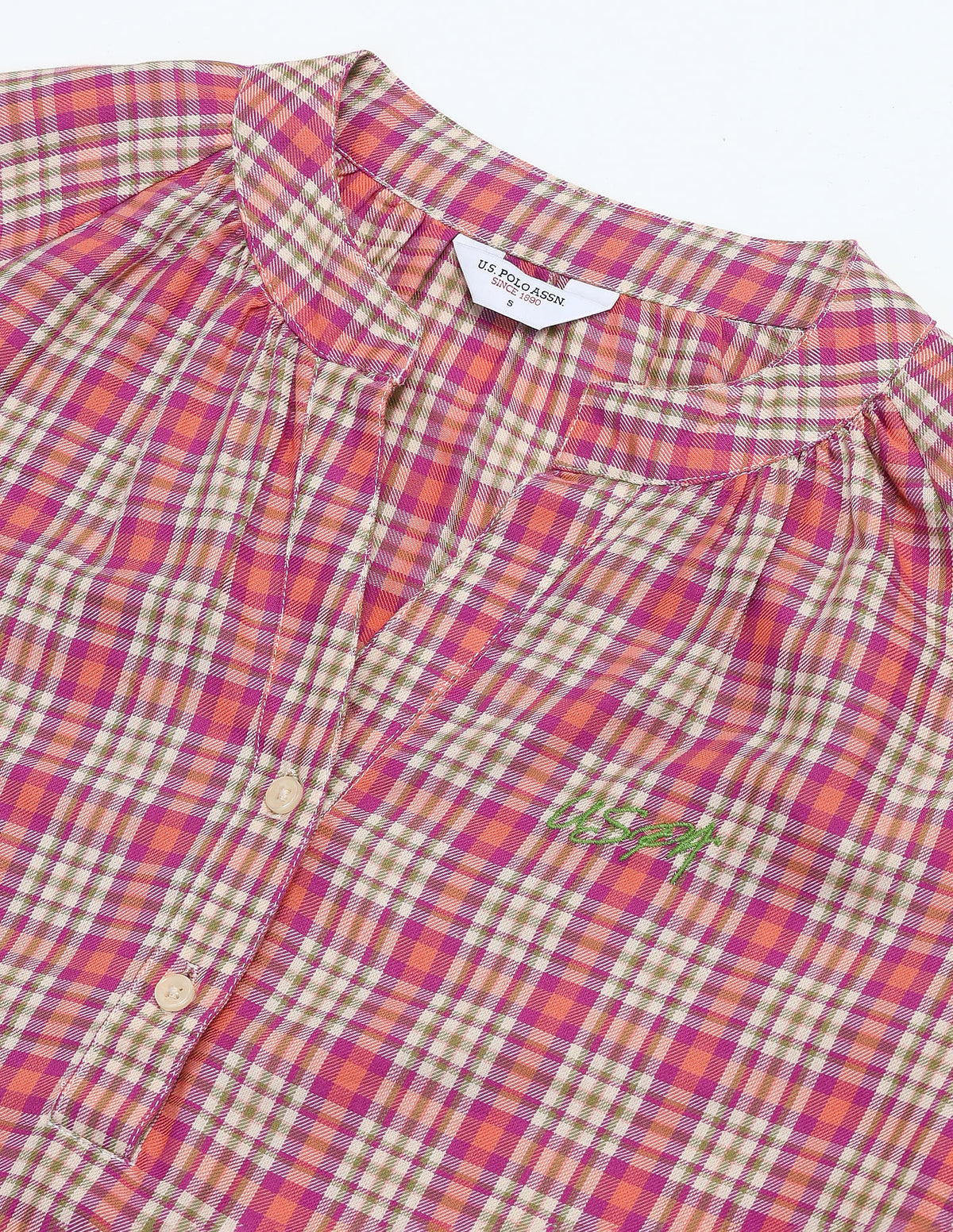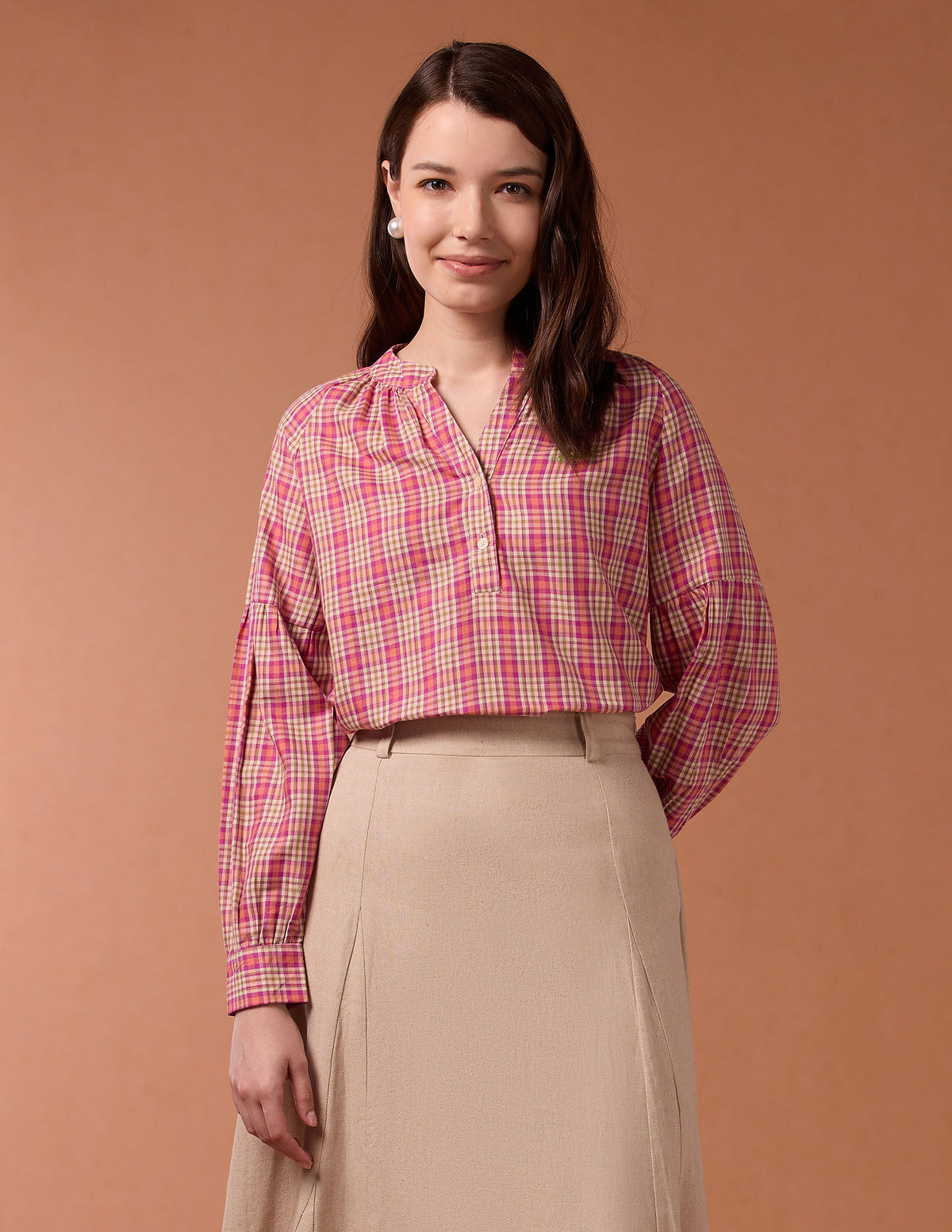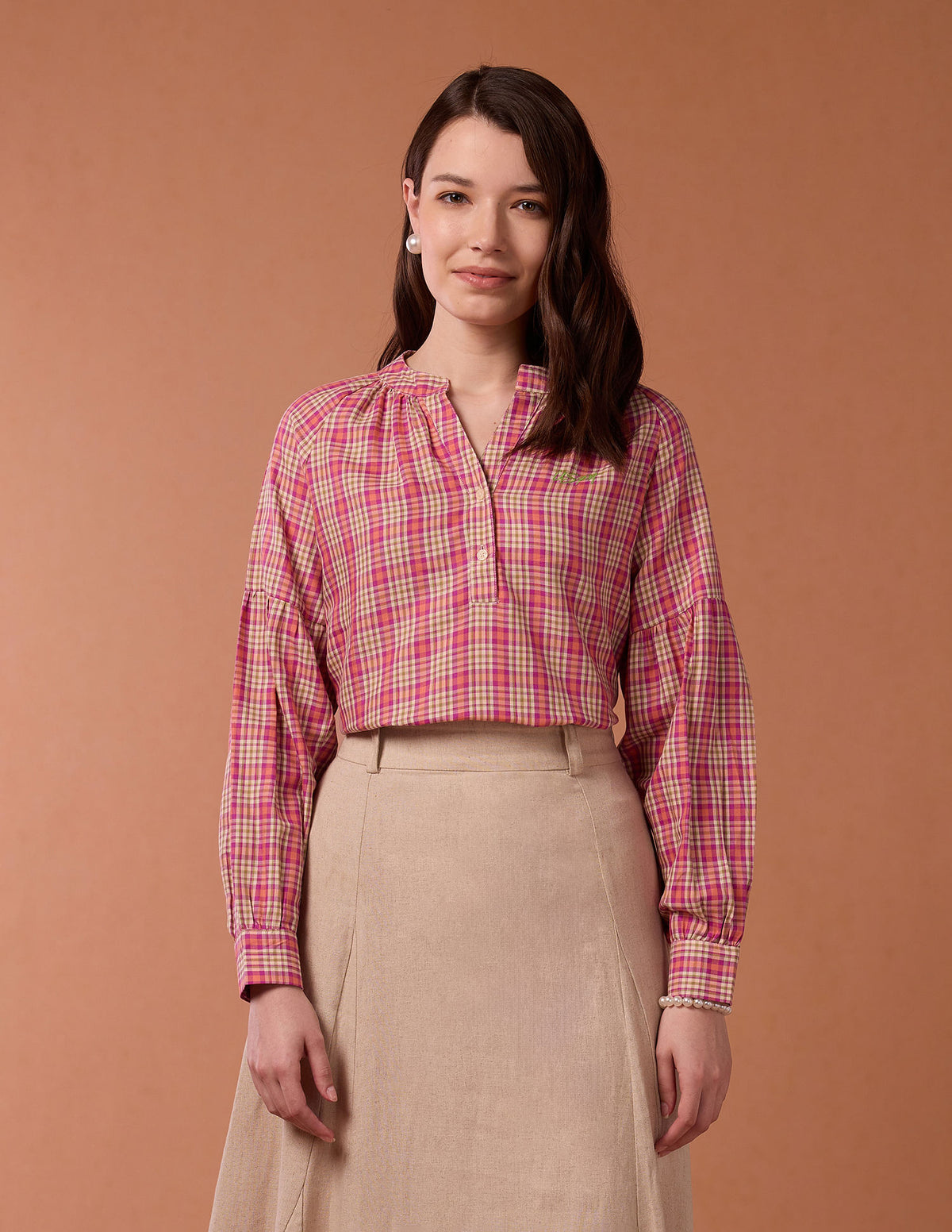 | V-neck | Logo at chest | Short button placket | Blouson sleeves with barrel cuffs | Straight hemline | Tartan checked pattern | Twill weave | Loose fit