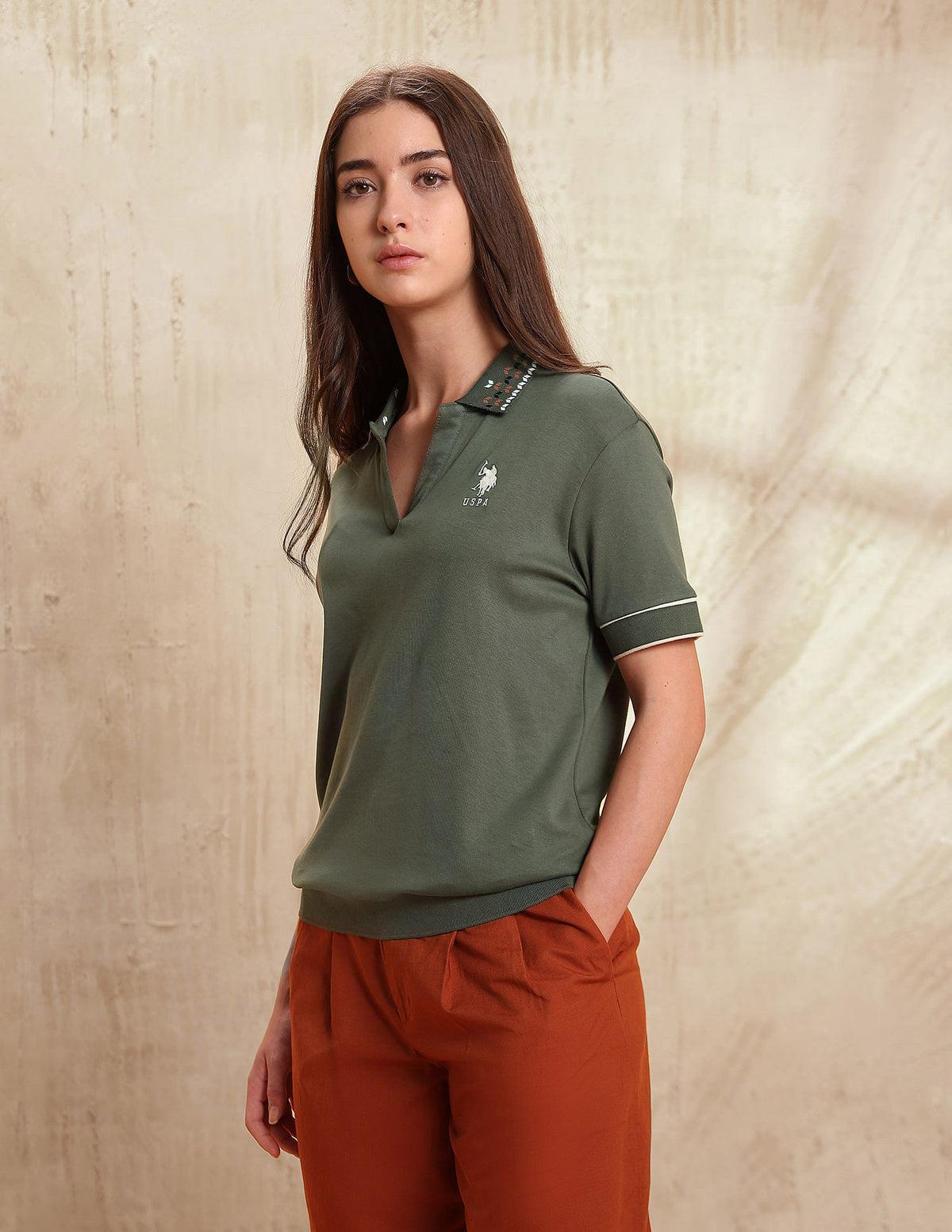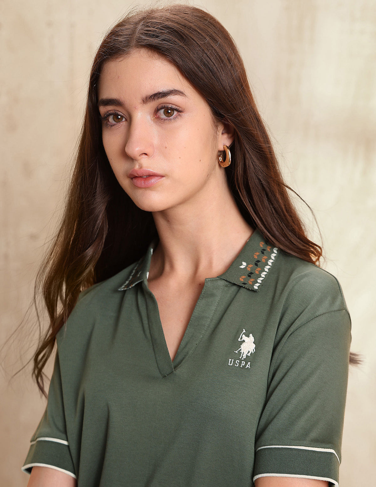 | Polo collar | Logo at chest | Short button placket | Short sleeves | Ribbed collar and sleeve hems | Uneven vented hem | Solid pattern | Pique knit | Boxy fit |