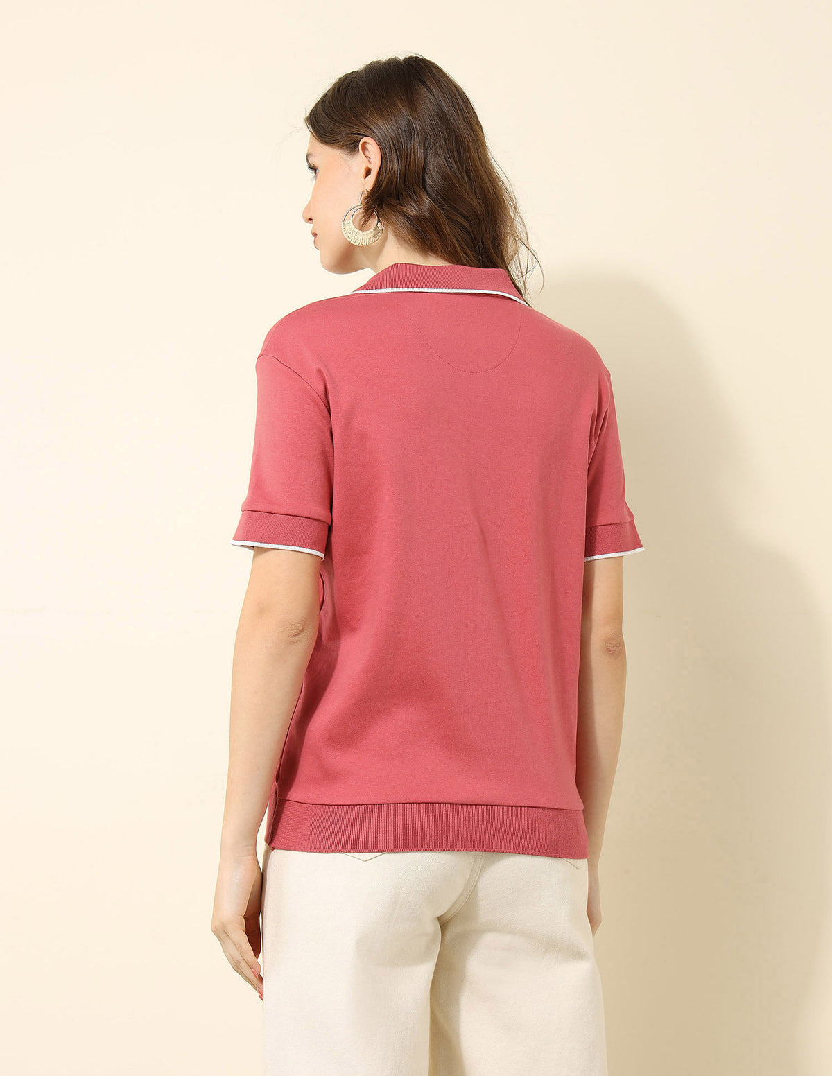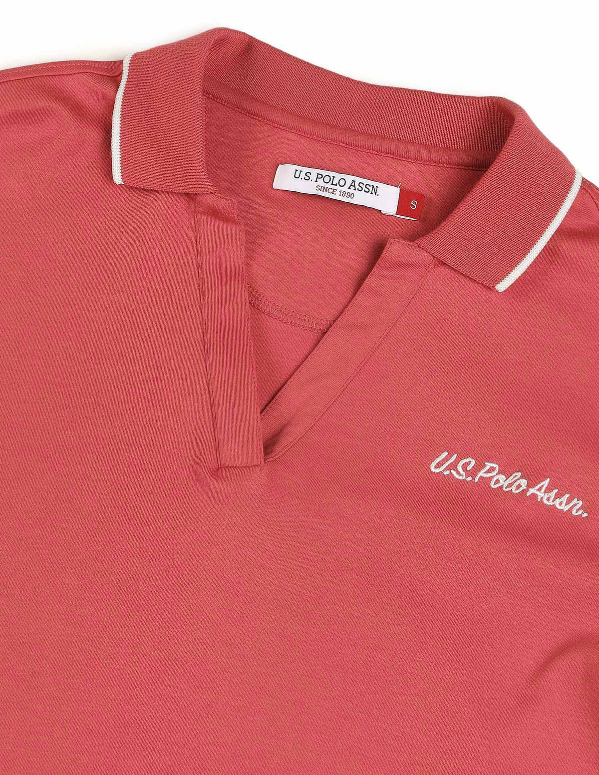 | Tipped polo collar | Logo at chest | Open placket | Short sleeves | Ribbed collar and sleeve hems | Vented hemline | Solid pattern | Pique knit | Boxy fit |