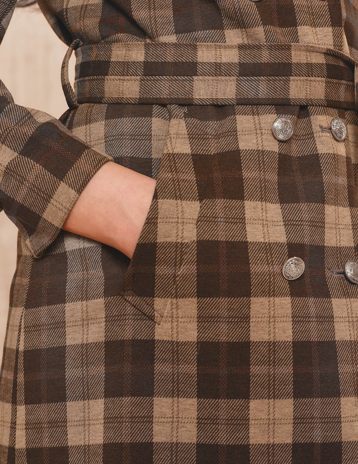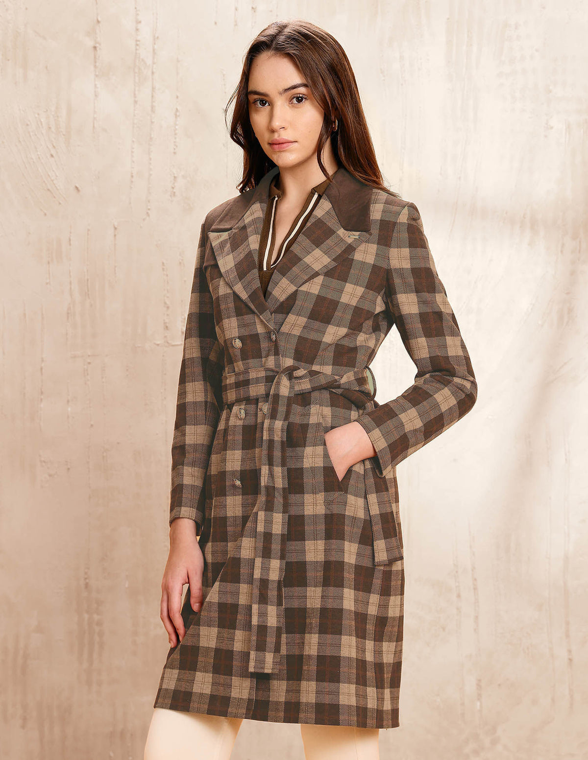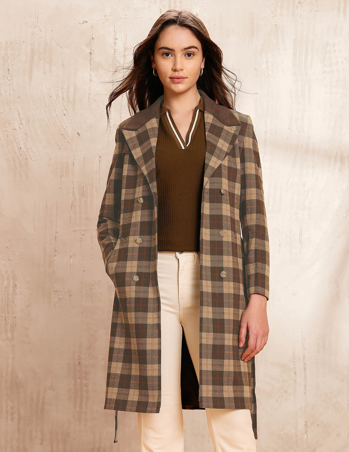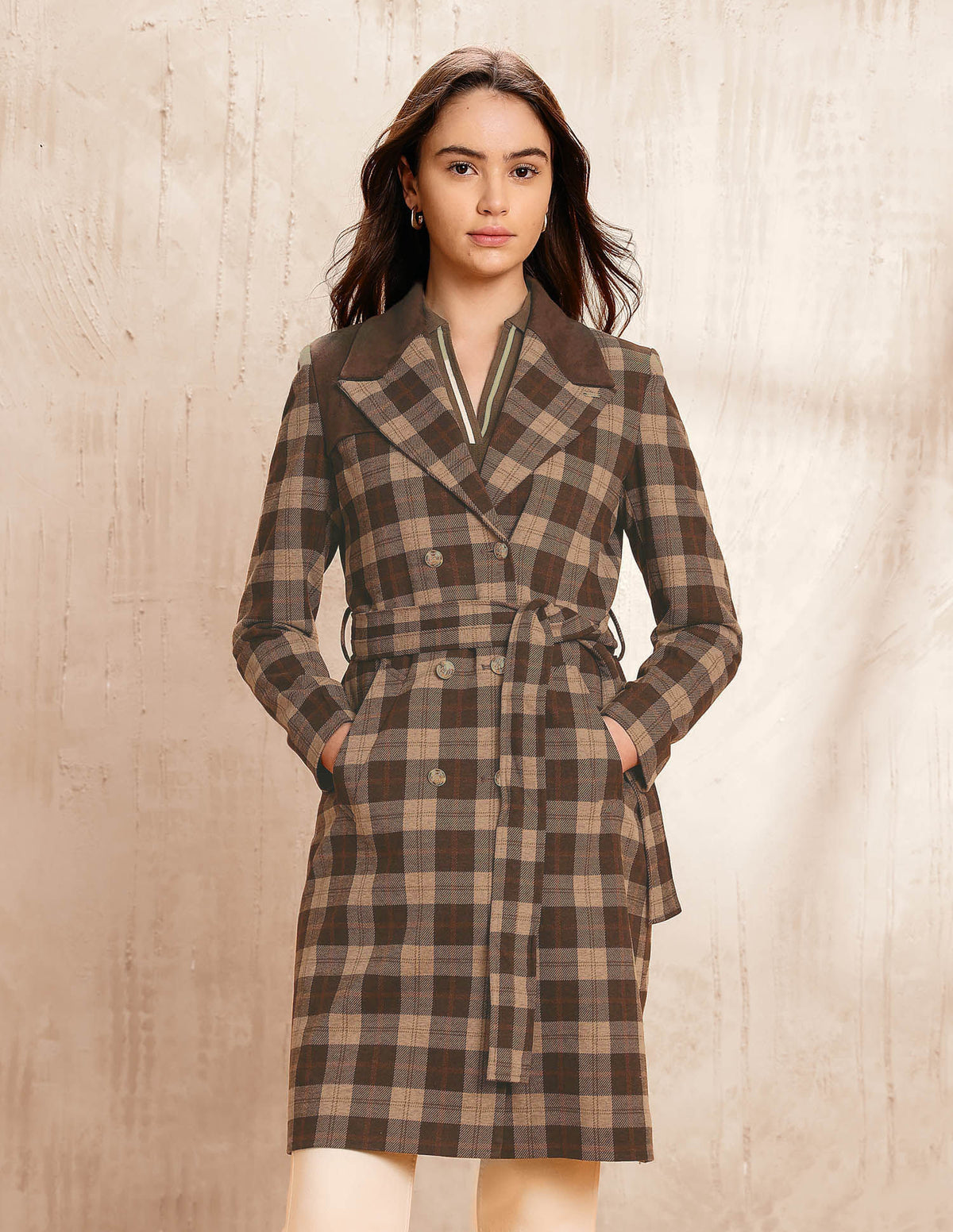 | Notch lapel collar | Double breasted | Long sleeves | Straight hem | Fabric belt at waist | Checked pattern | Regular fit |