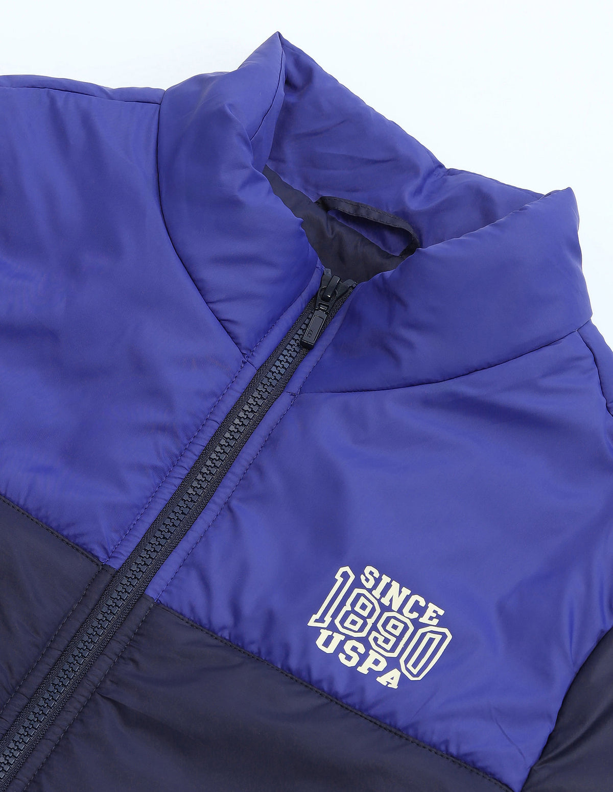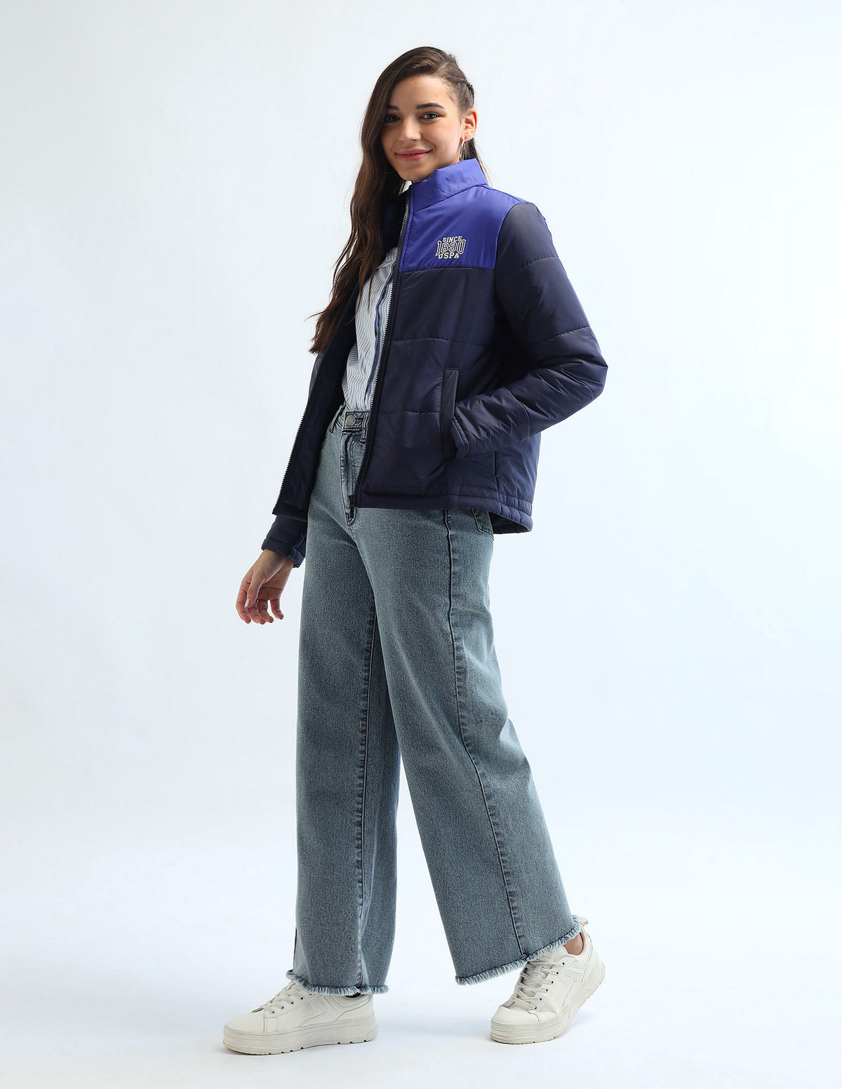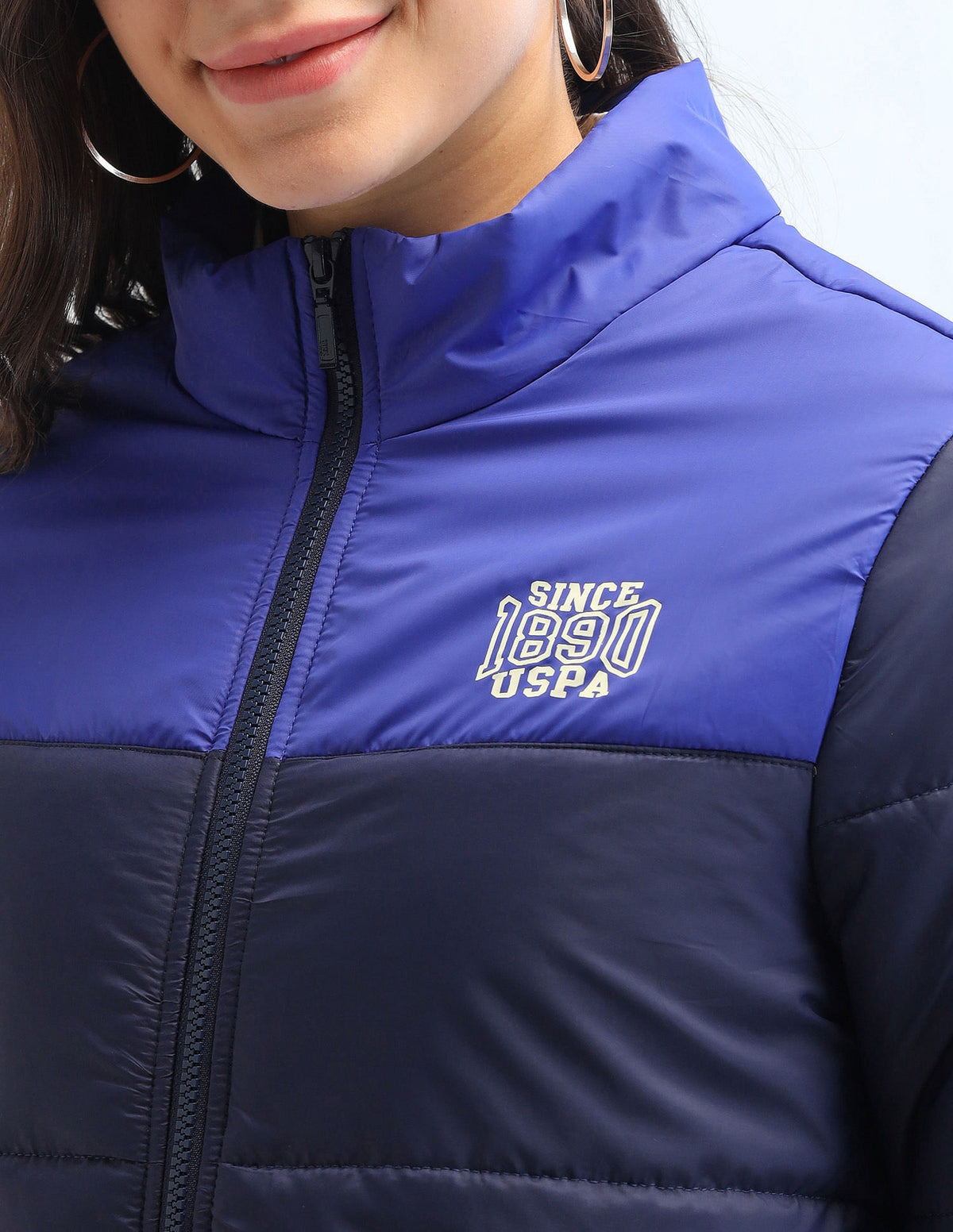 | High neck | Full zipper closure | Long sleeves | Two pockets | Colourblocked pattern |