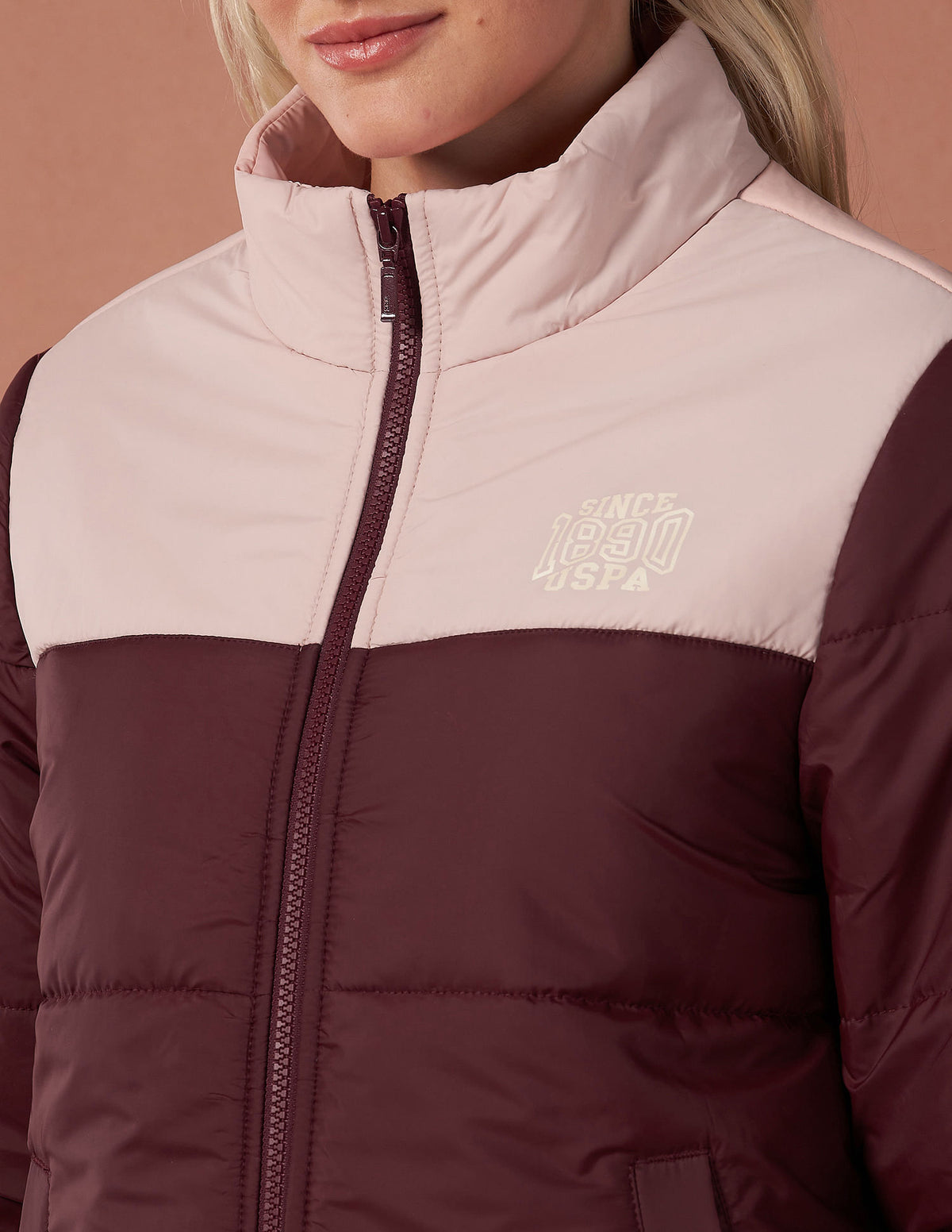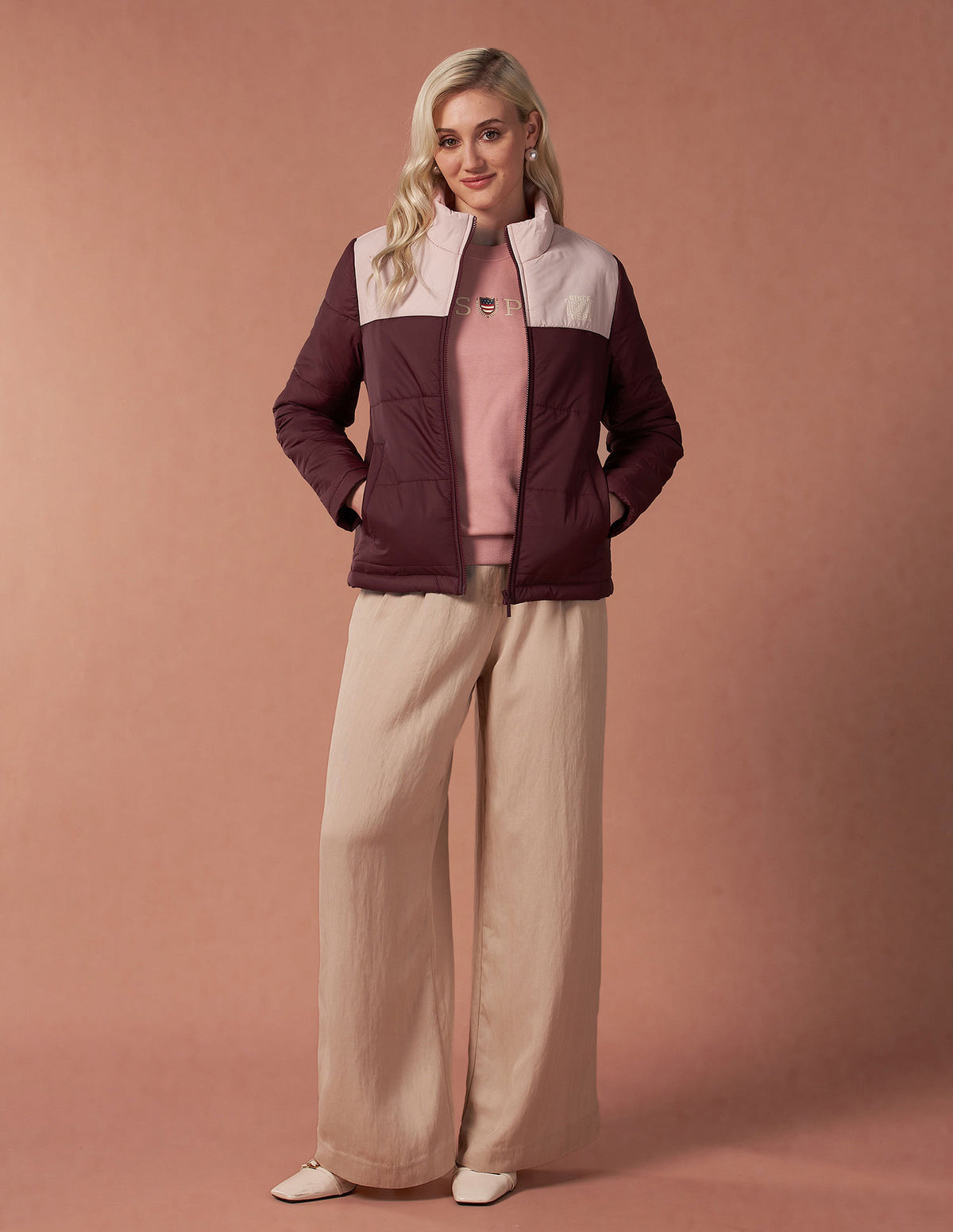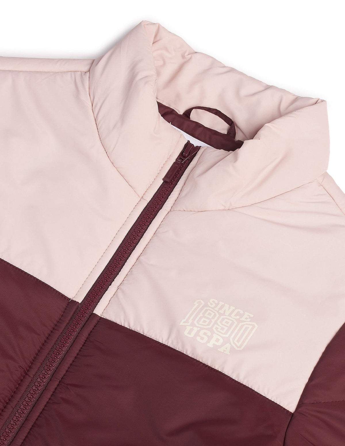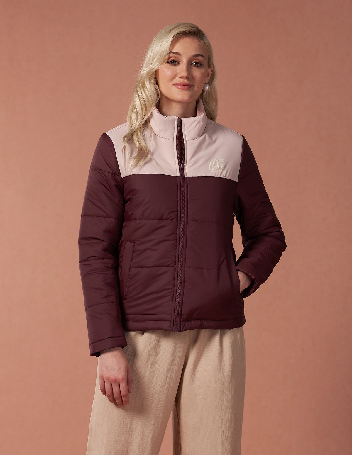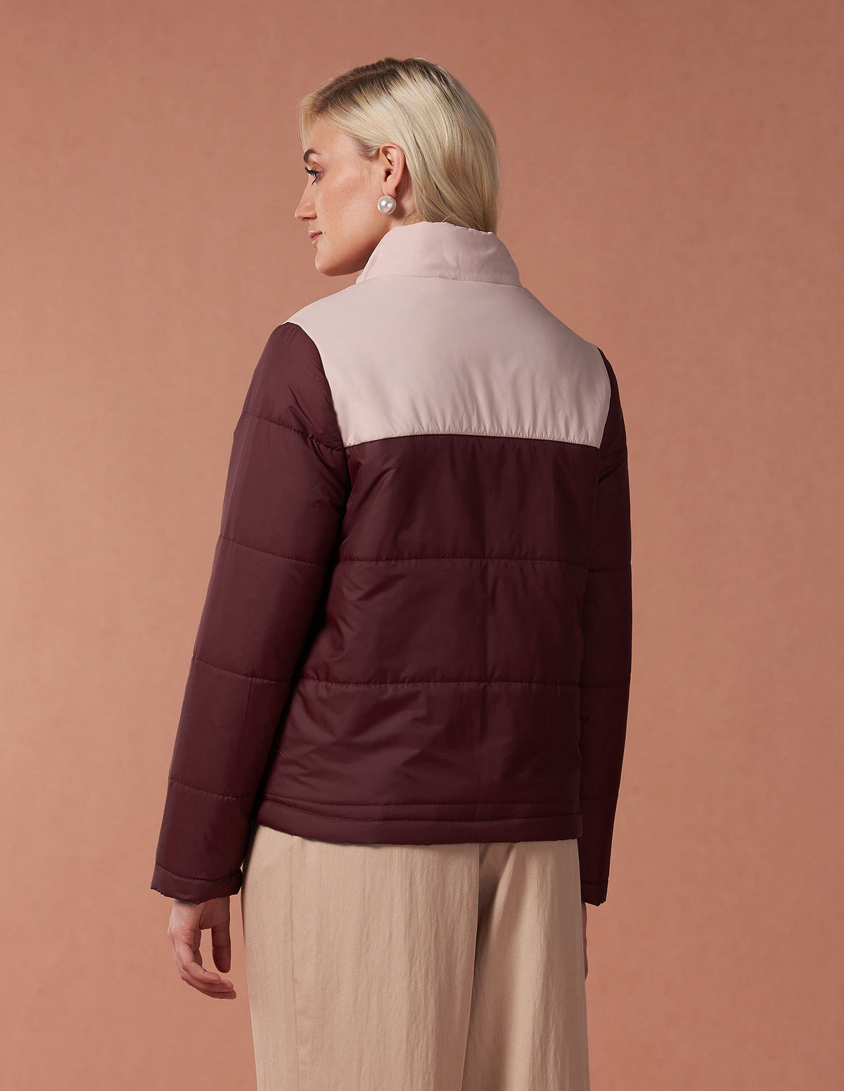 | High neck | Full zipper closure | Long sleeves | Two pockets | Colourblocked pattern |