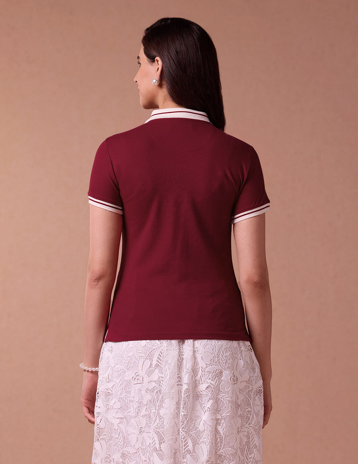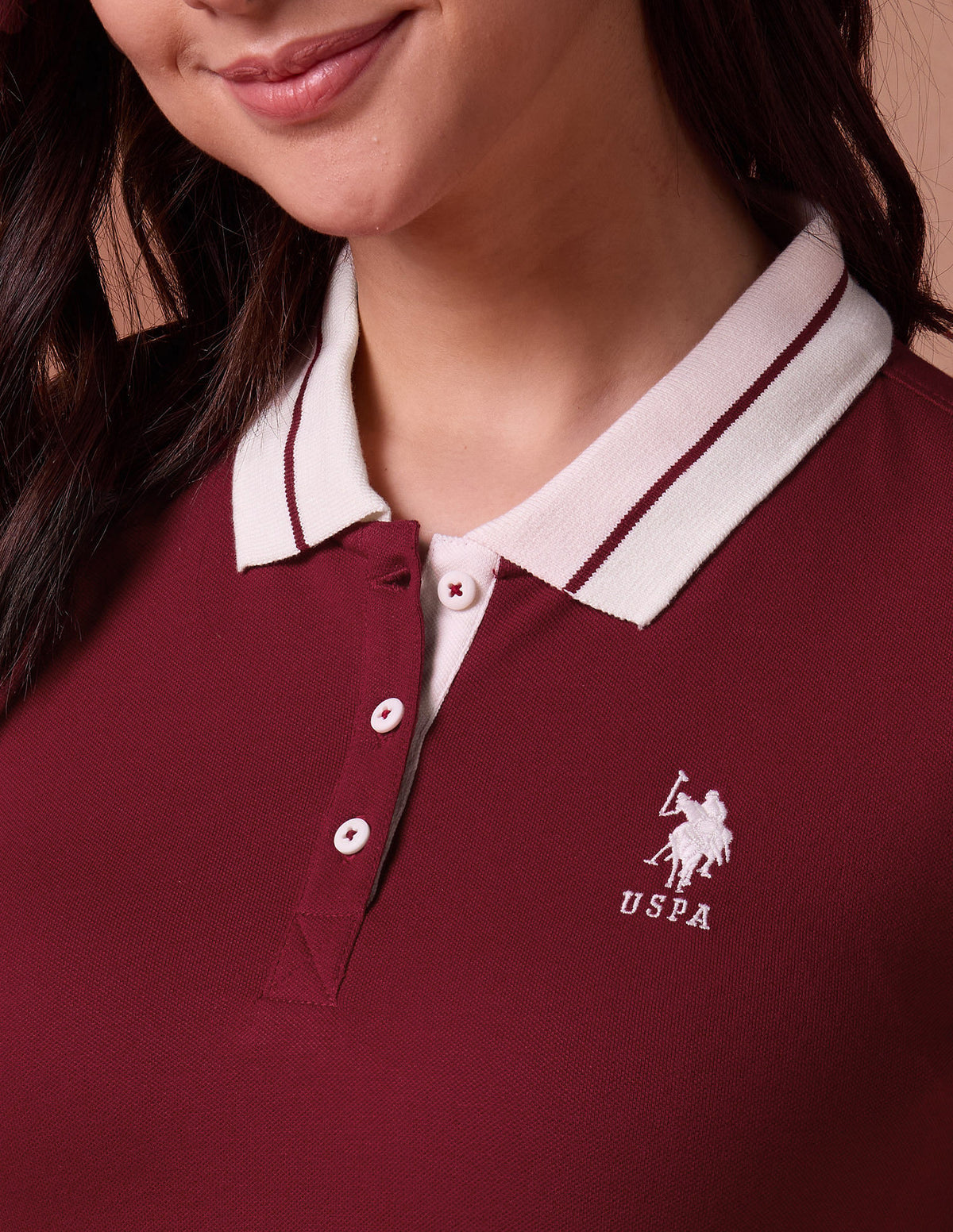 | Polo collar | Logo at chest | Short button placket | Short sleeves | Ribbed, contrast and tipped collar and sleeve hems | Vented hemline | Solid pattern | Pique knit | Regular fit