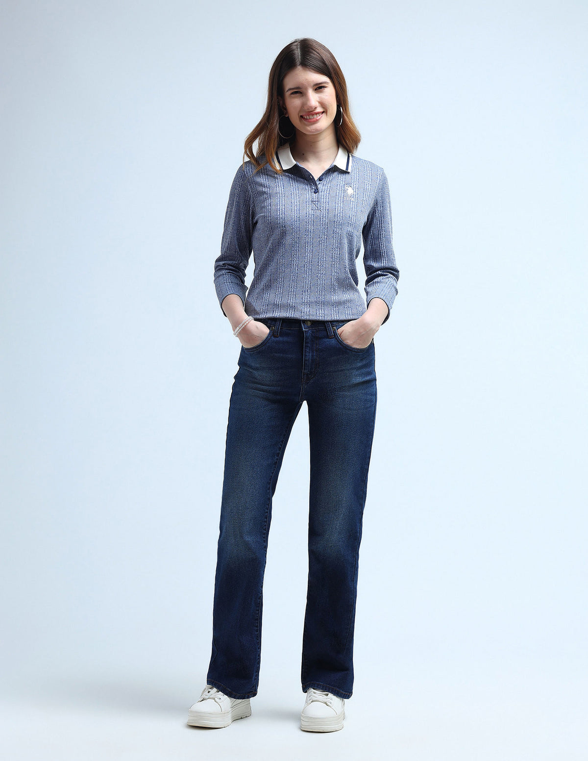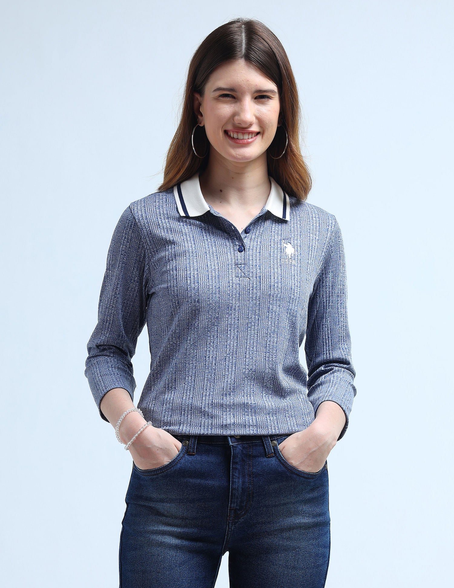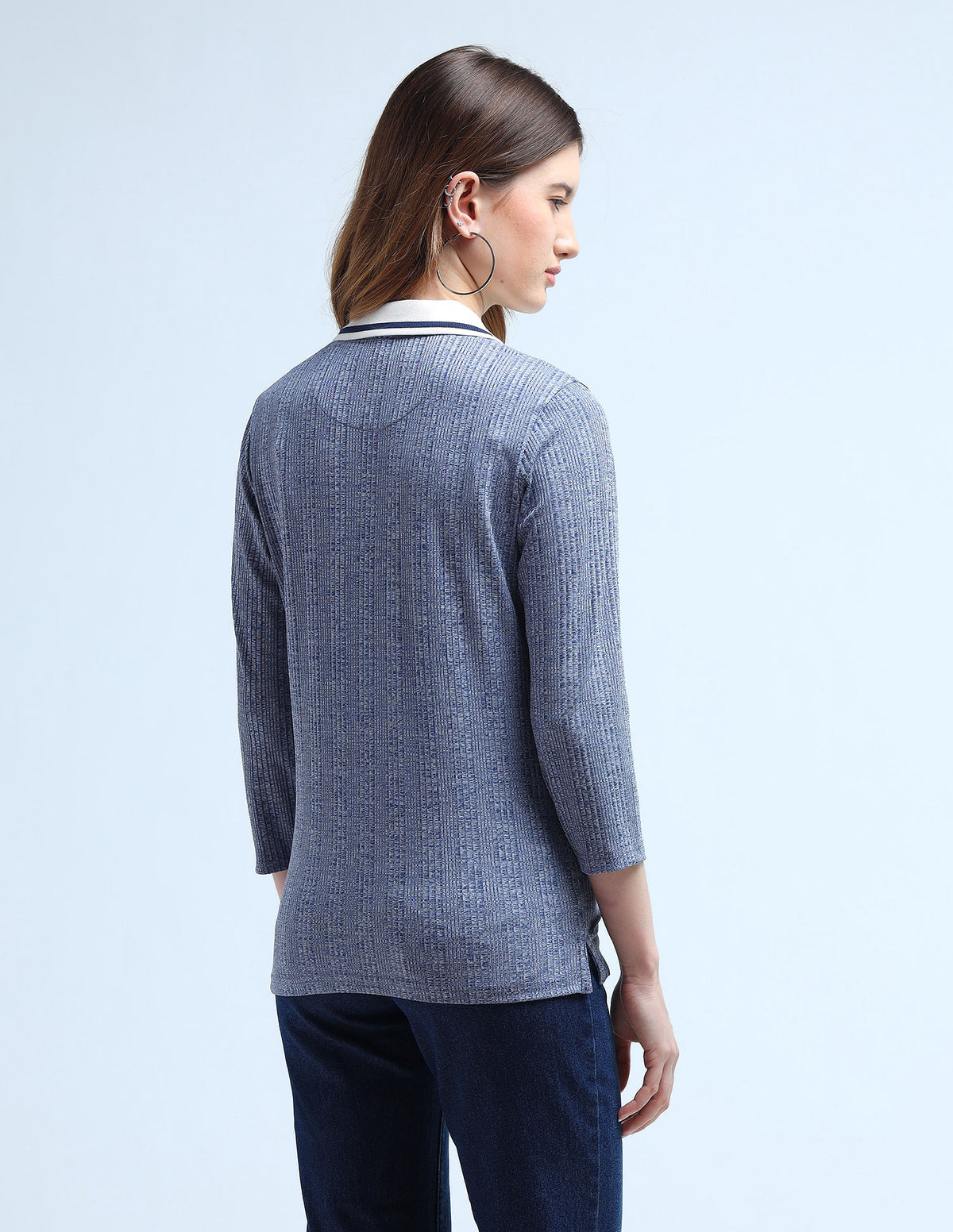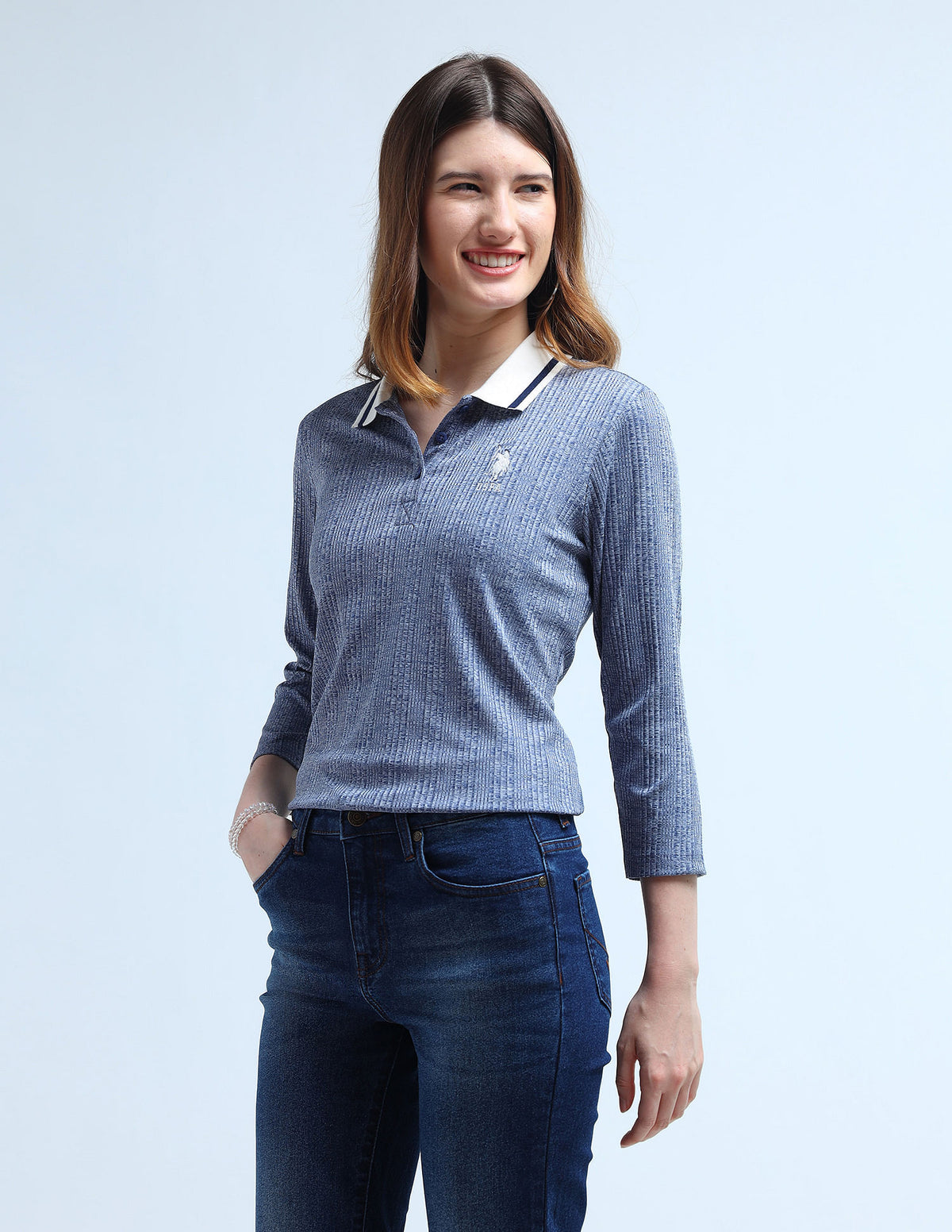 | Contrast and tipped polo collar | Logo at chest | Short button placket | Three quarter sleeves | Vented hemline | Patterned knit | Regular fit