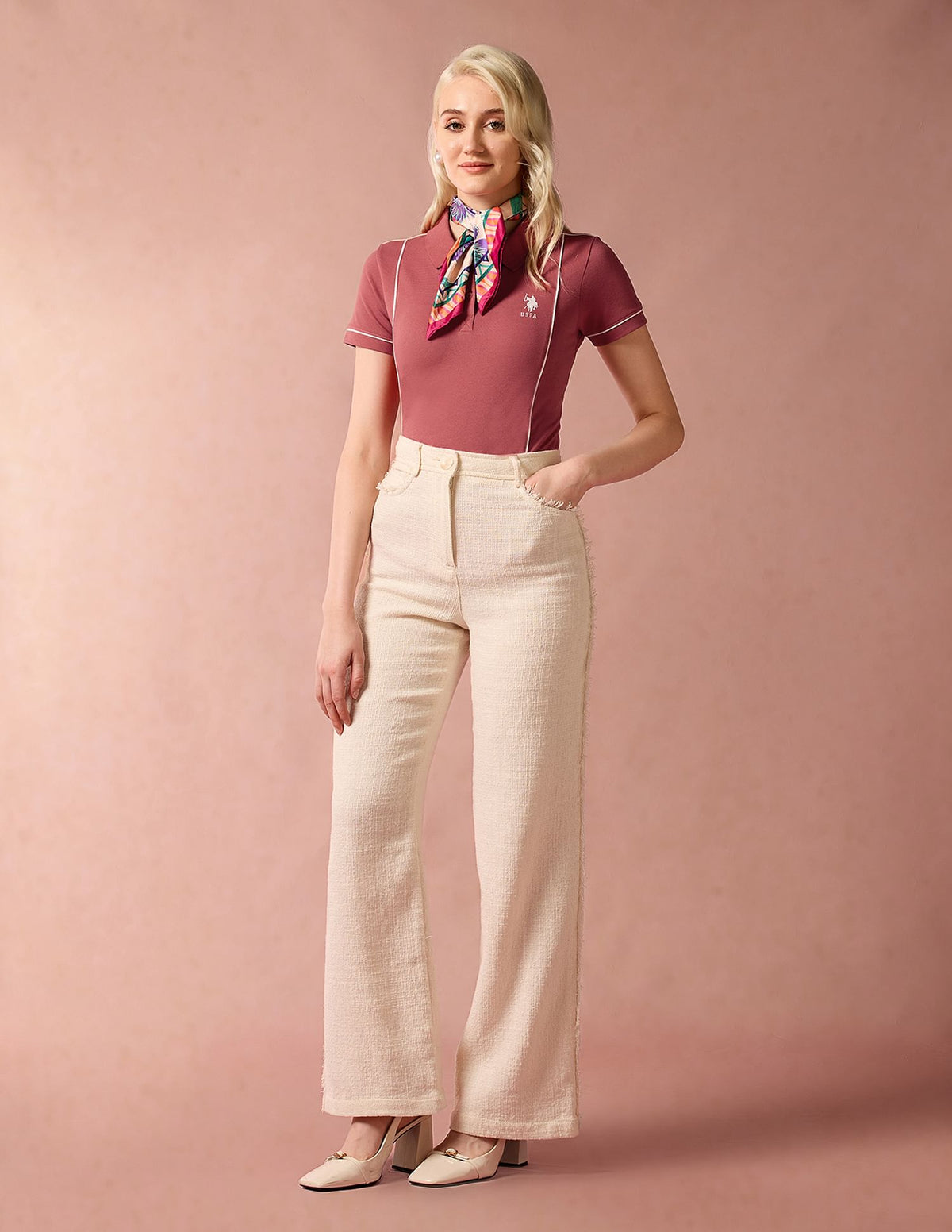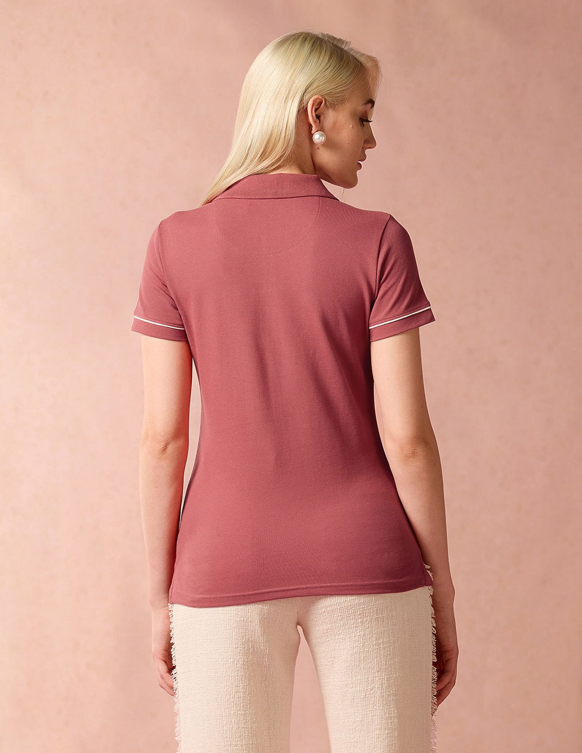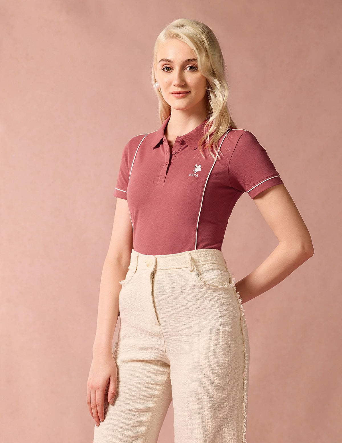 | Polo collar | Logo at chest | Short button placket | Short sleeves | Ribbed collar and sleeve hems | Vented hem | Contrast piping | Solid pattern | Pique knit | Regular fit
