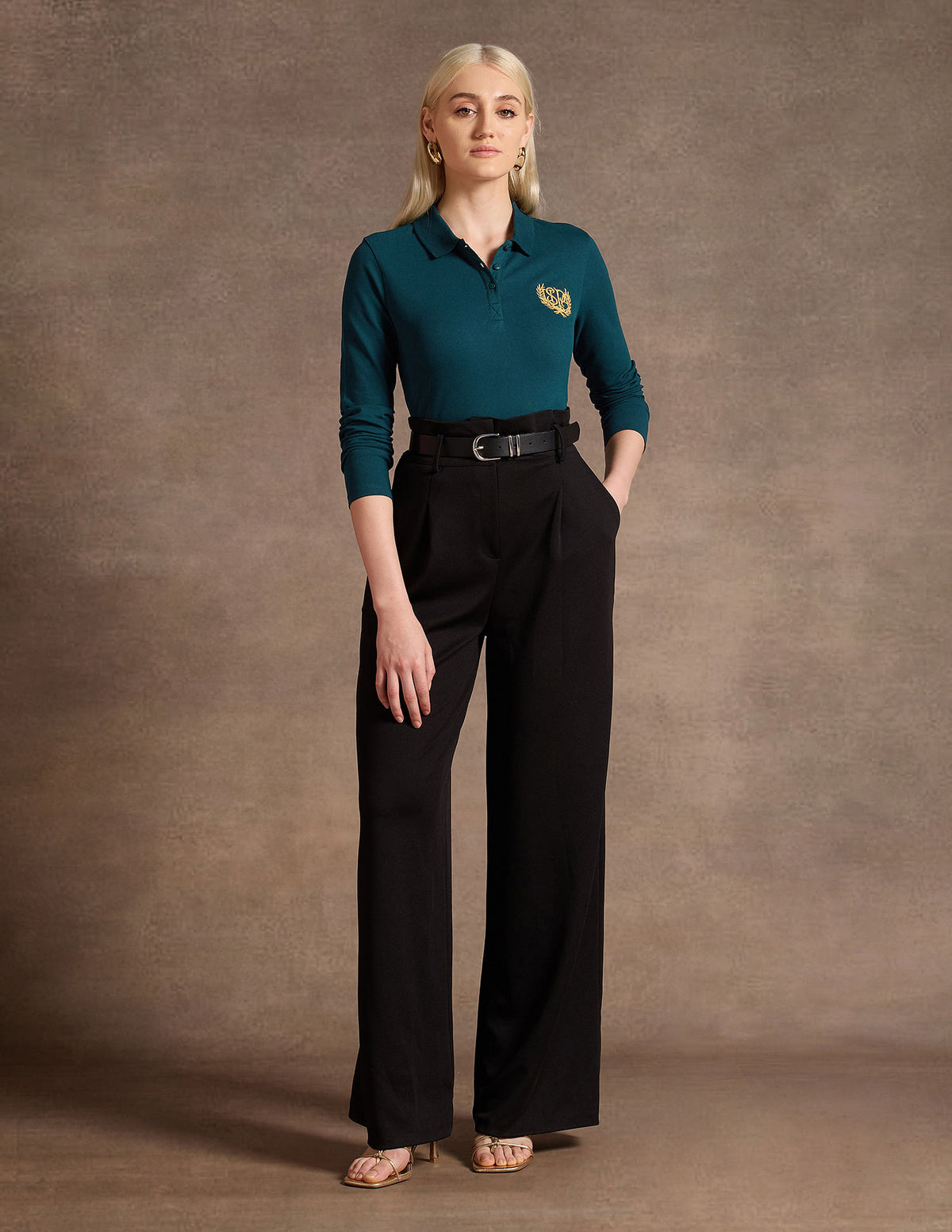 | Polo collar | Embroidered logo at chest | Short button placket | Long sleeves | Vented hem | Solid pattern | Pique knit | Regular fit