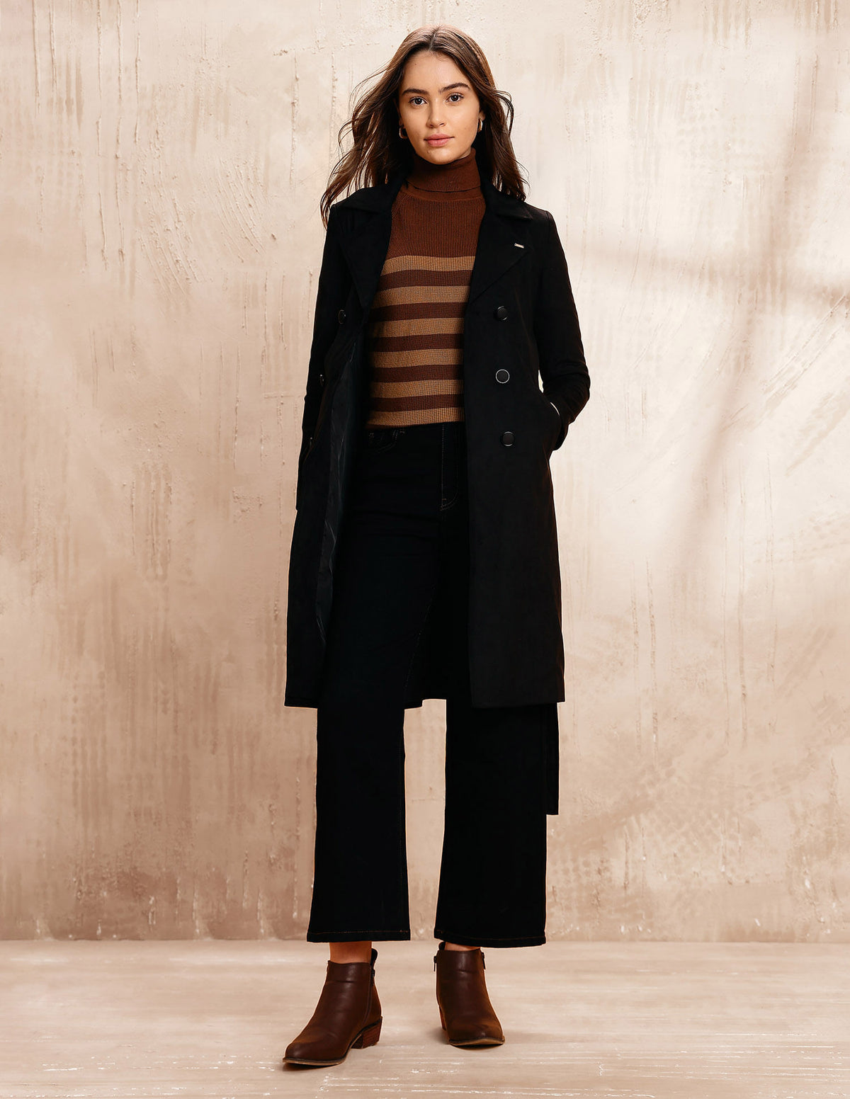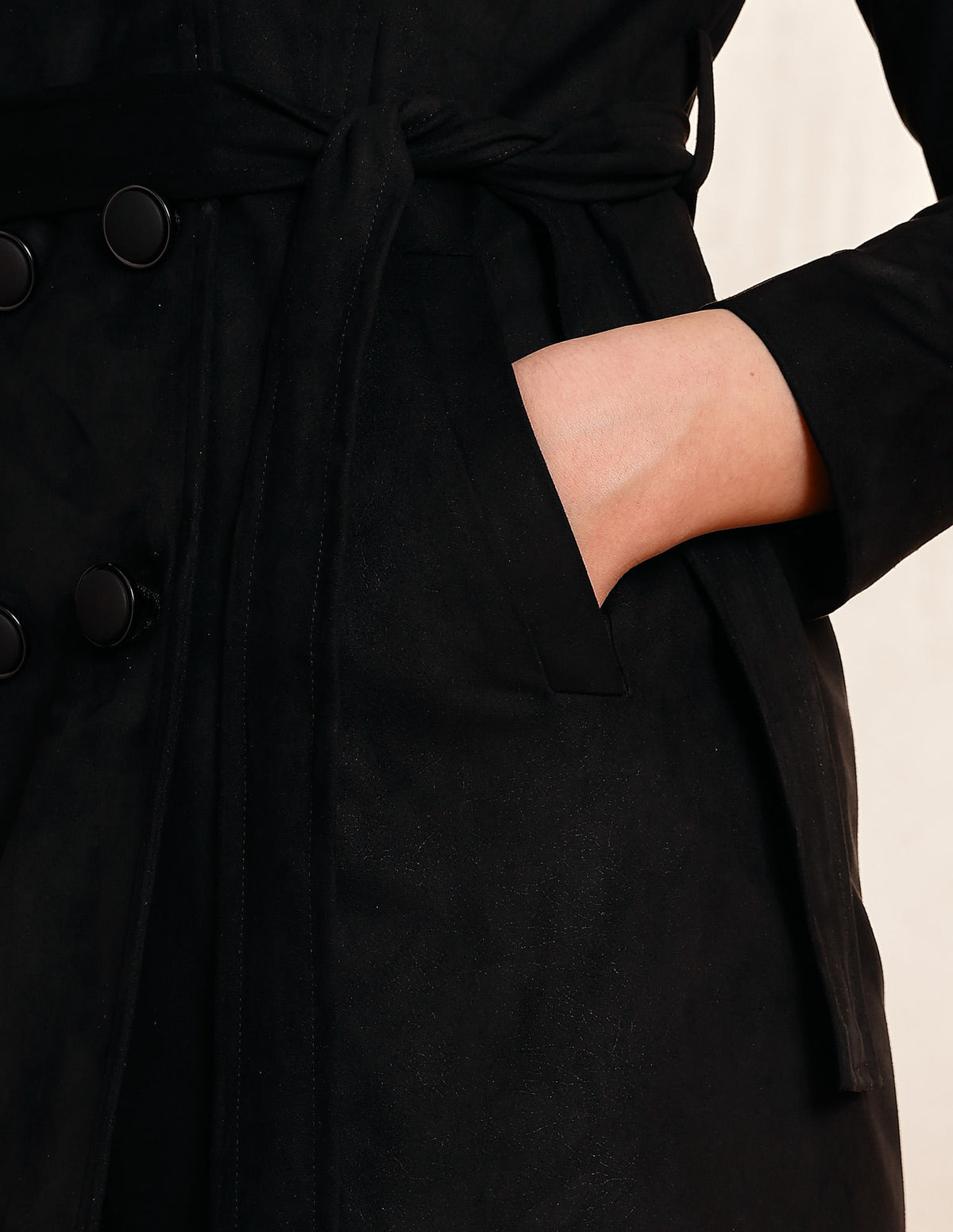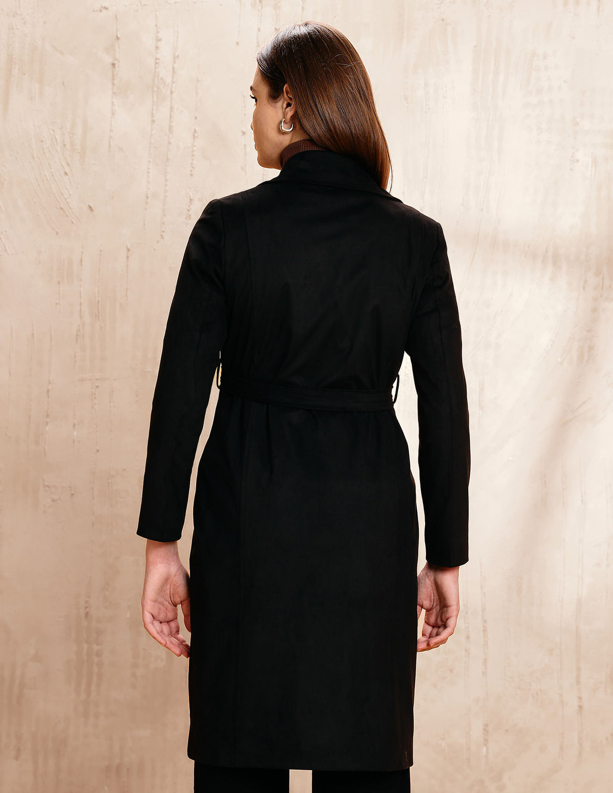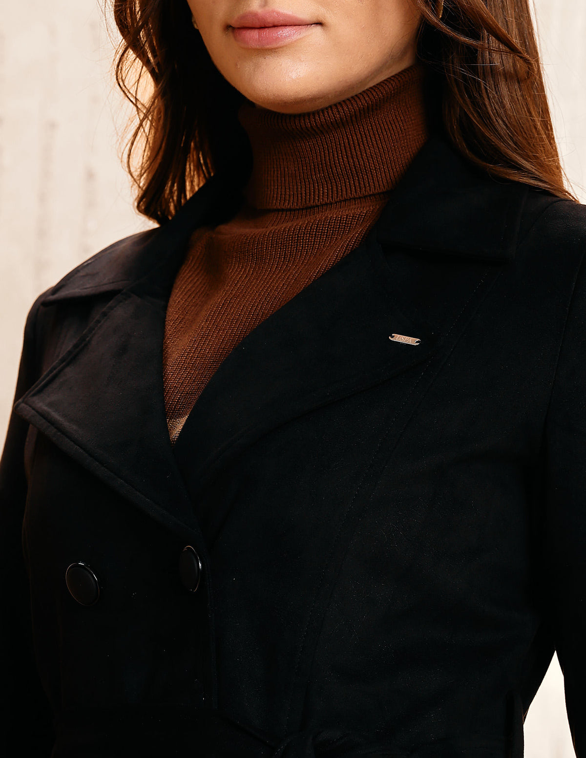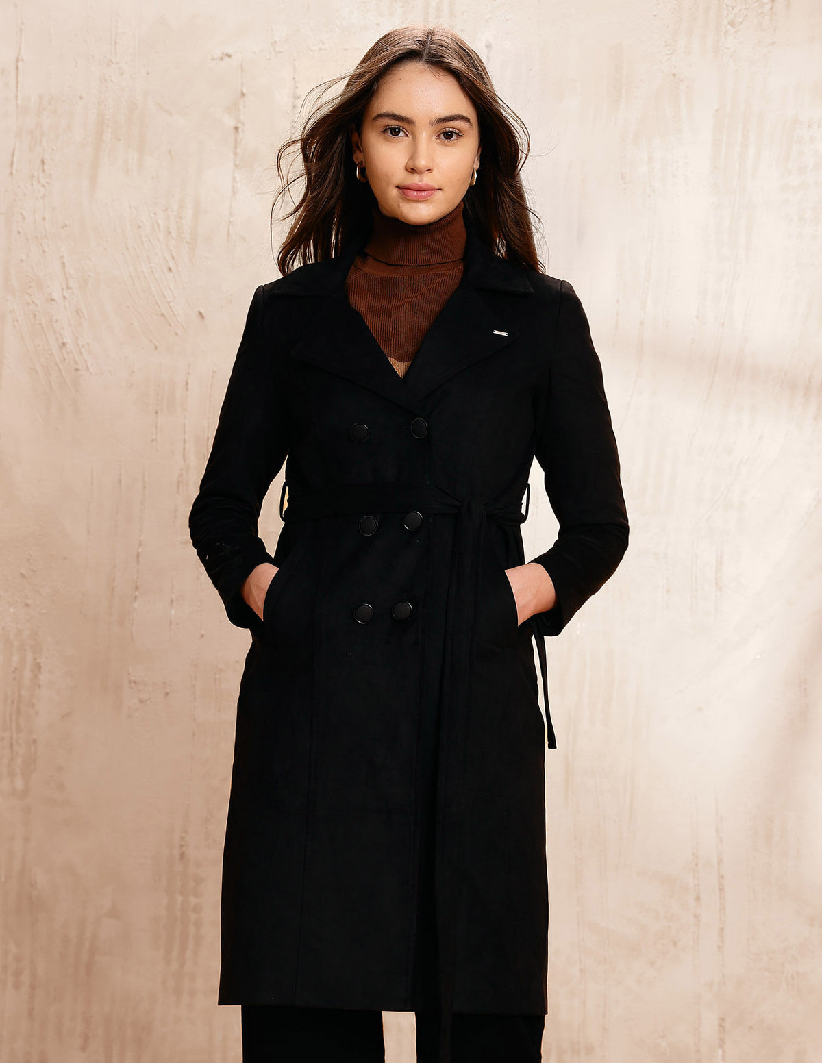 | Notch laplel collar | Double breasted | Long sleeves with button tabs | Straight hem | Fabric belt at waist | Solid pattern | Regular fit |
