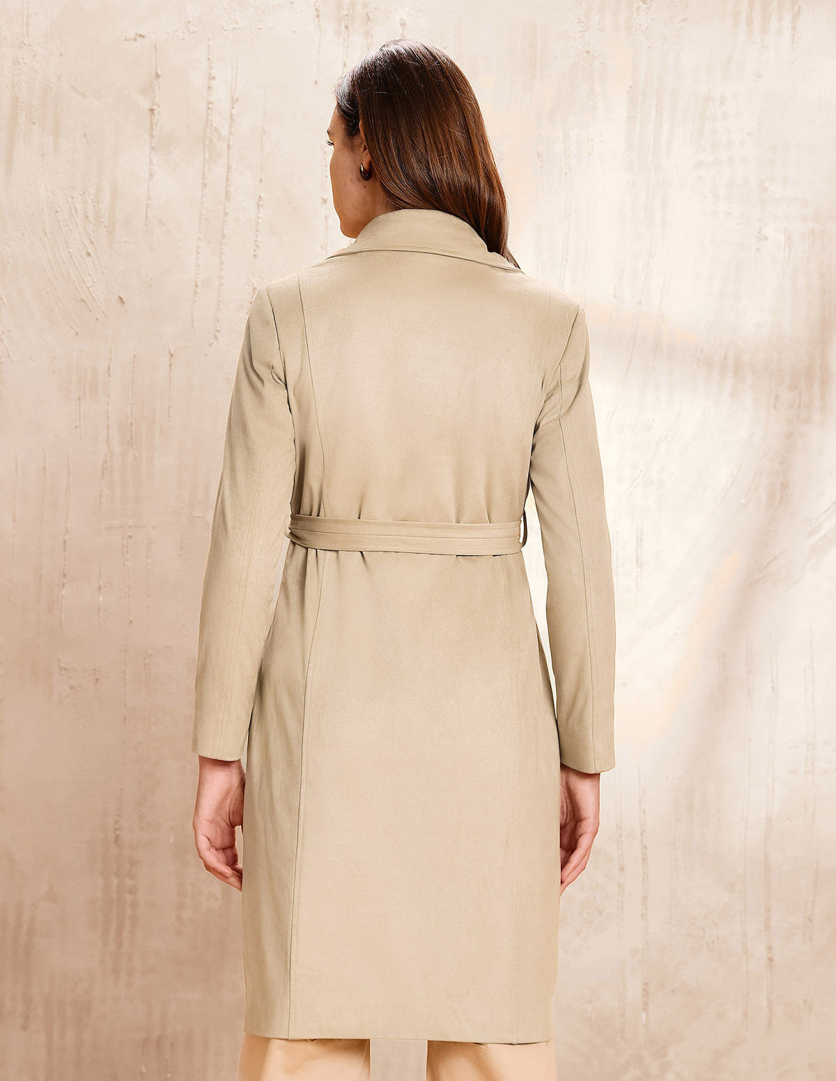 | Notch lapel collar | Double breasted | Straight hem | Fabric belt at waist | Solid pattern | Regular fit |