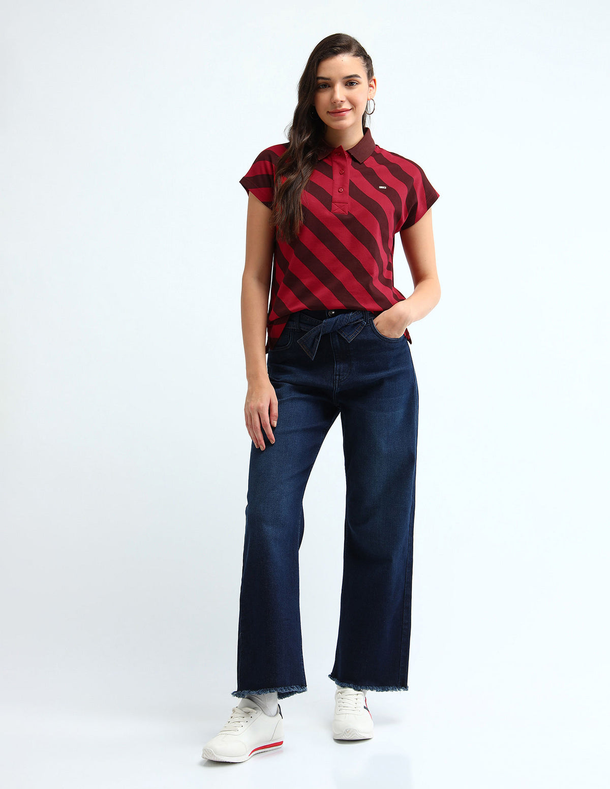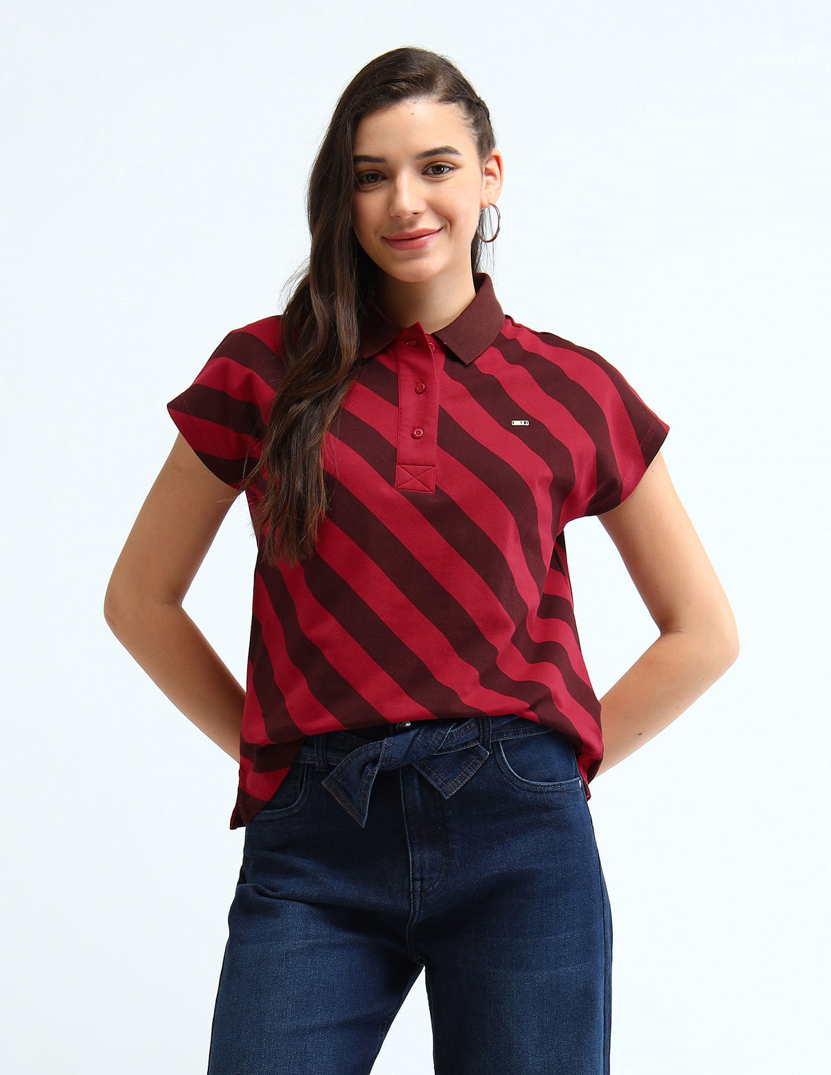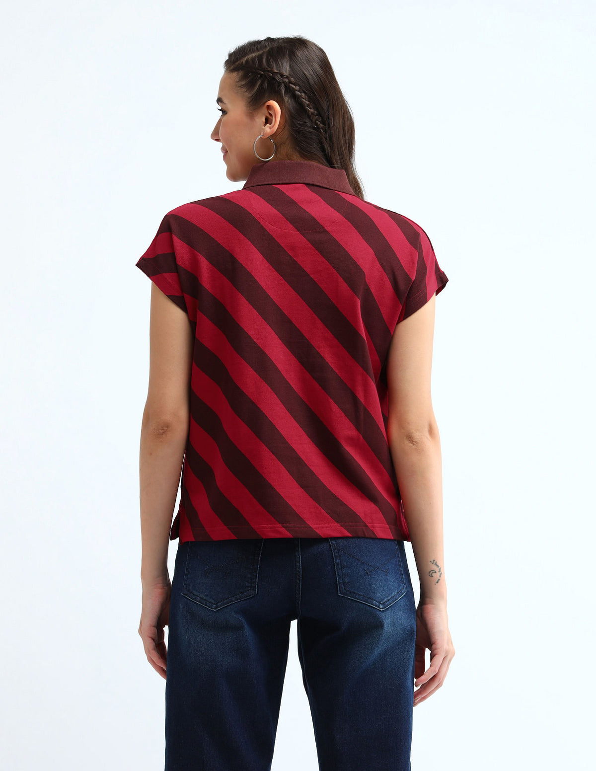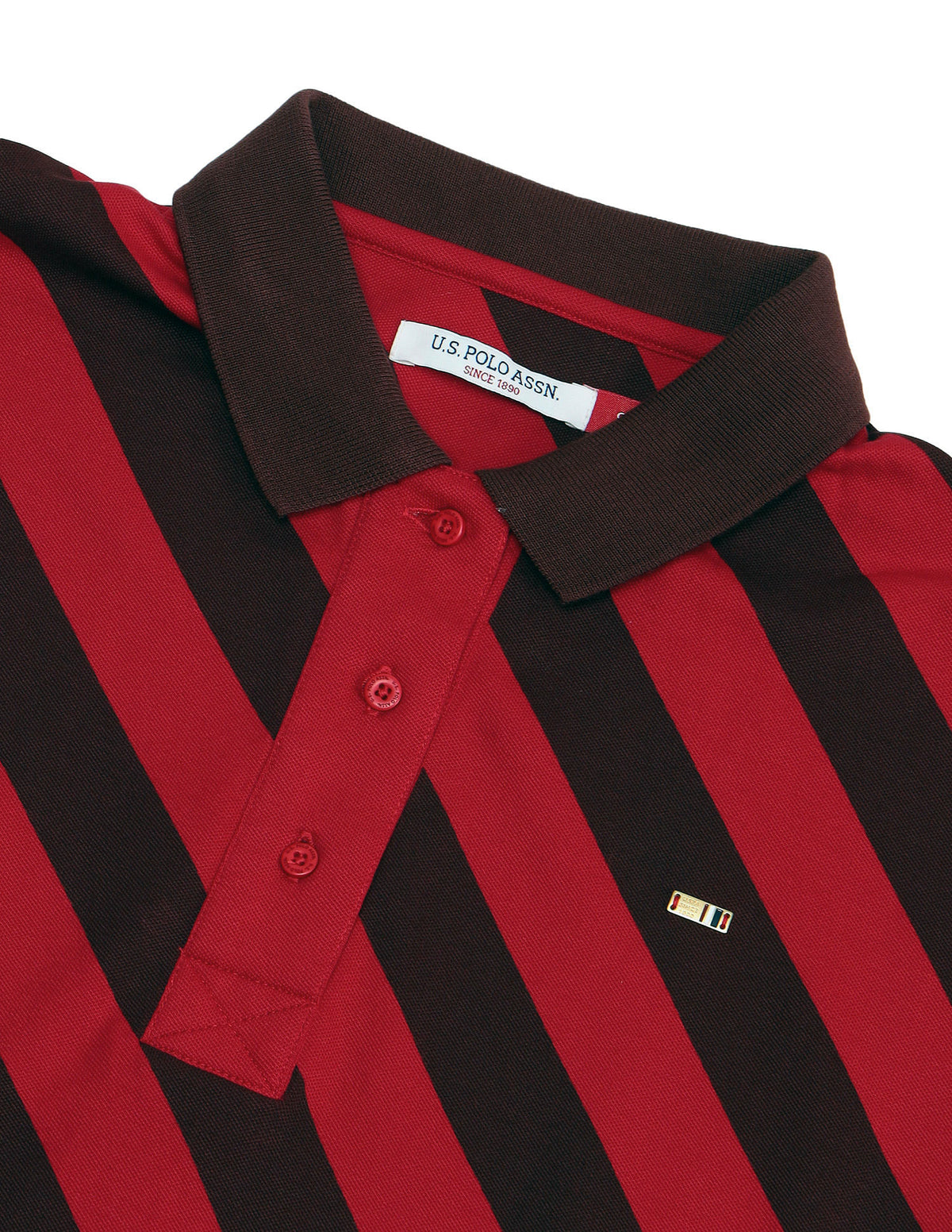 | Polo collar | Logo at chest | Short button placket | Extended shoulder | Short sleeves | Ribbed collar and sleeve hems | Vented hem | Diagonal striped pattern | Knitted | Regular fit | Country Of Origin - India