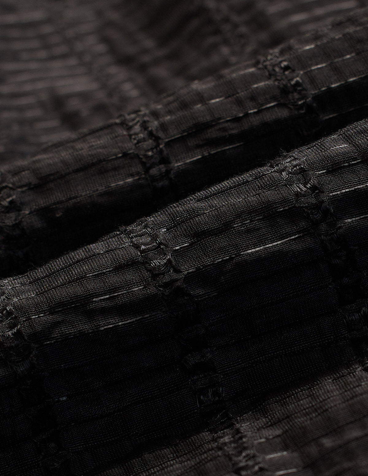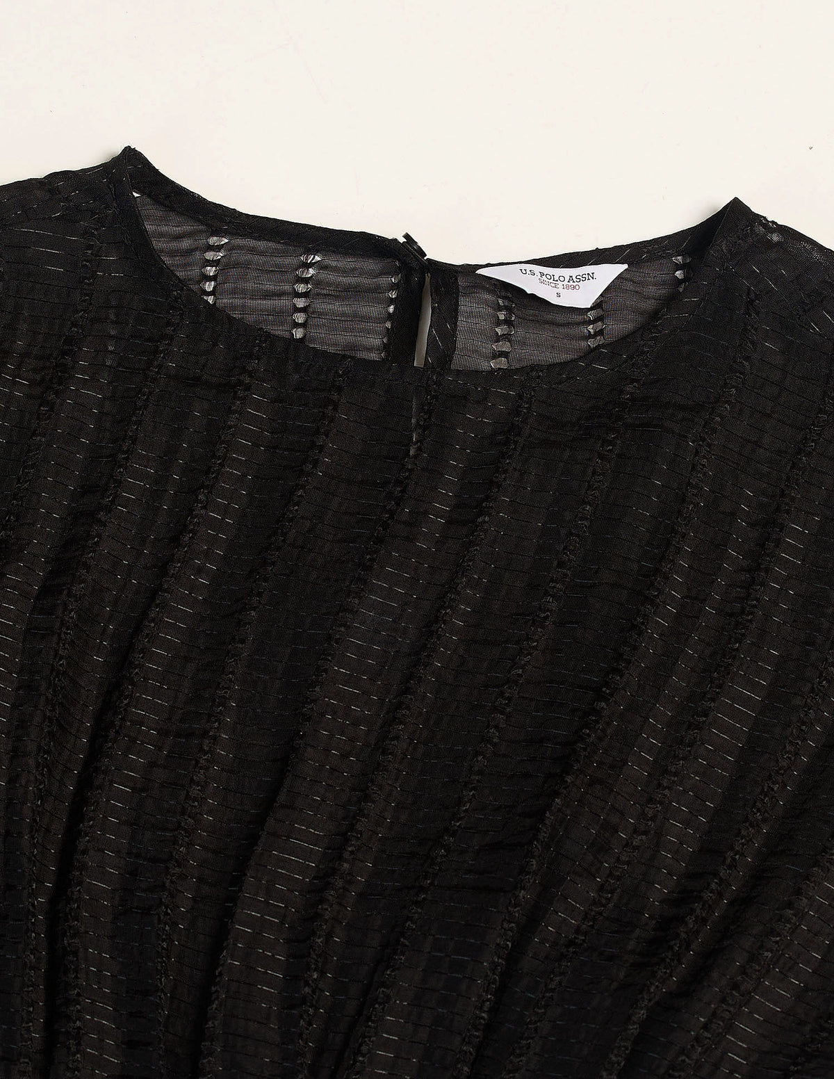 | Round neck | Button and eye loop closure at back | Extended shoulders | Short sleeves | Geometric patterned weave | Regular fit |