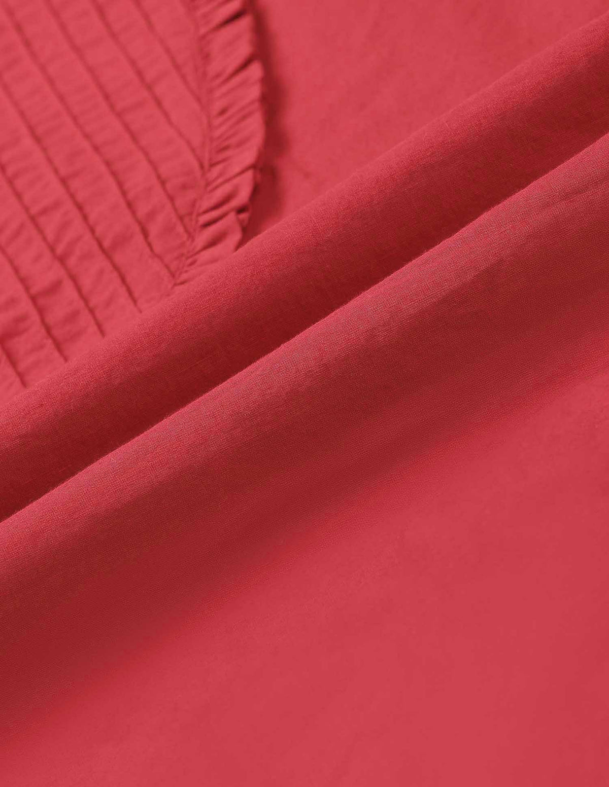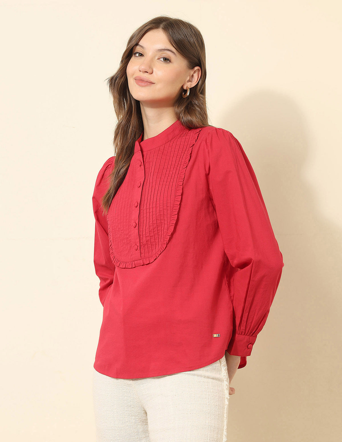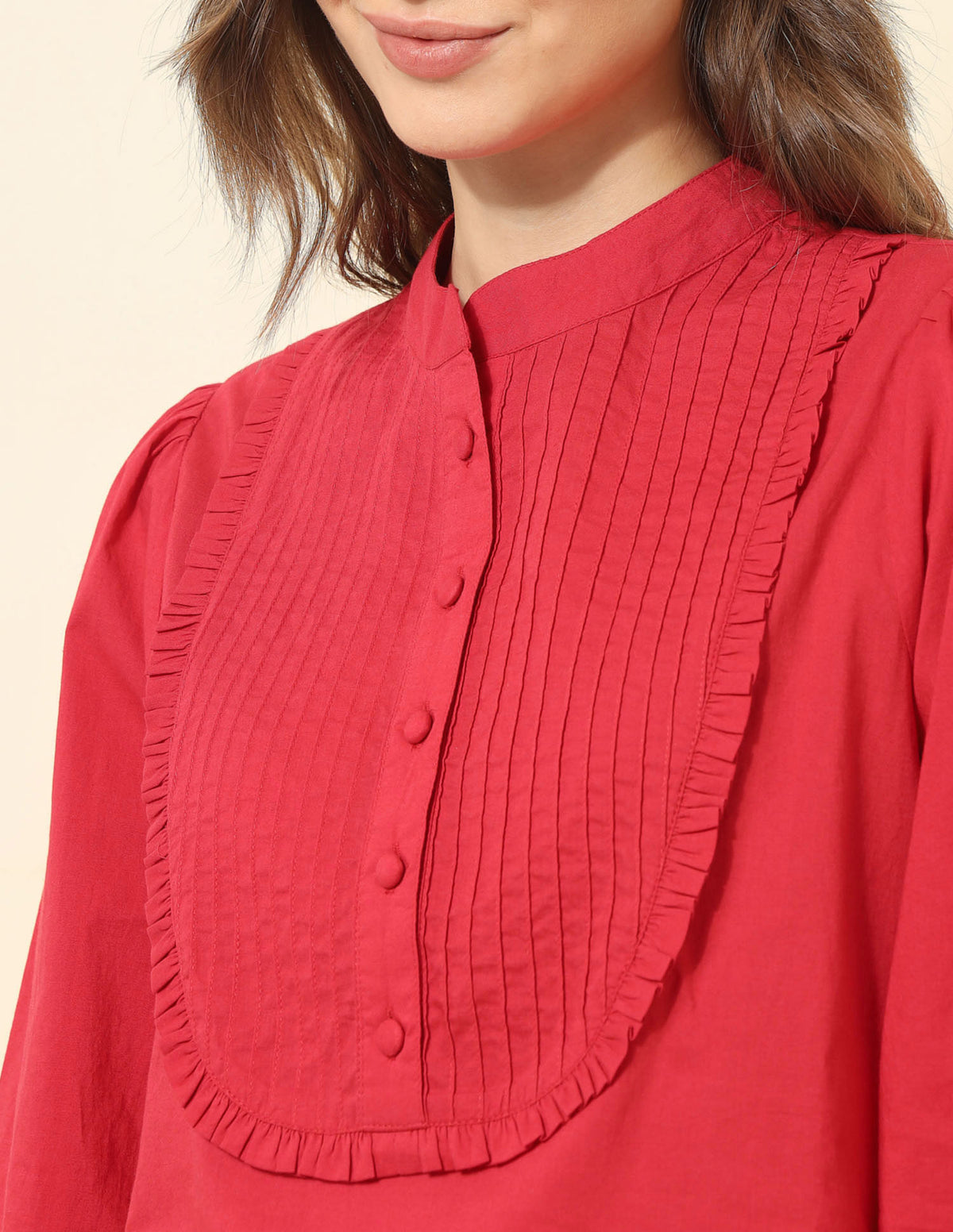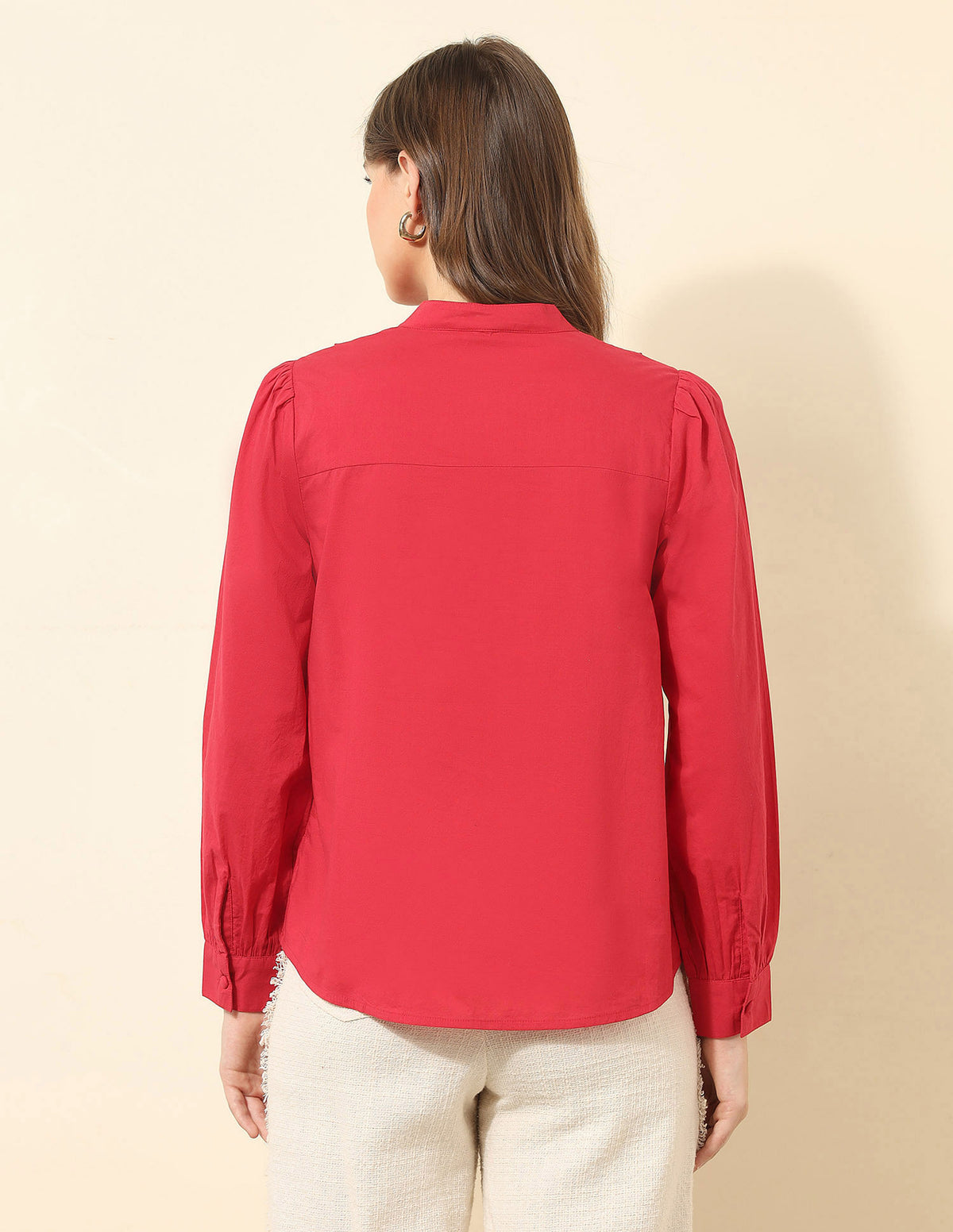 | Mandarin collar | Lace detailed yoke at chest | Gathered near yoke | Small button placket closure | Long sleeves | Straight hemline | Solid pattern | Regular weave | Relaxed fit |