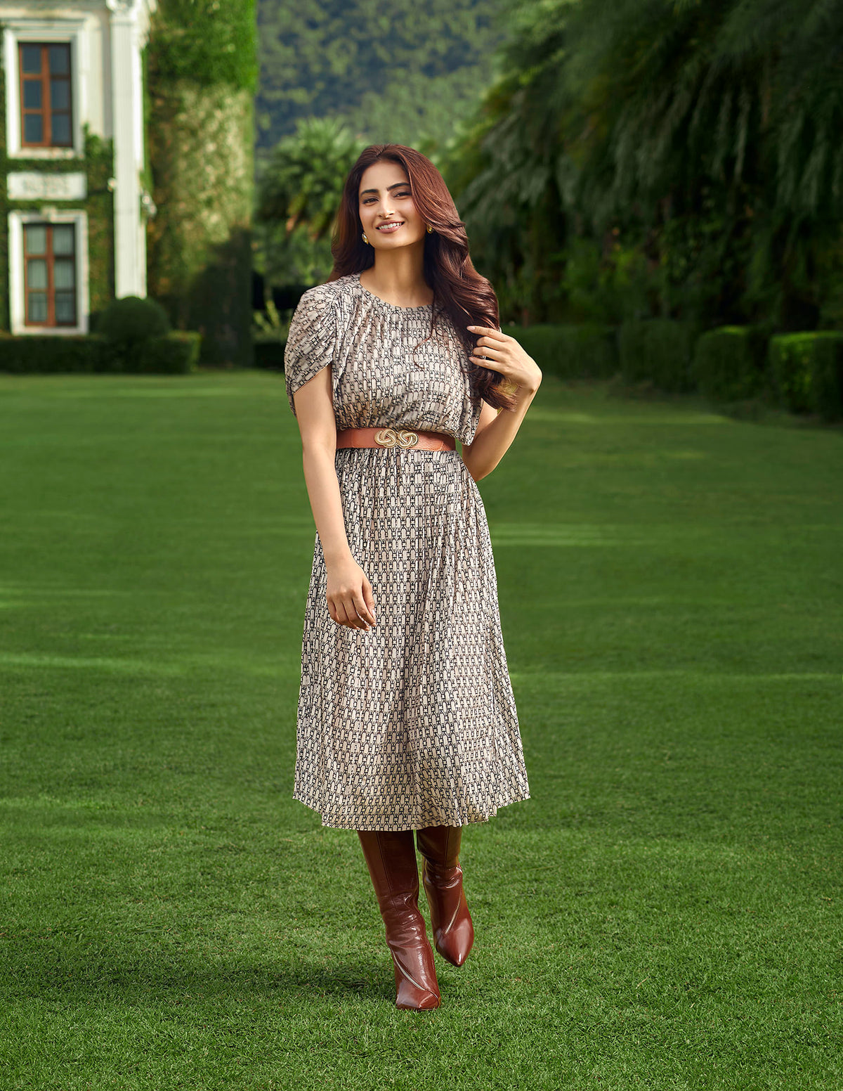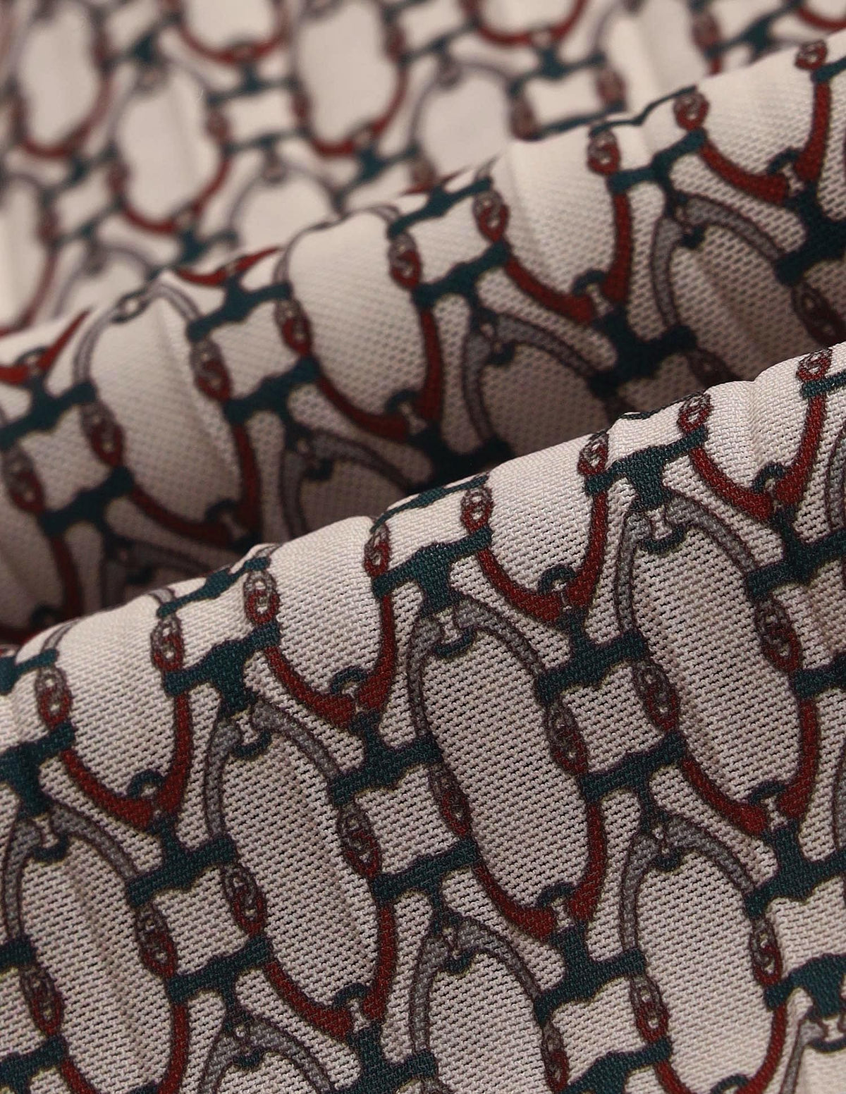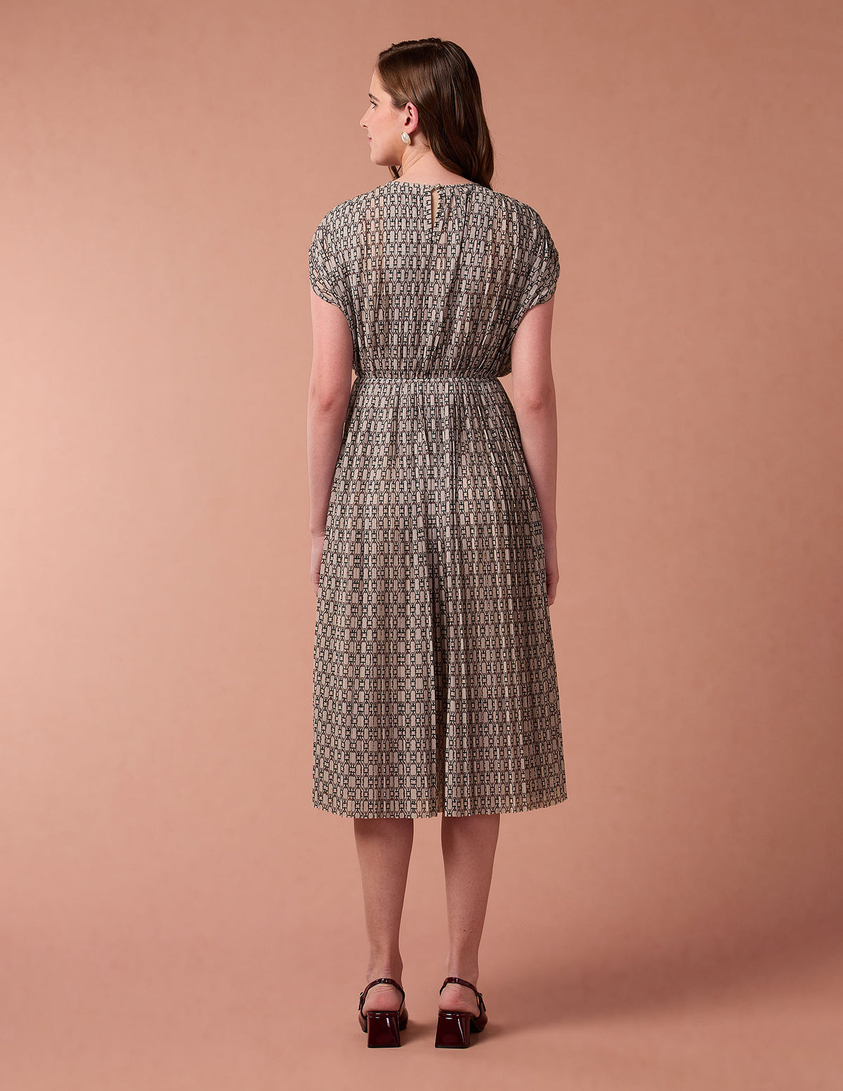 | Round neck | Sleeveless | Button and loop closure at back | Bathered at waist | Abstract printed pattern | Knitted |
