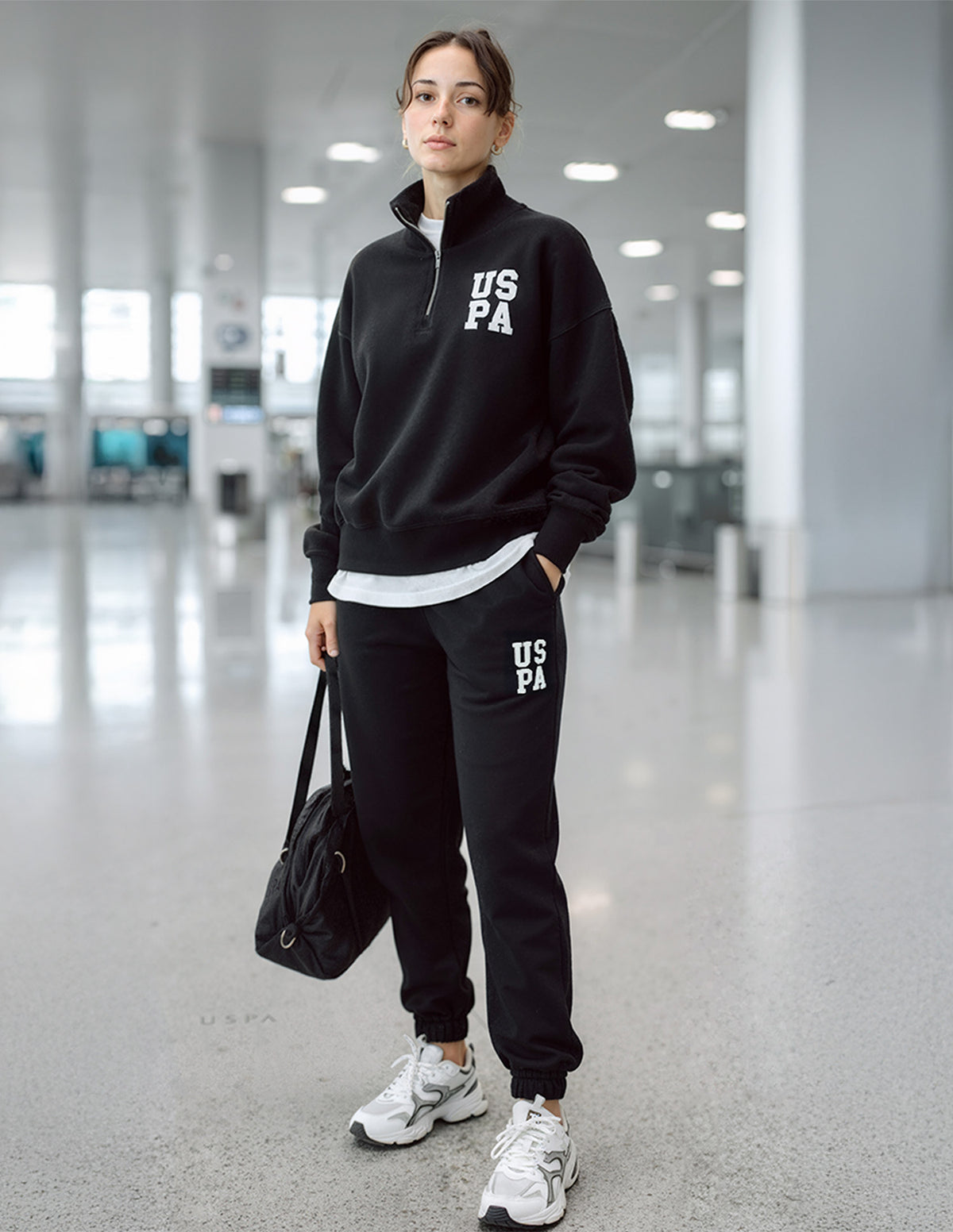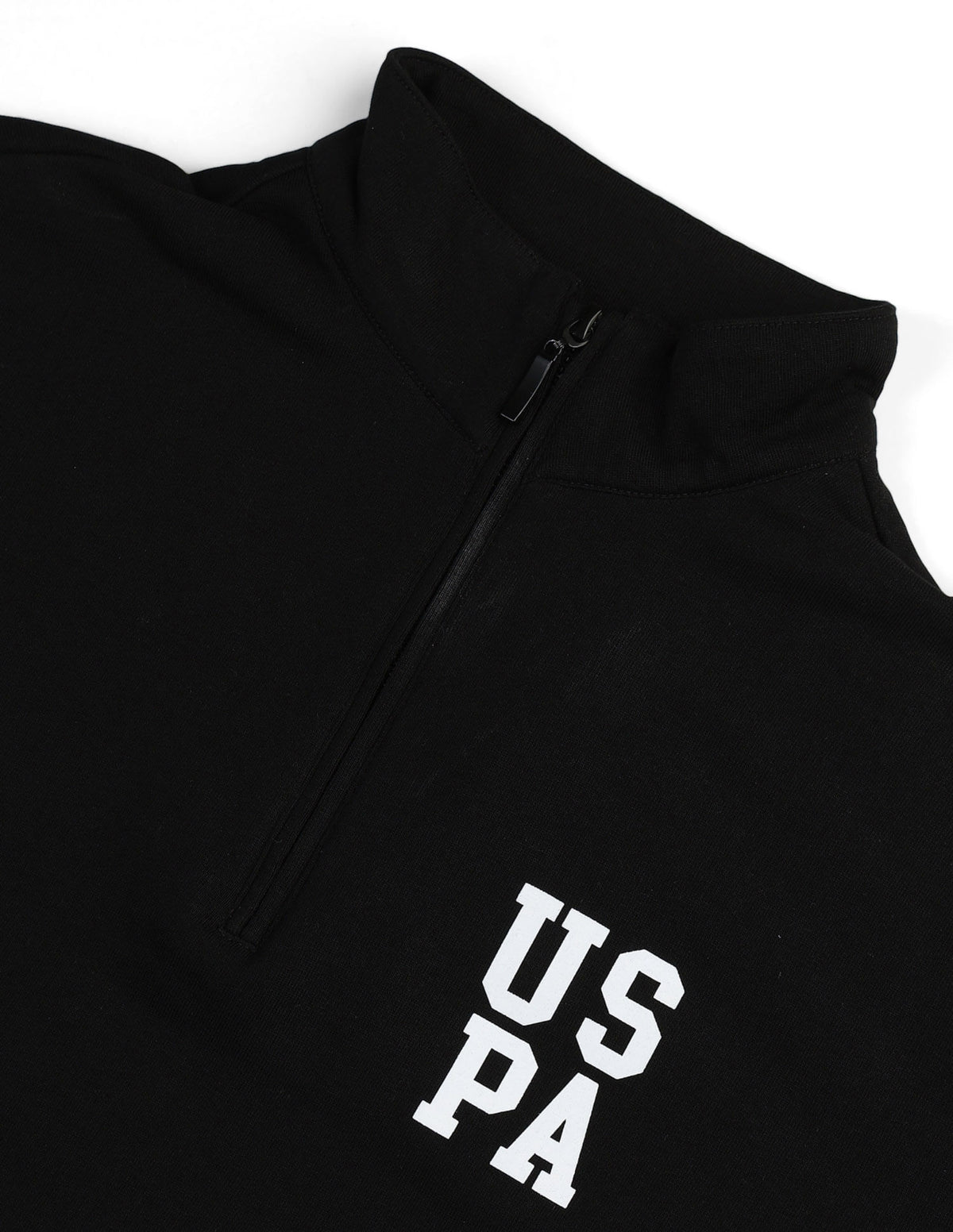 | Stand neck | Brand embroidered at chest | Half zipper closure | Long sleeves | Ribbed sleeve hems and hemline | Solid pattern | Knitted | Regular fit |