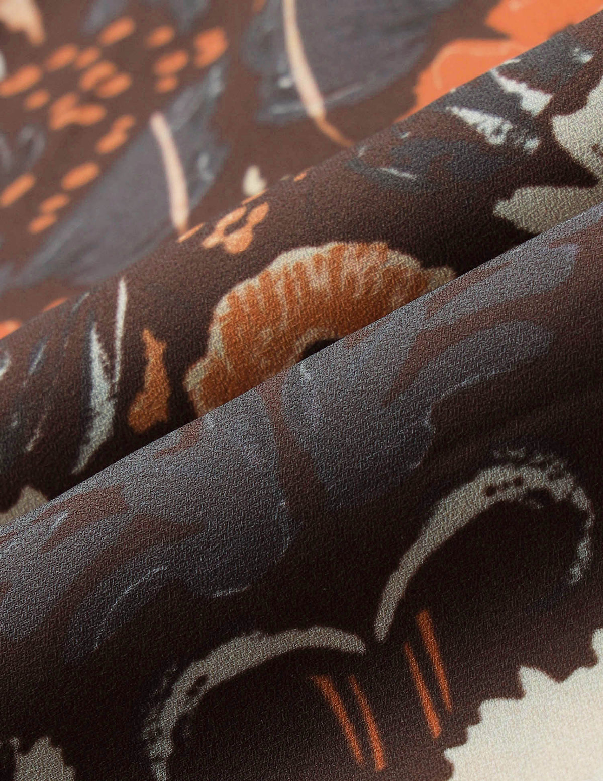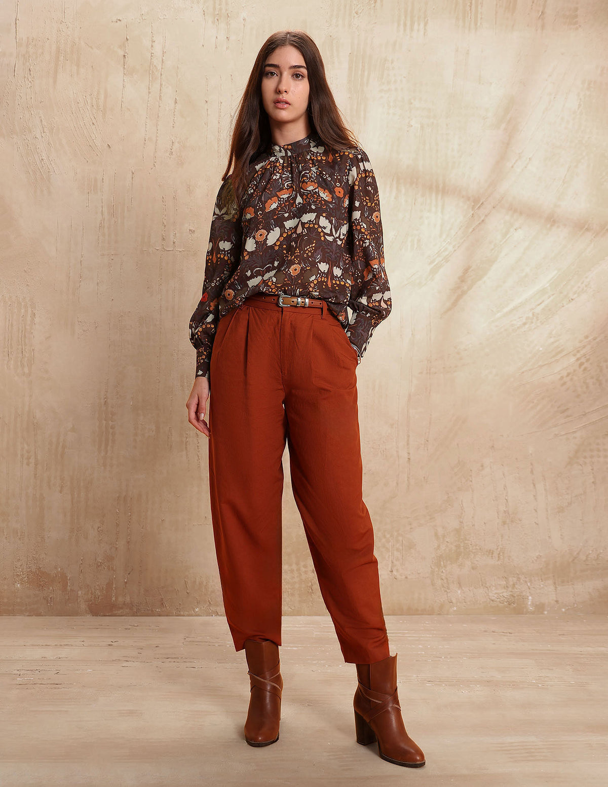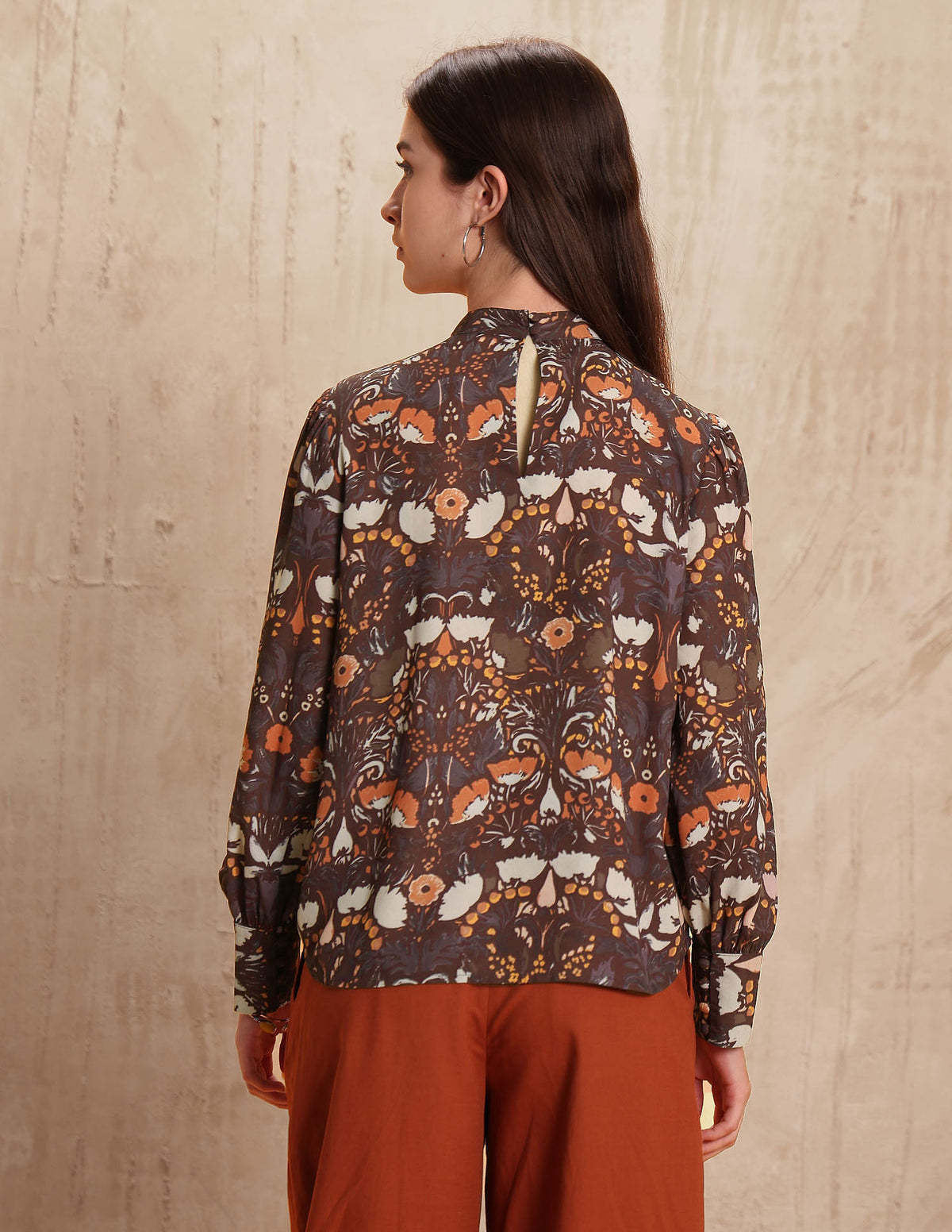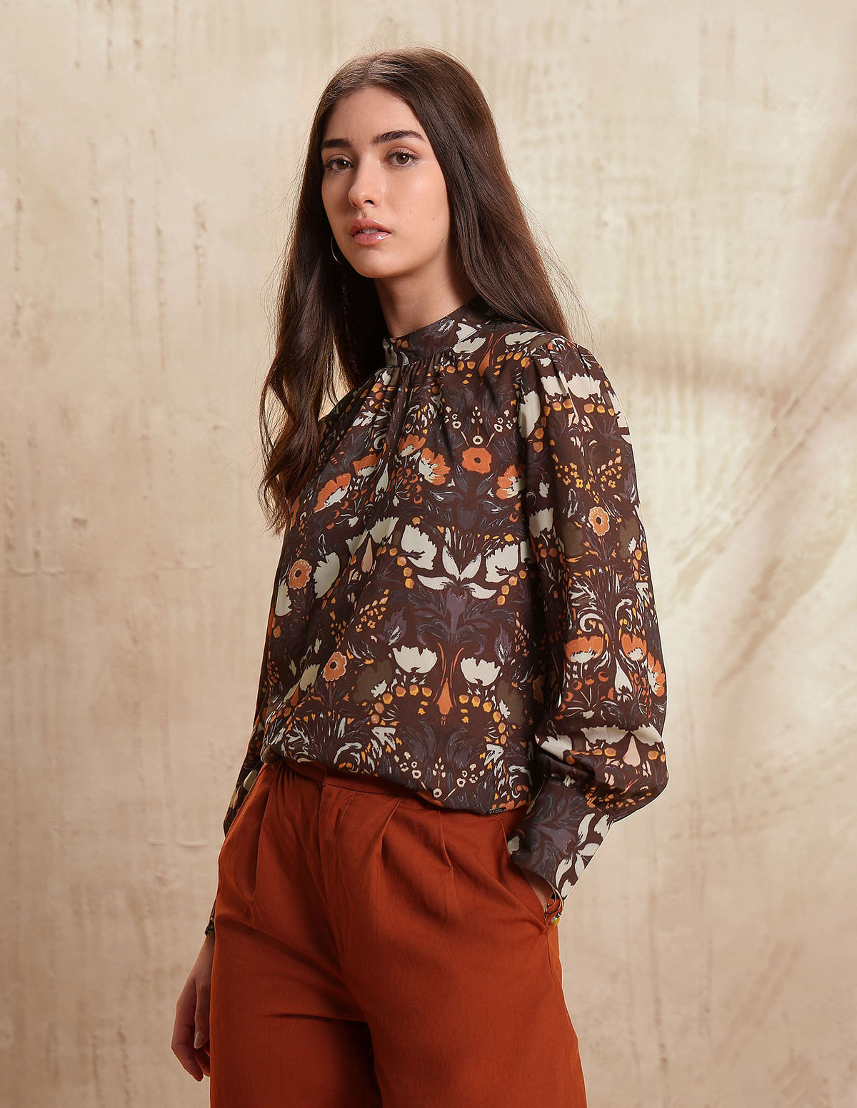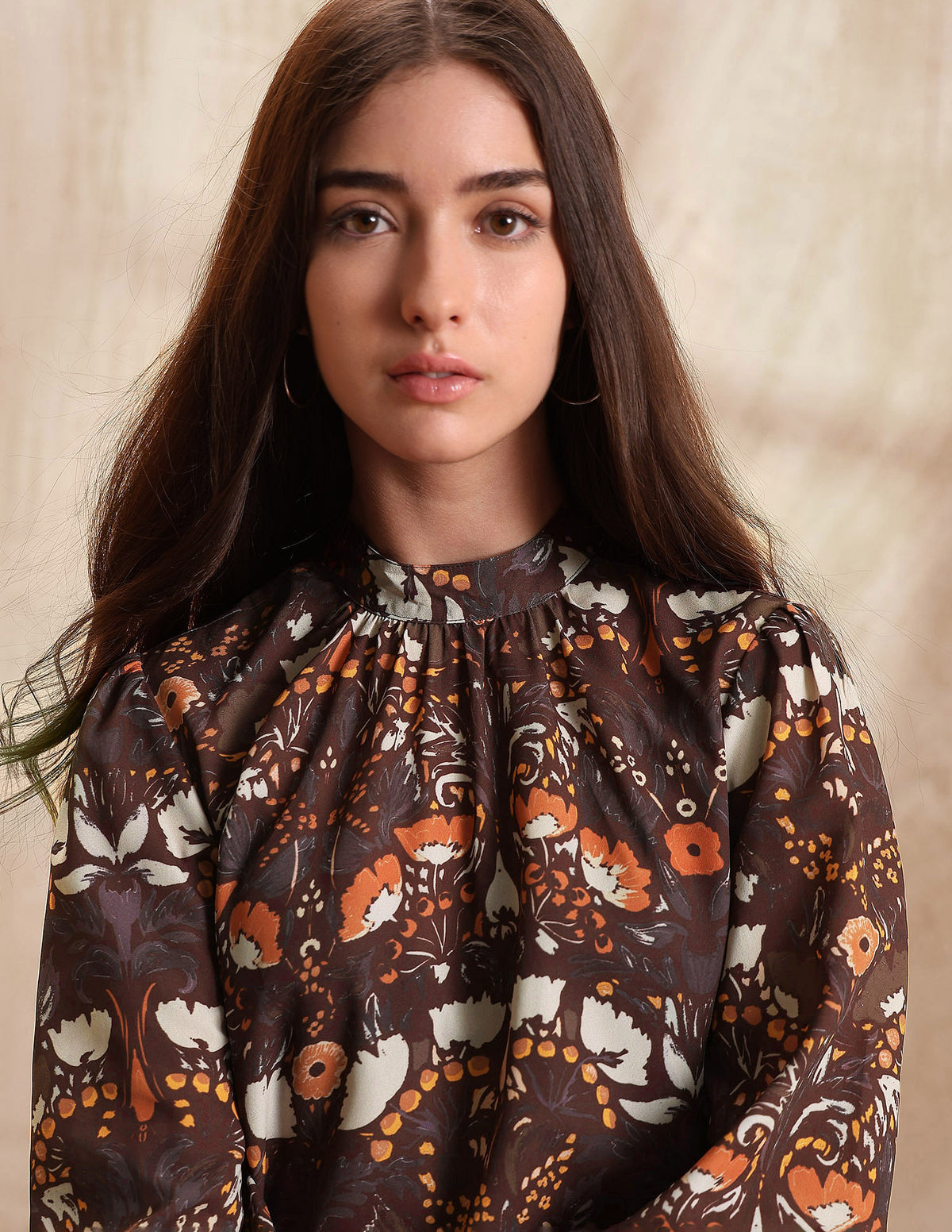 | High neck | Gathered near yoke | Button and loop closure at back | Long sleeves with elasticized hems | Straight hemline | Abstract printed pattern | Regular weave | Regular fit |