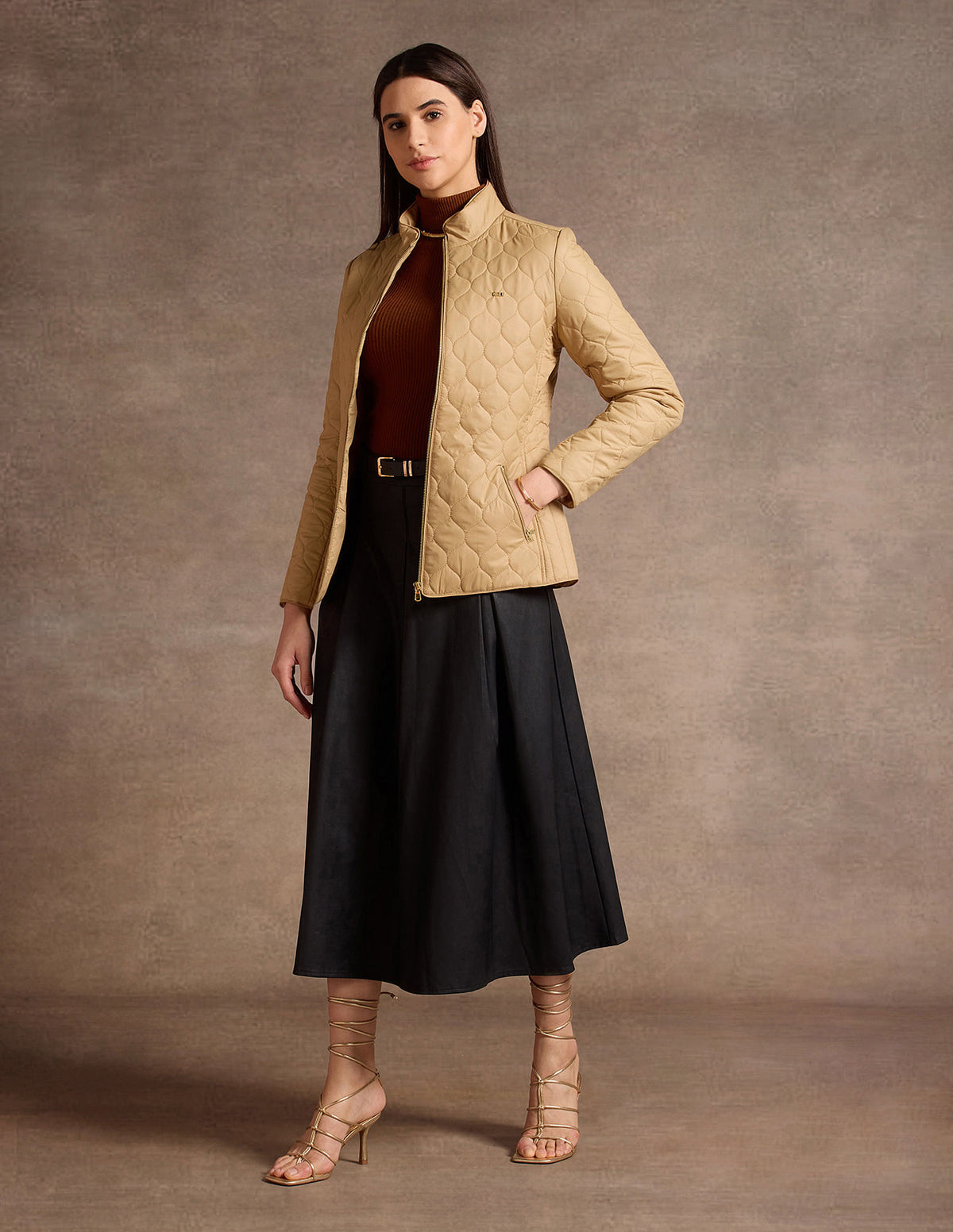 | High neck | Metallic logo at chest | Full zipper closure | Long sleeves | Straight hemline | Two pockets with zipper closure | Quilted construction | Solid pattern | Woven | Regular fit