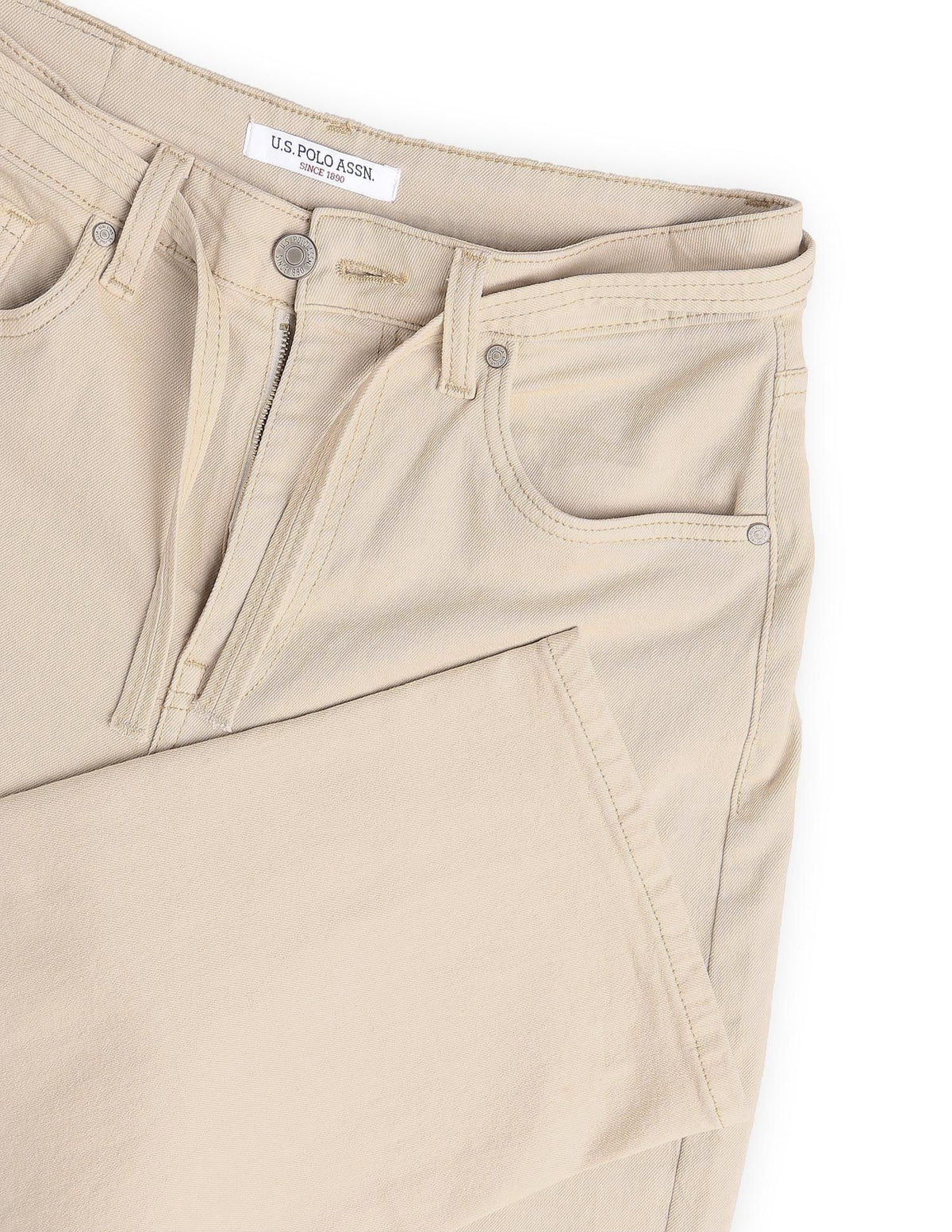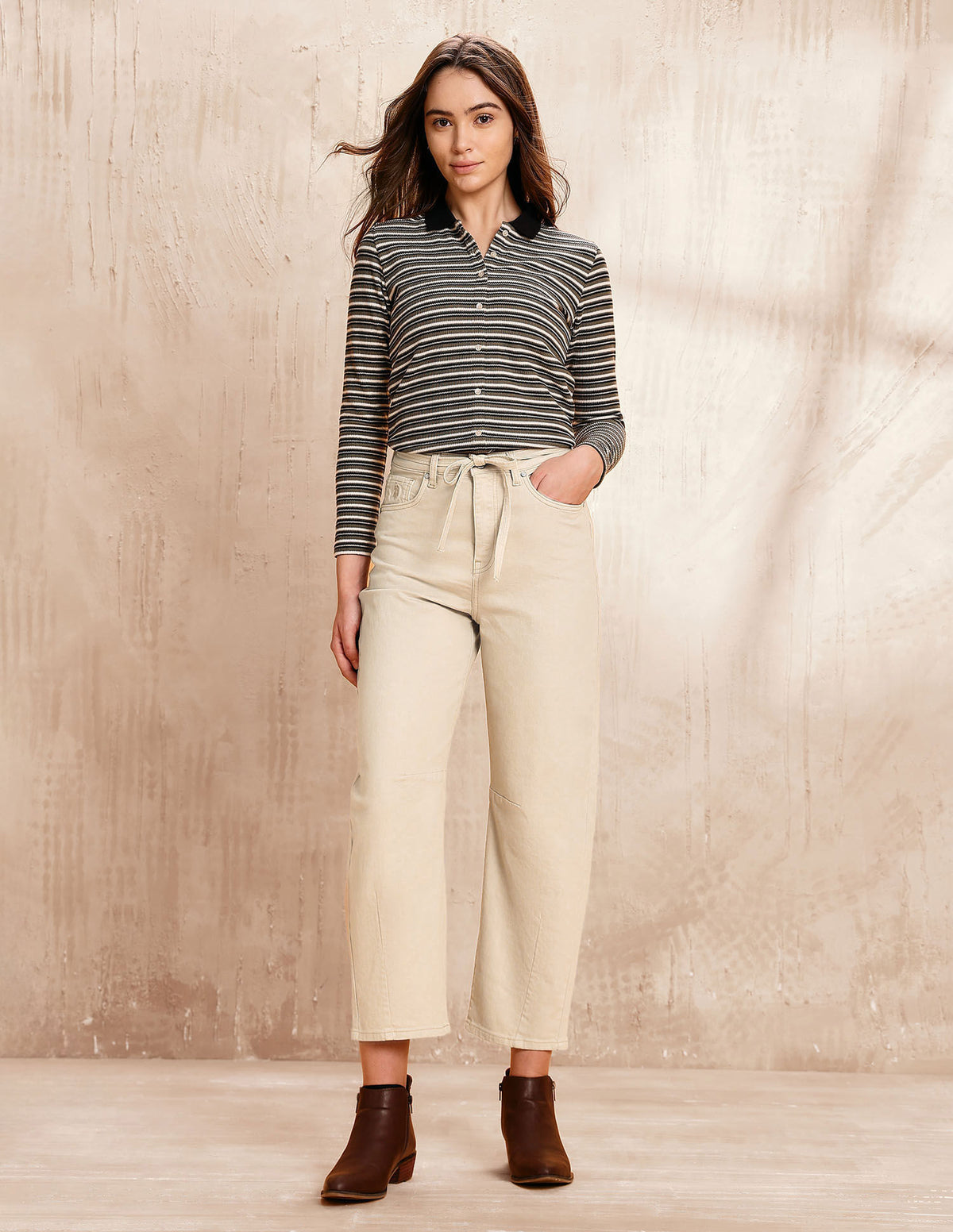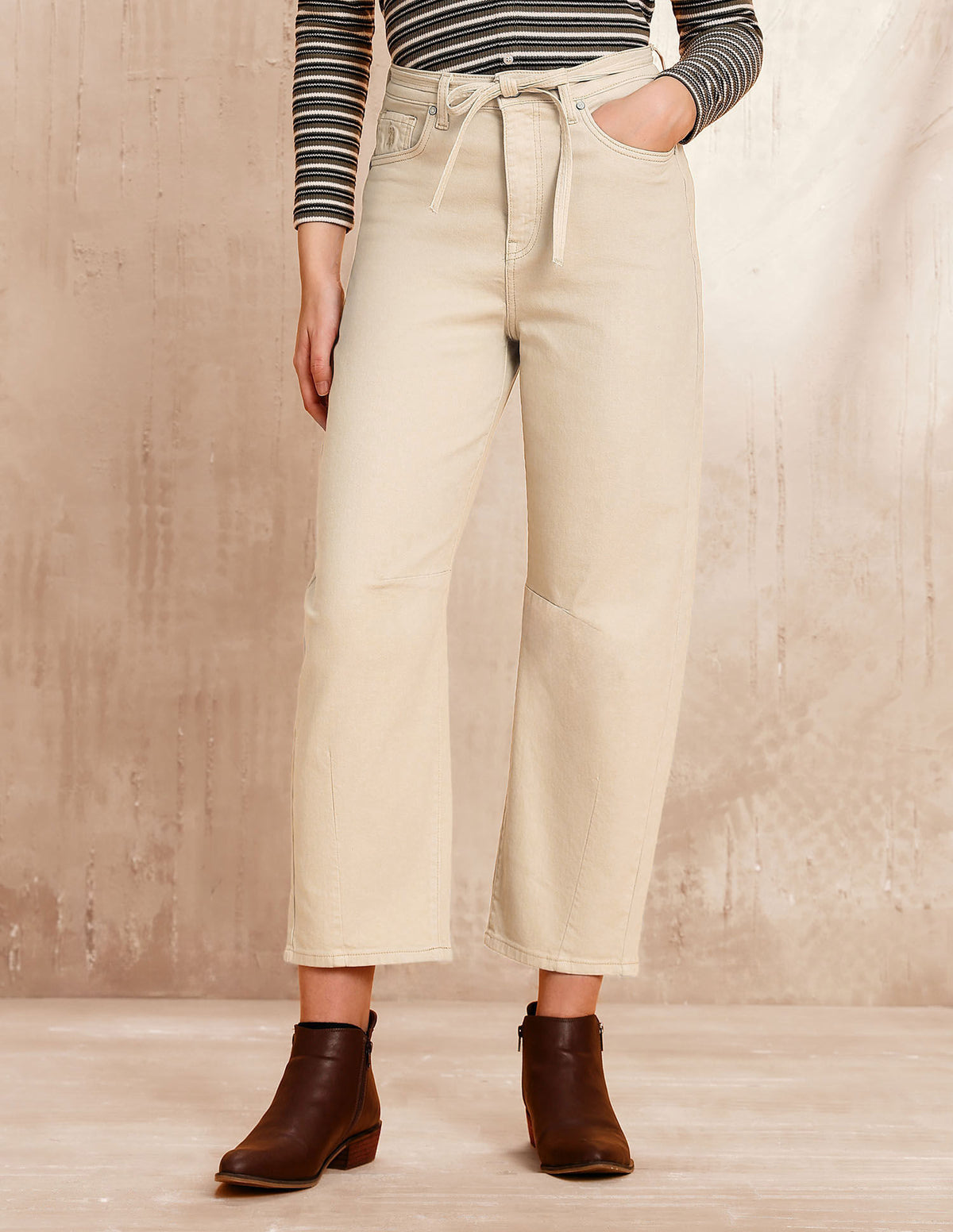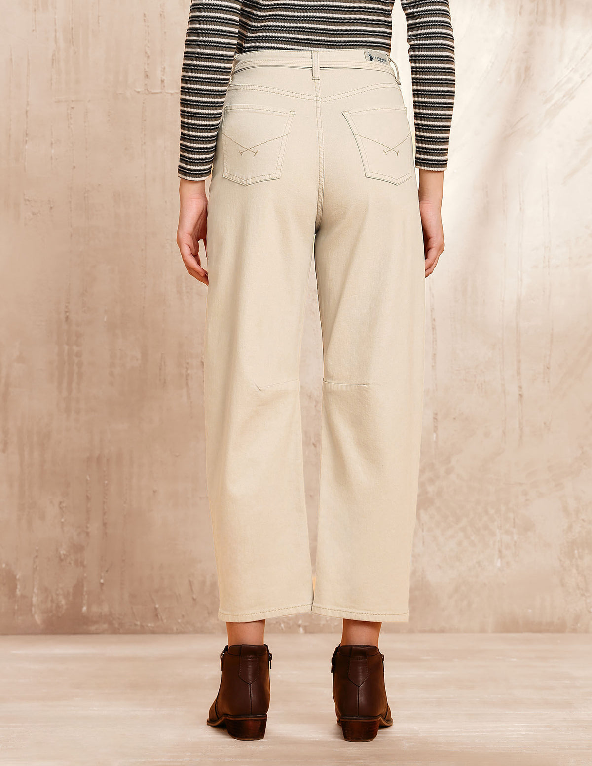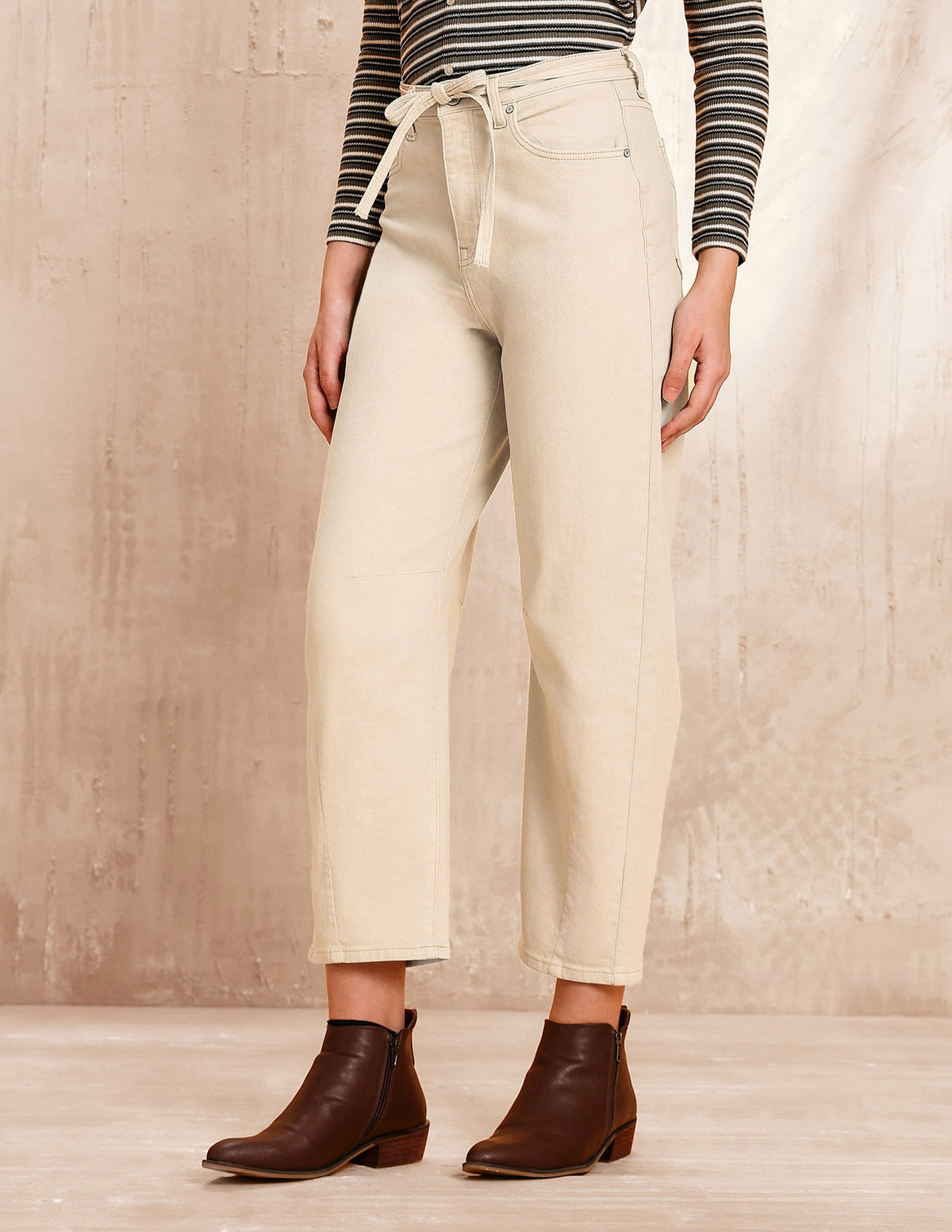 | High-rise waist | Button drawsting and zip fly closure | Five pockets | Denim weave | Barrel fit |