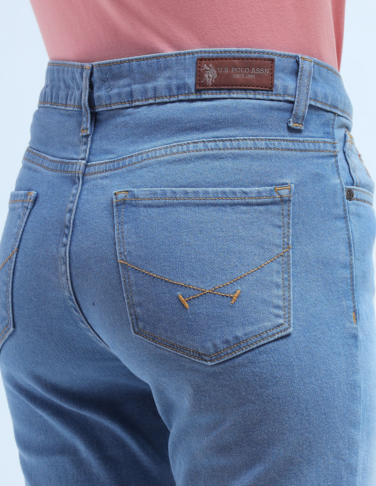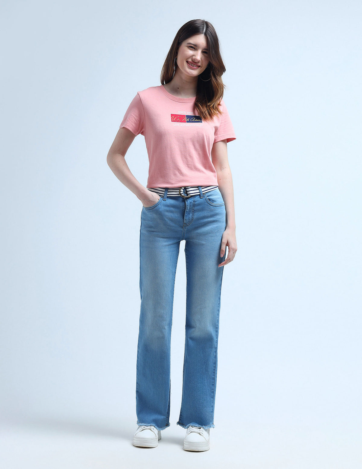 | High-rise waist | Button and zip fly closure | Five pockets | Stonewashed | Denim weave | Bootcut fit