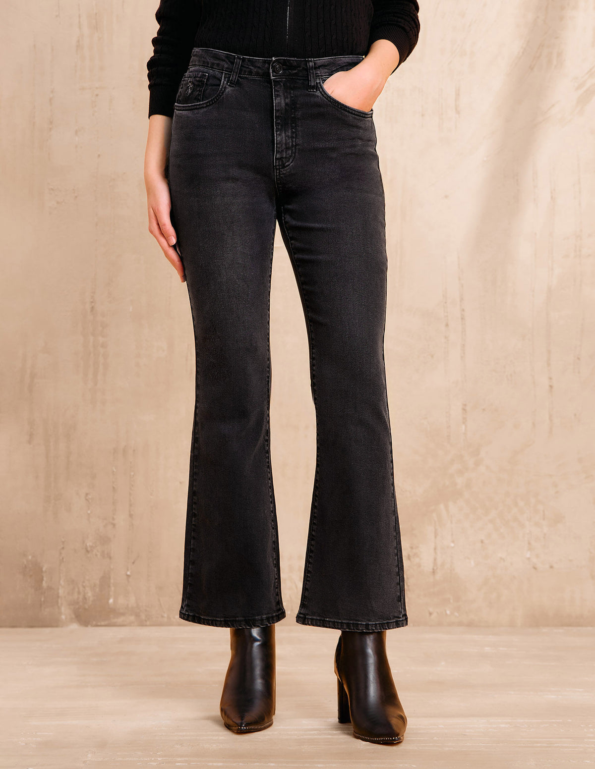 | High-rise waist | Button and zip fly closure | Five pockets | Stone washed | Denim weave | Bootcut fit |