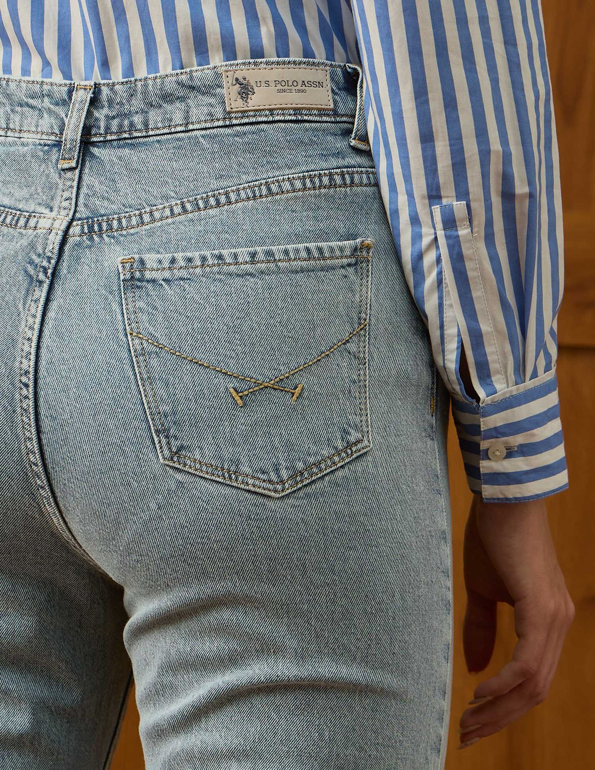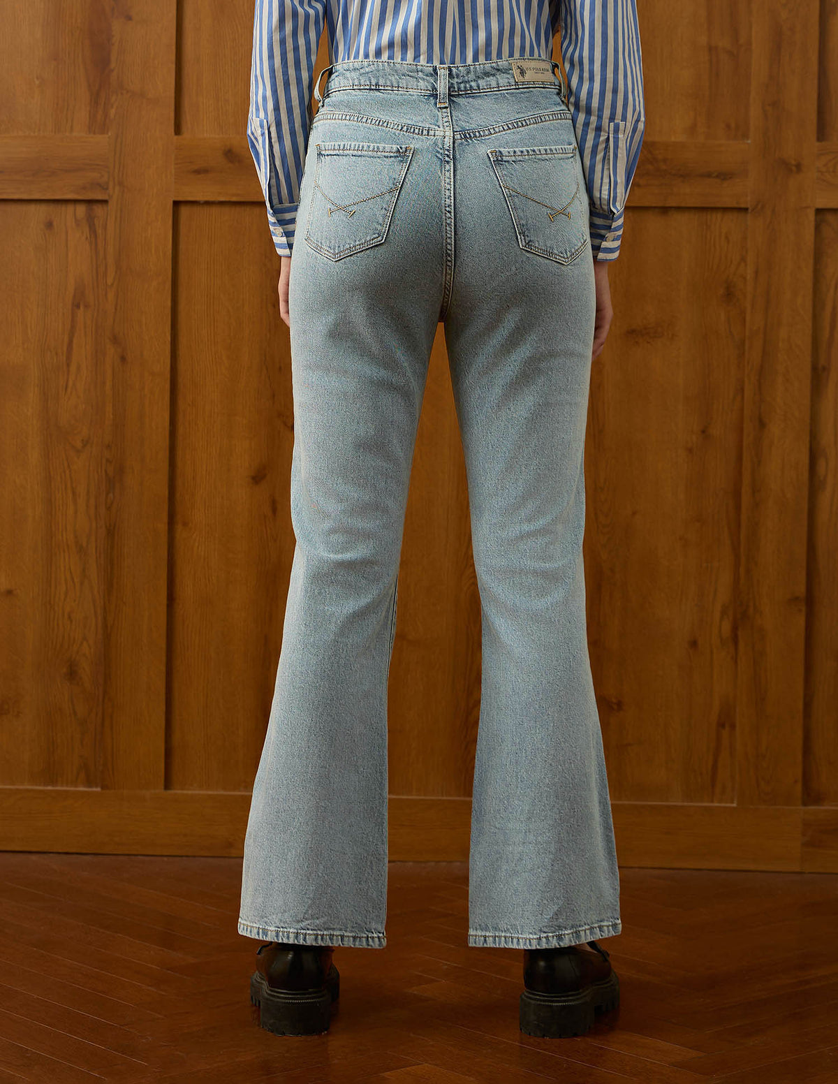 | High-rise waist | Button and zip fly closure | Five pockets | Stonewash | Denim weave | Bootcut |