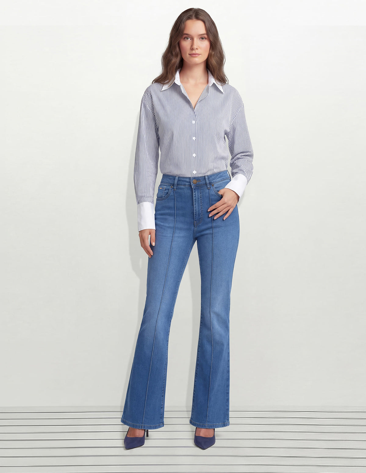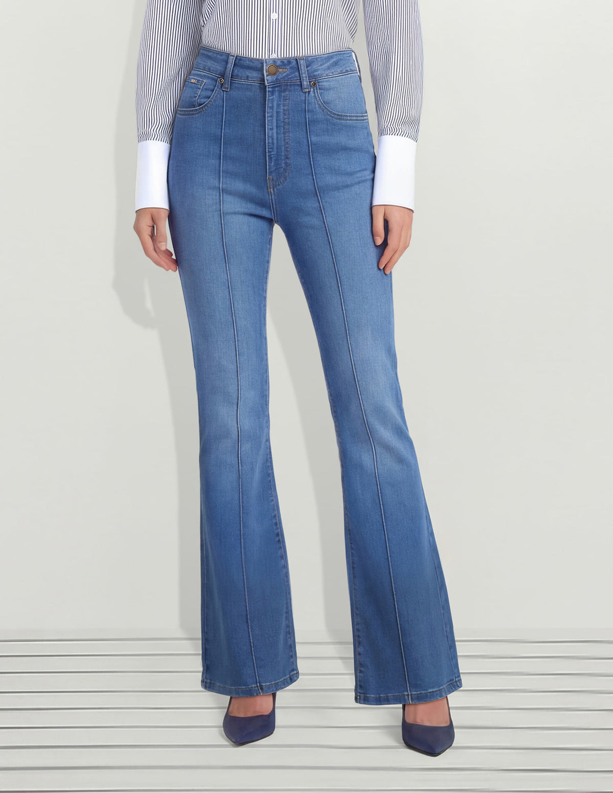 | High-rise waist | Button and zip fly closure | Five pockets | Denim weave | Bootcut |