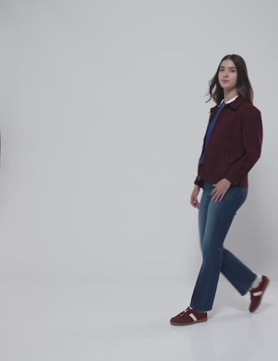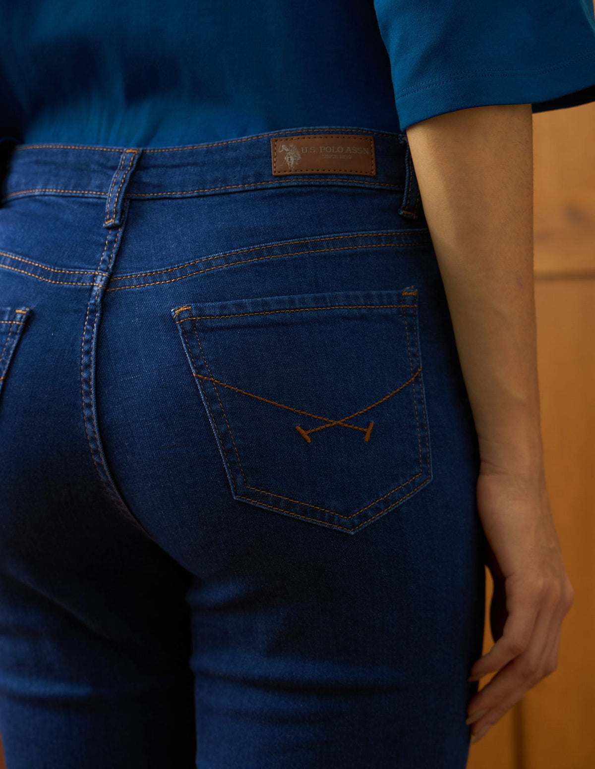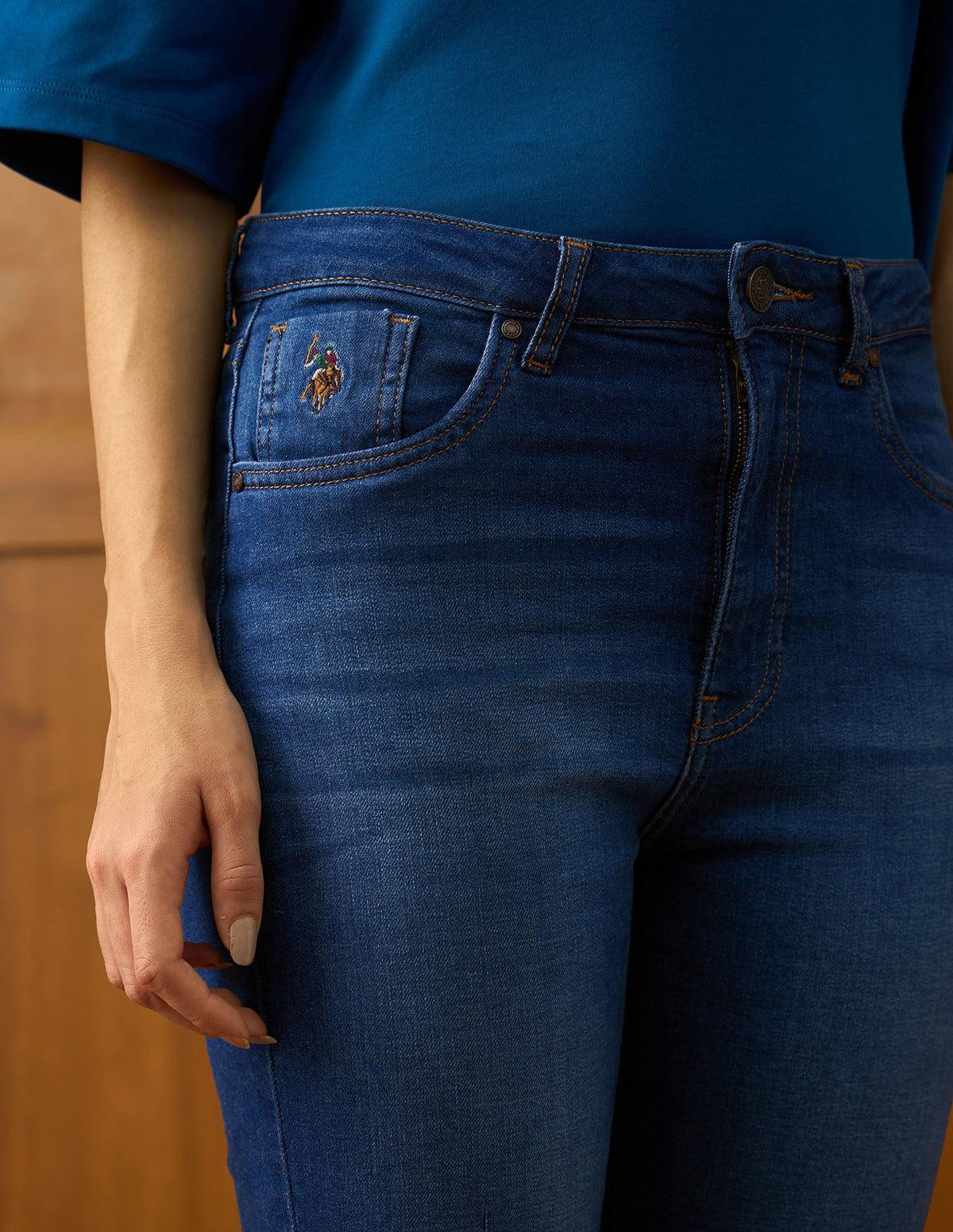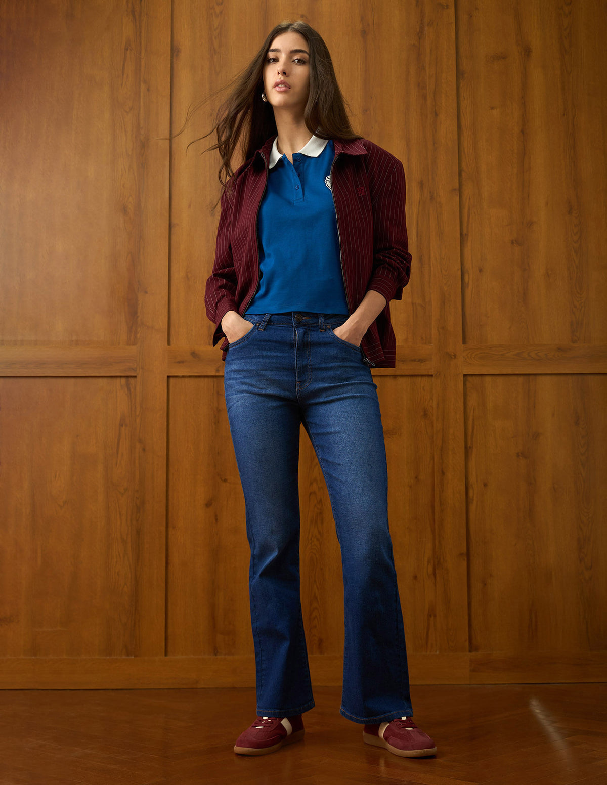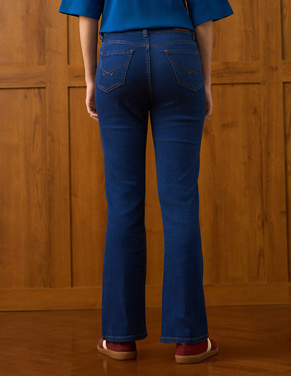 | High-rise waist | Button and zip fly closure | Five pockets | Stonewash | Denim weave | Bootcut |