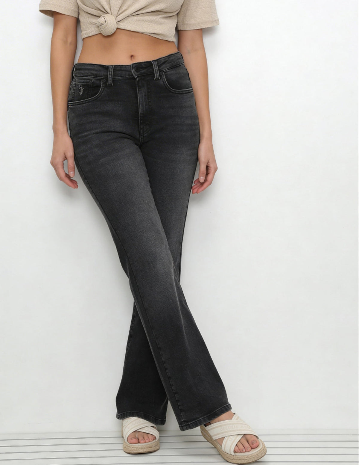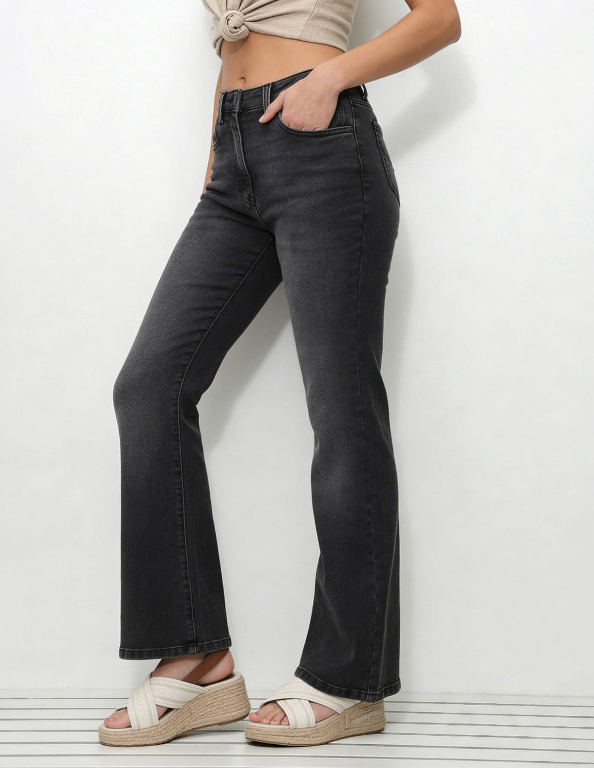 | High-rise waist | Button and zip fly closure | Five pockets | Denim weave | Bootcut |
