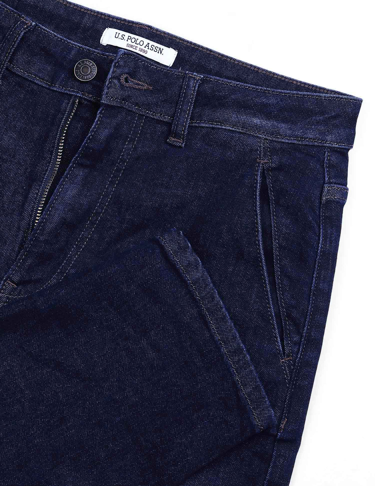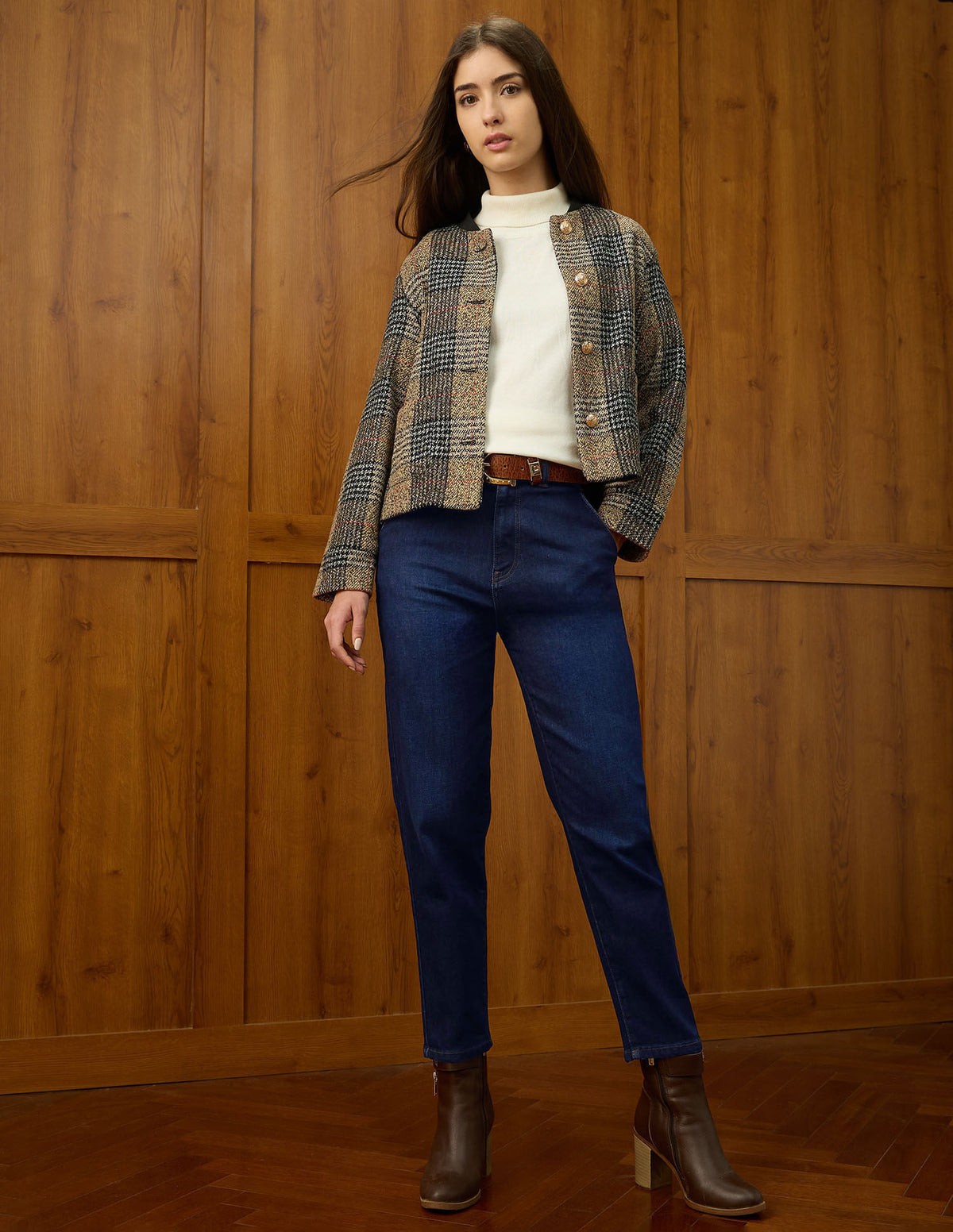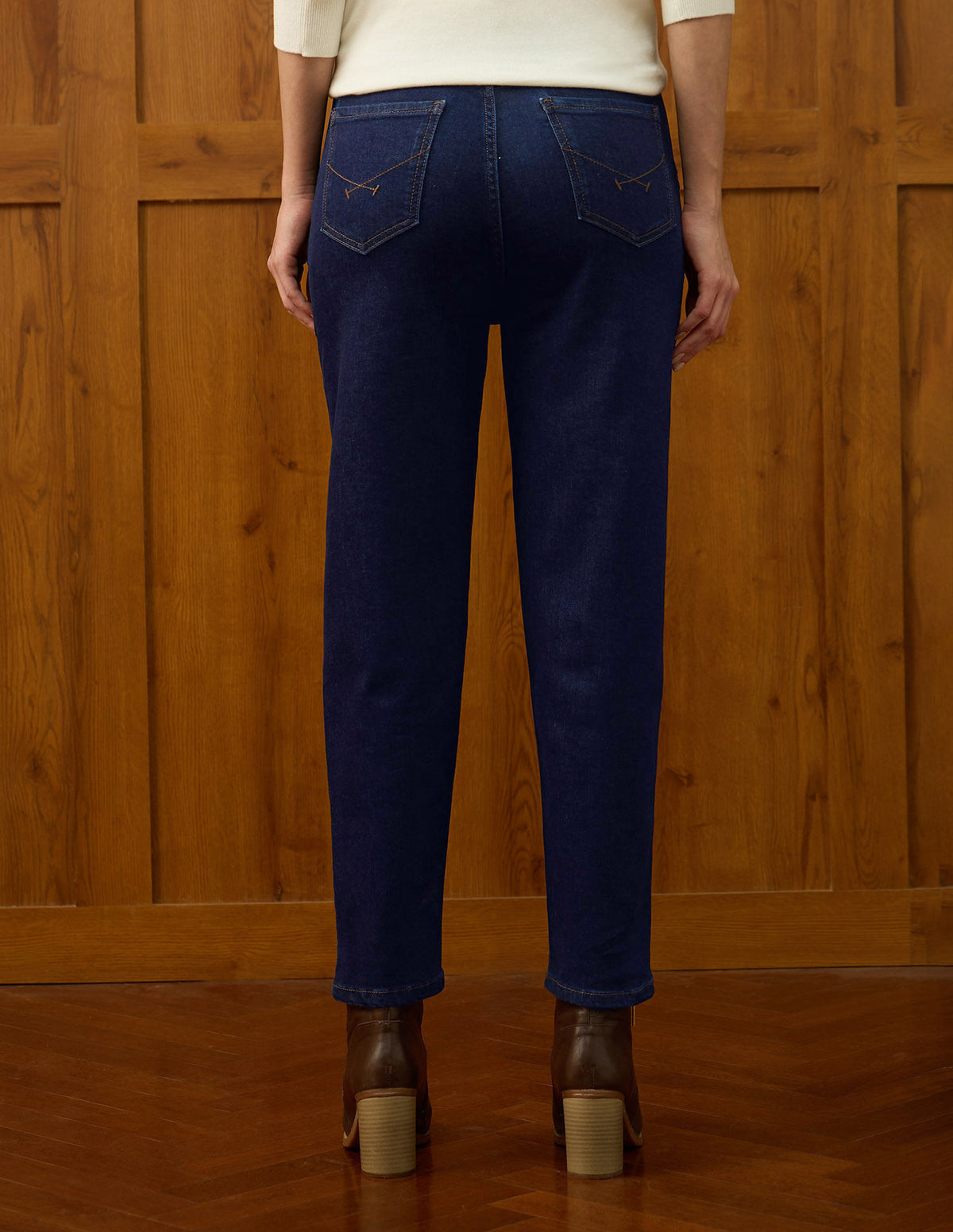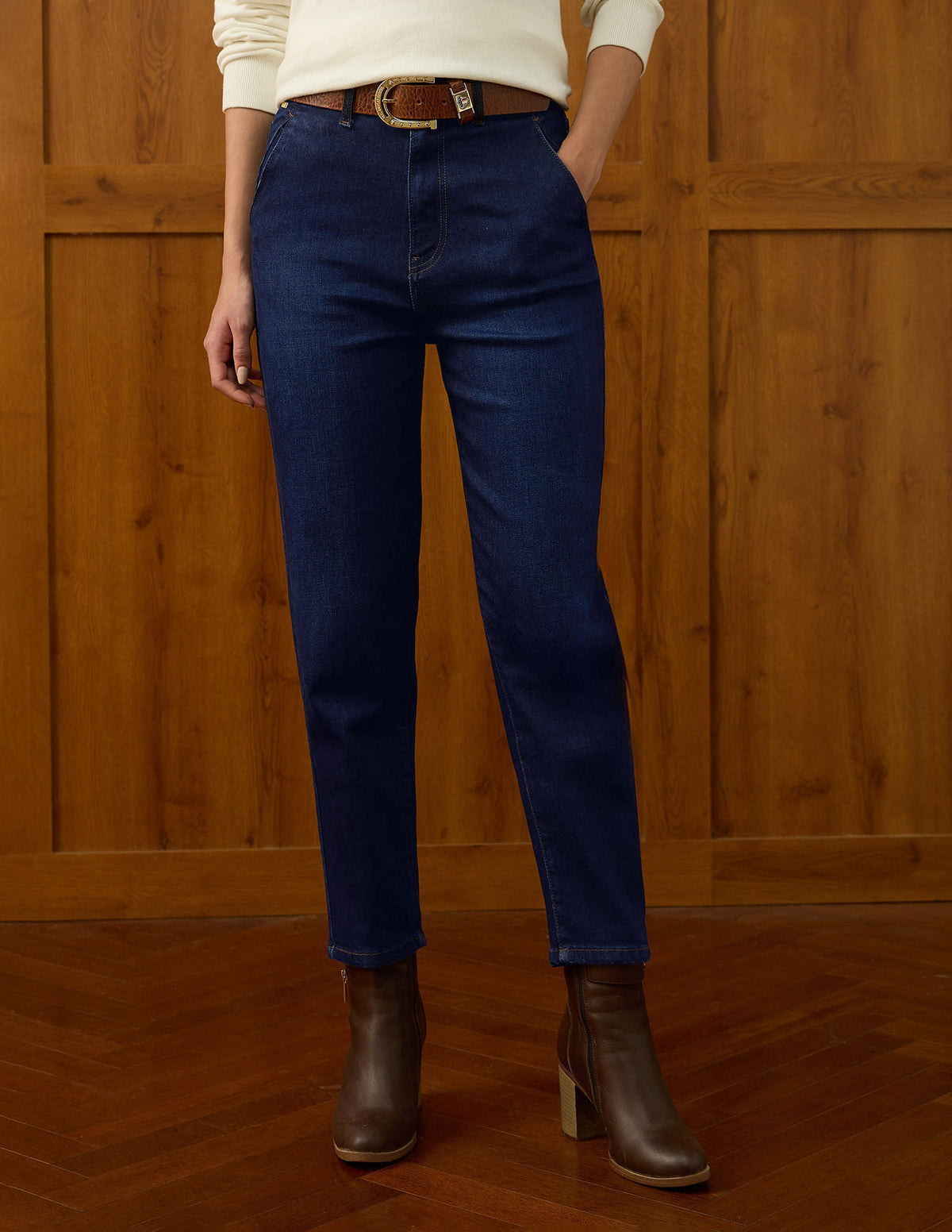 | High-rise waist | Button and zip fly closure | Five pockets | Dark wash | Denim weave | Carrot fit |