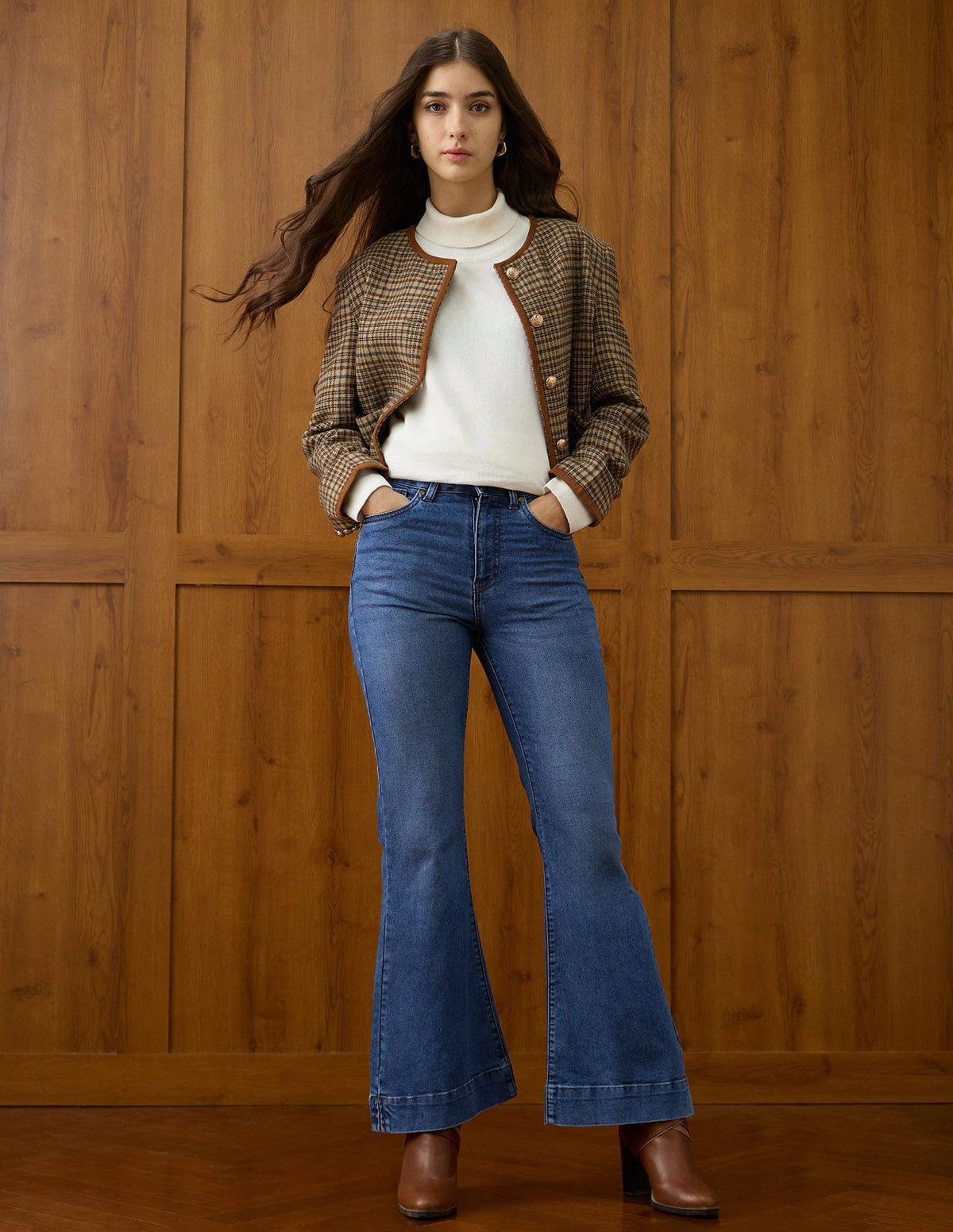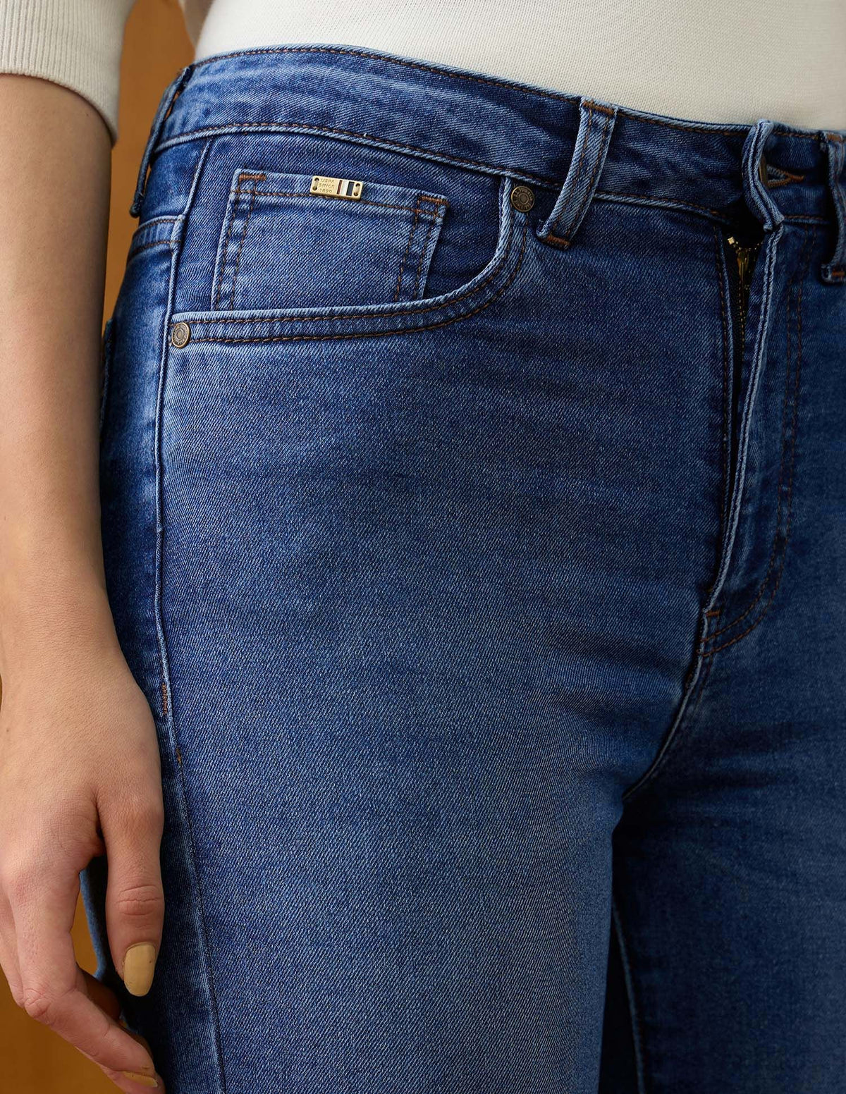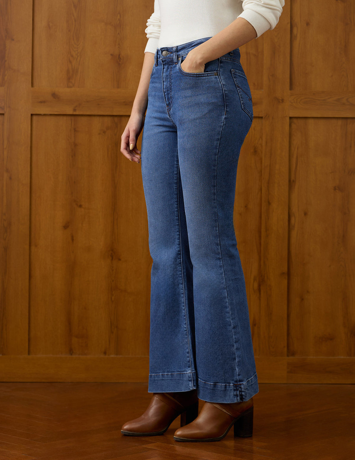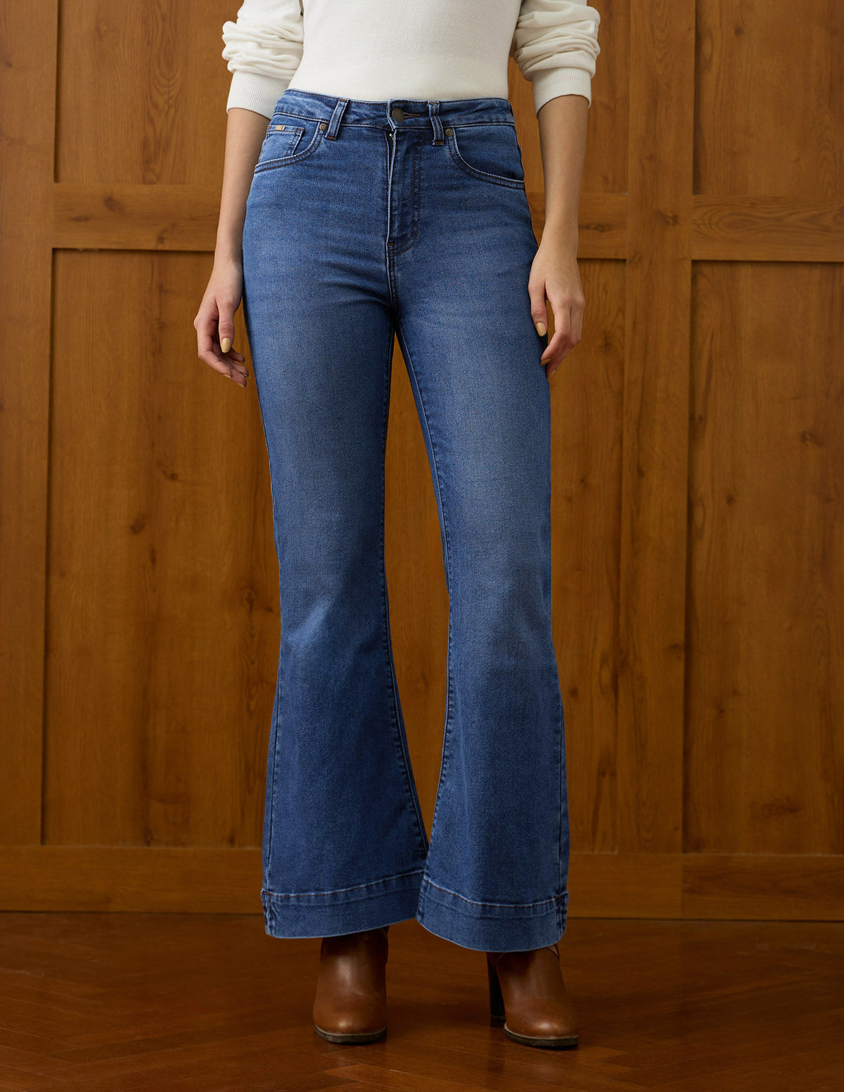 | High-rise waist | Button and zip fly closure | Five pockets | Stonewash | Denim weave | Extreme flared fit |