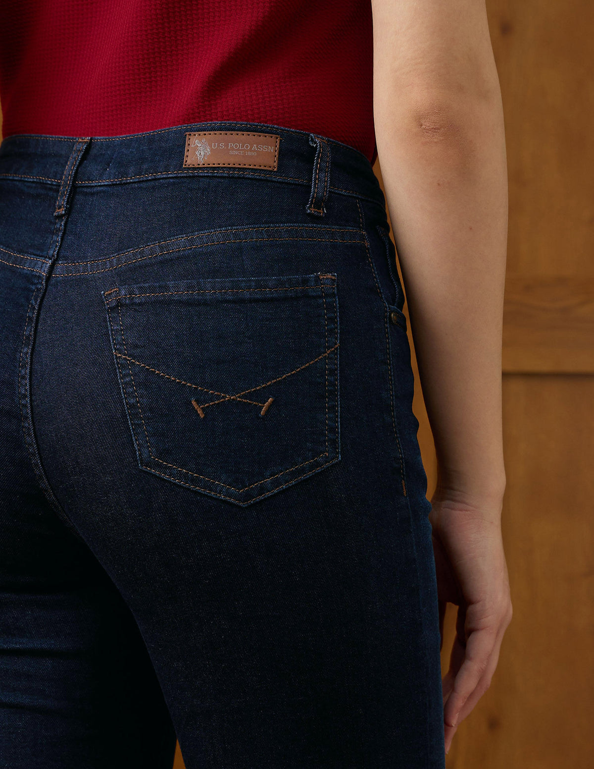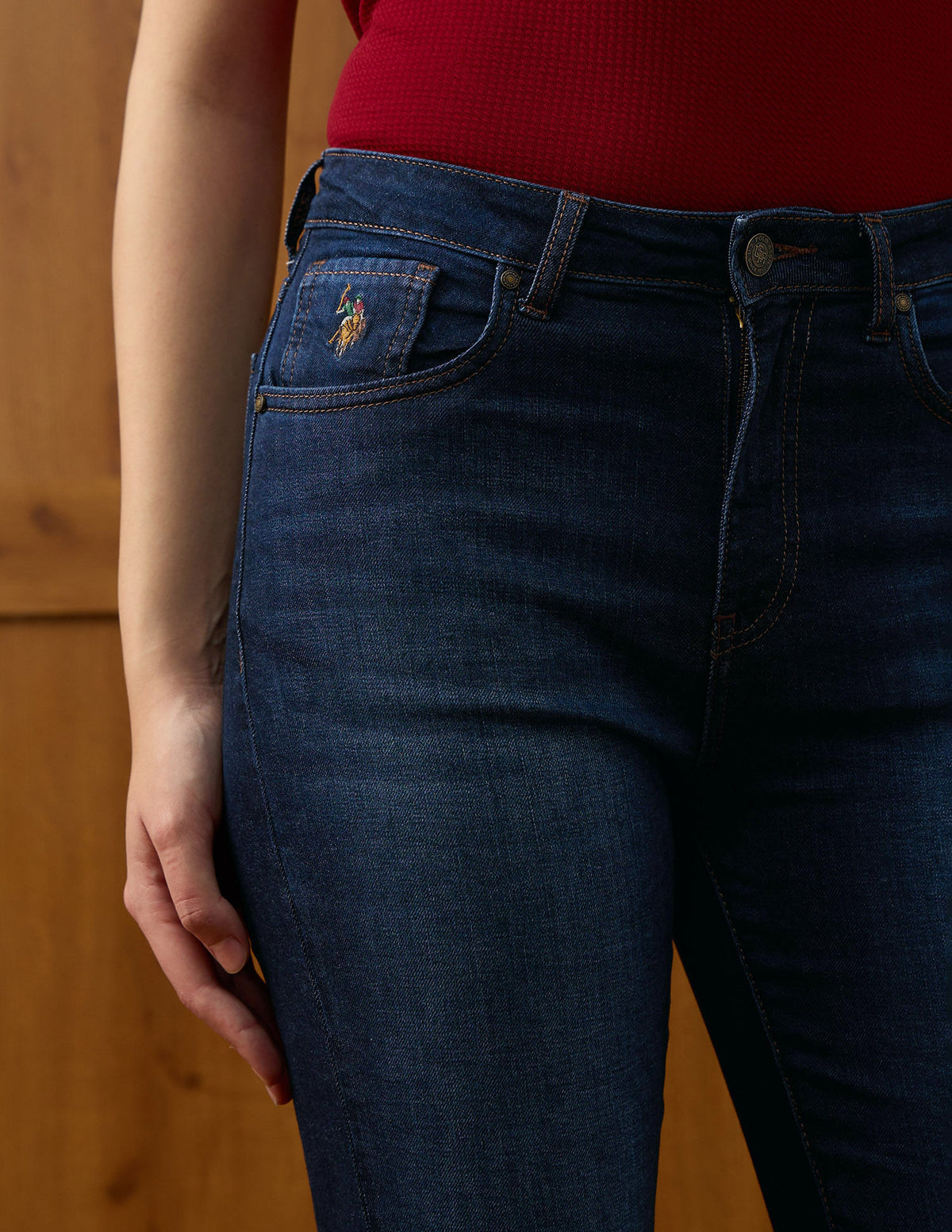 | High-rise waist | Button and zip fly closure | Five pockets | Whiskered | Denim weave | Extreme flared fit |