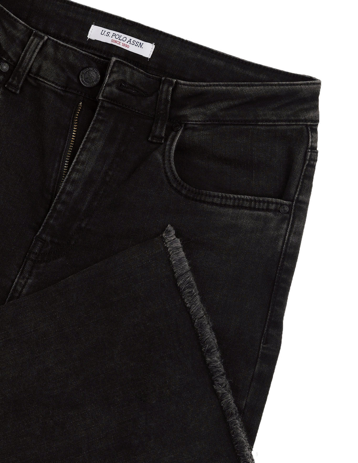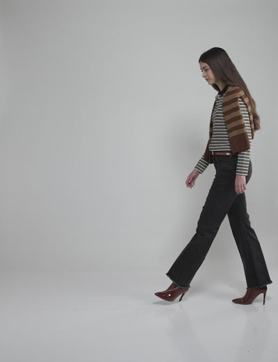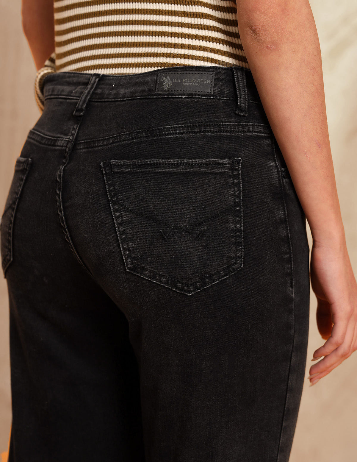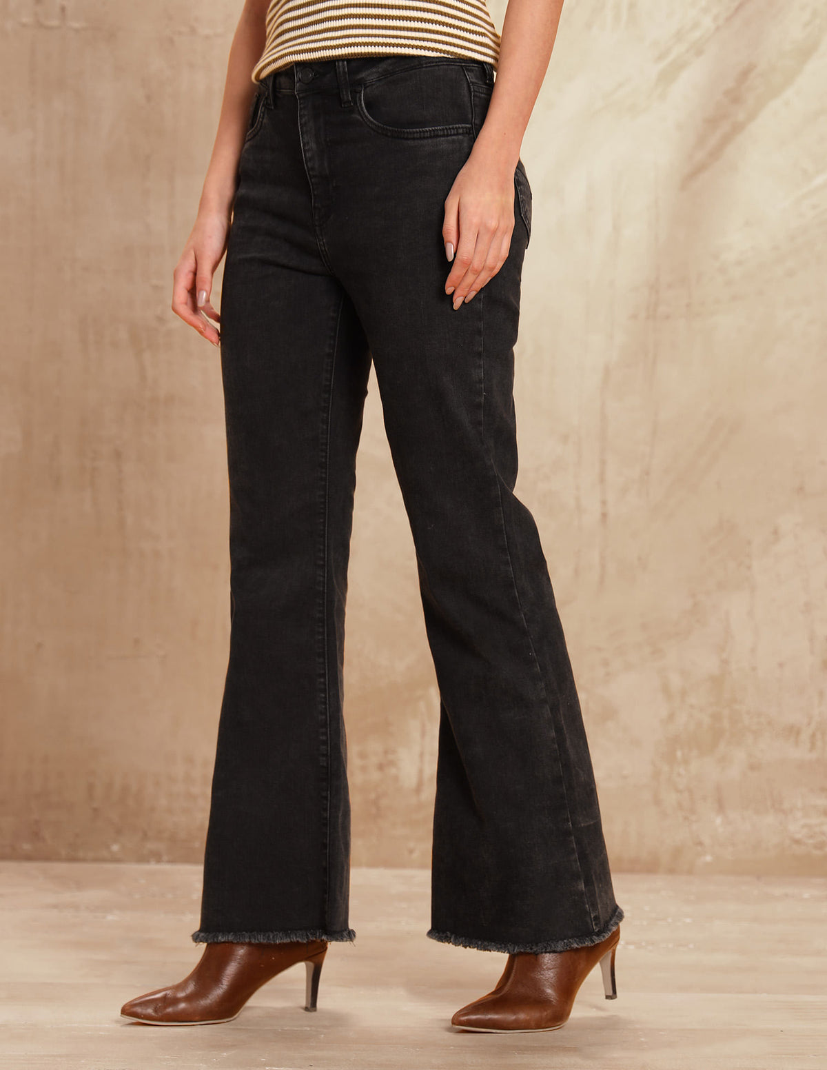 | High-rise waist | Button and zip fly closure | Five pockets | Dark washed | Denim weave | Flared fit |