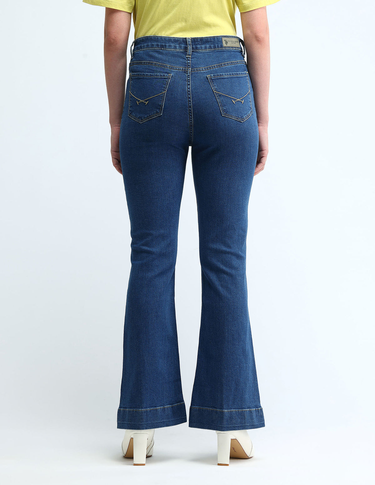 High-rise waist | Button and zip fly closure | Five pockets | Stonewashed | Clean look | Denim weave | Flared fit |