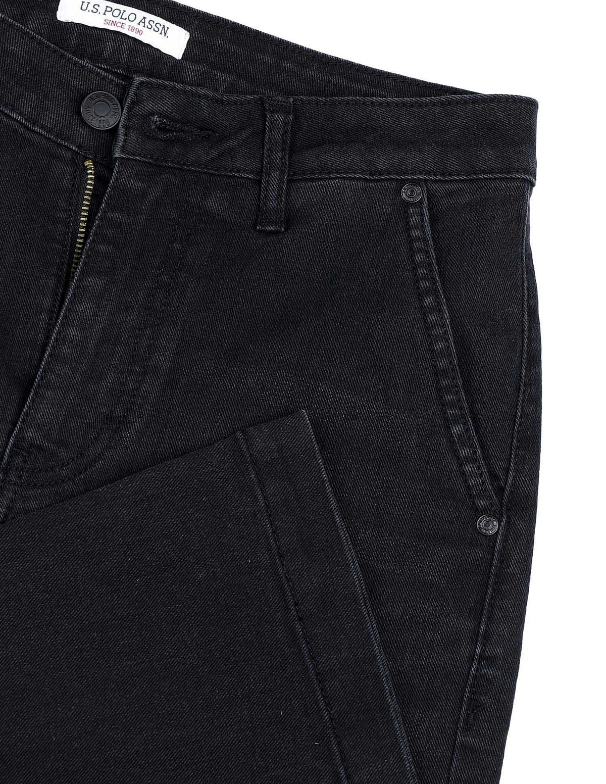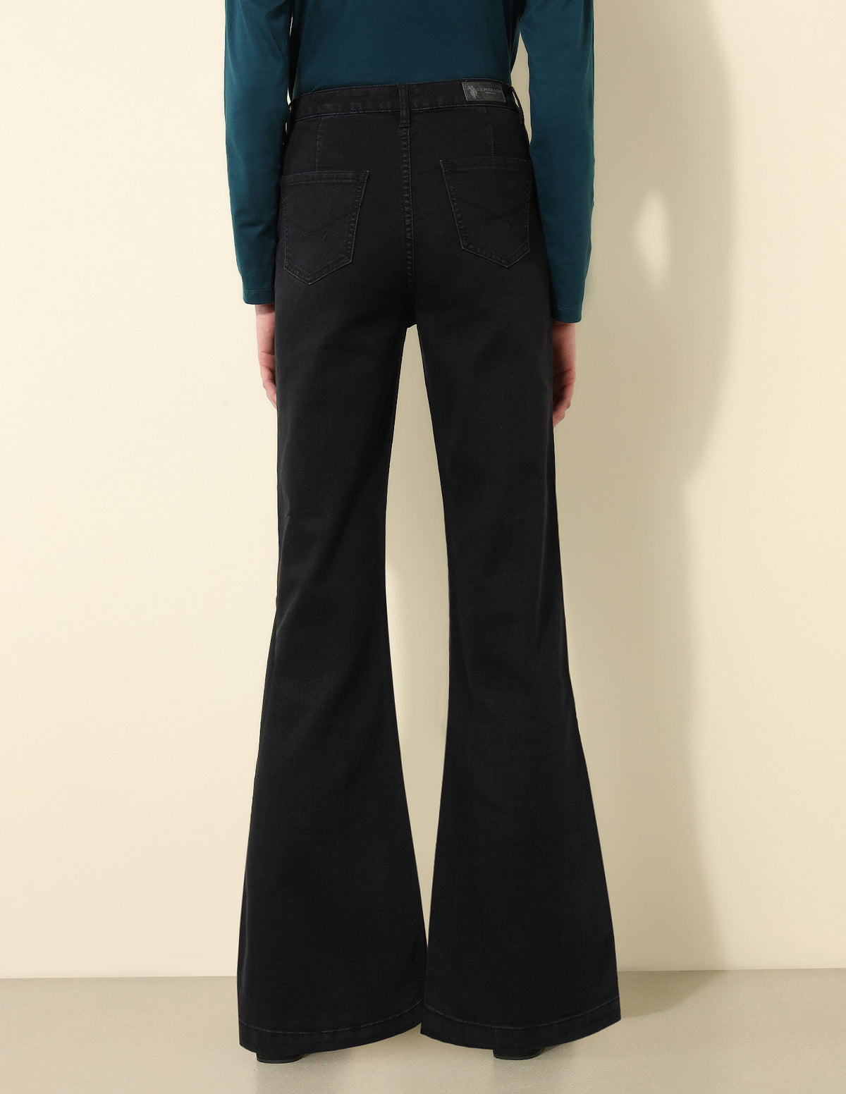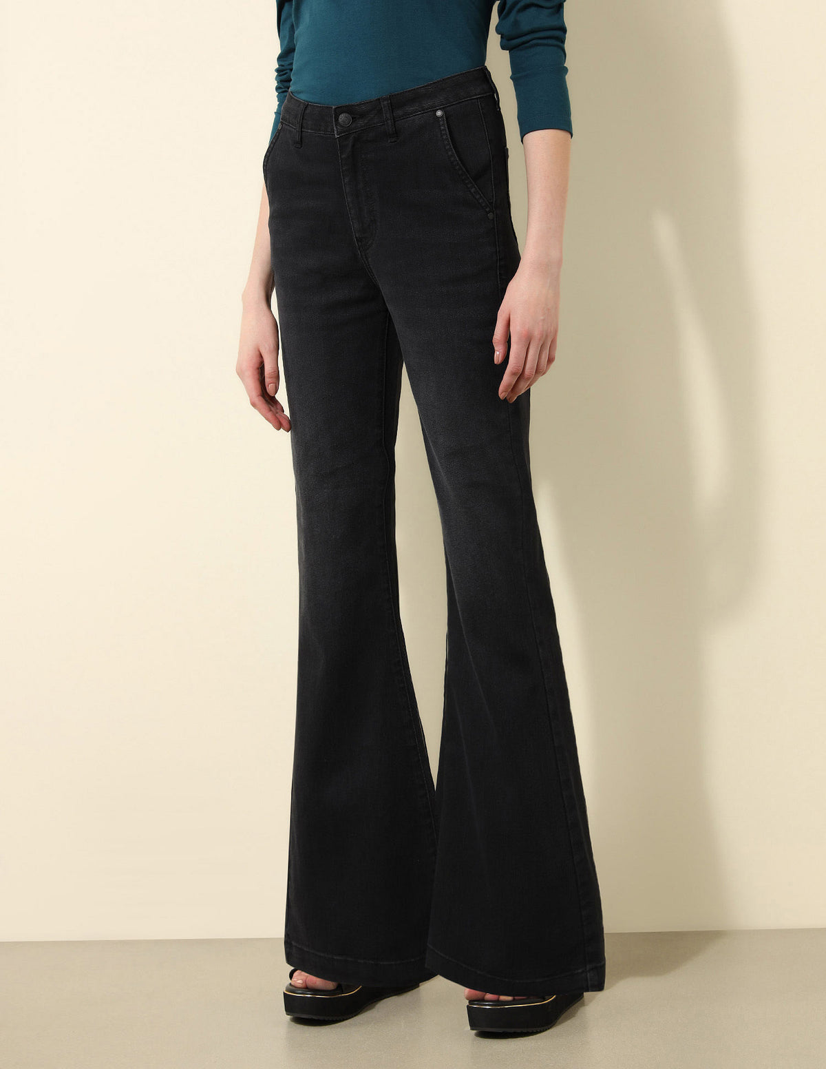 | High-rise waist | Button and zip fly closure | Five pockets | Dark wash | Denim weave | Flared fit |